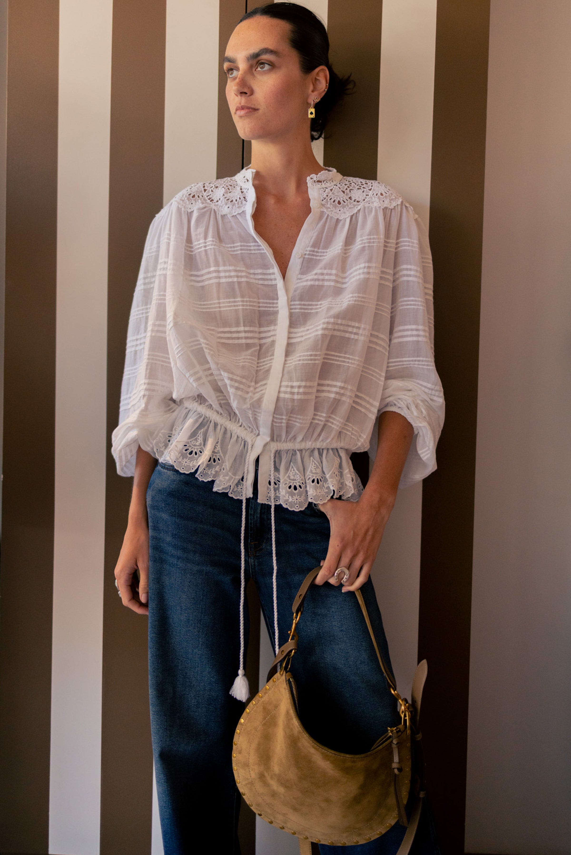 Oskan Soft Zip Shoulder Strap Bag in luxurious suede calfskin leather. Versatile carry options include hand, shoulder, or crossbody styling with a removable 34 cm handle. Features adjustable studded shoulder strap, braided leather trim, dual zippers with leather sliders, and signature Isabel Marant branding. Gold-finish hardware and twill lining complete this refined piece.