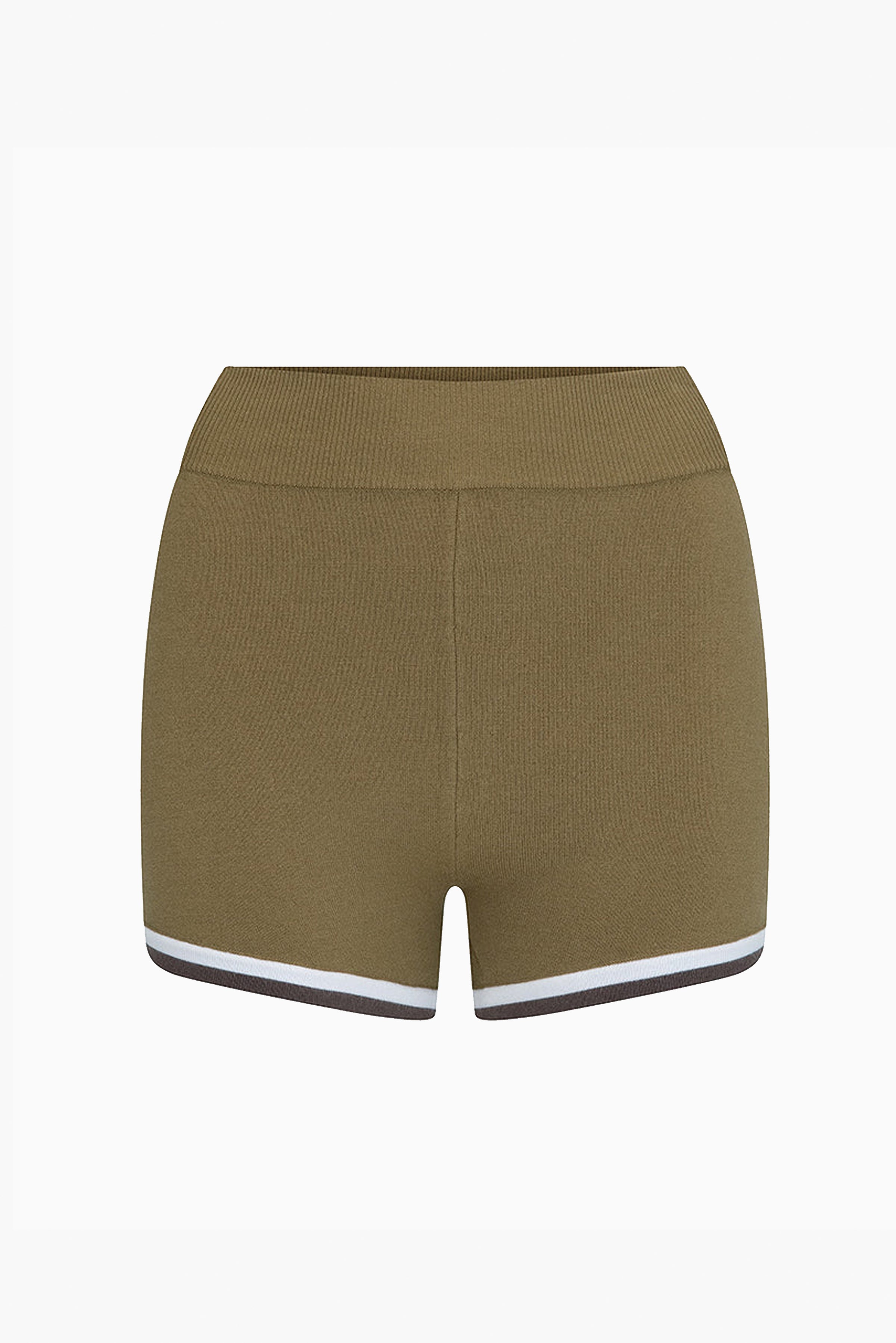 Superfine Merino Wool blend knitted mini shorts with rib waistband. Features colourblock striped panels at side seam and bottom hem. This garment is fully fashioned/engineered to shape, meaning there is minimal yarn wastage during the production process.