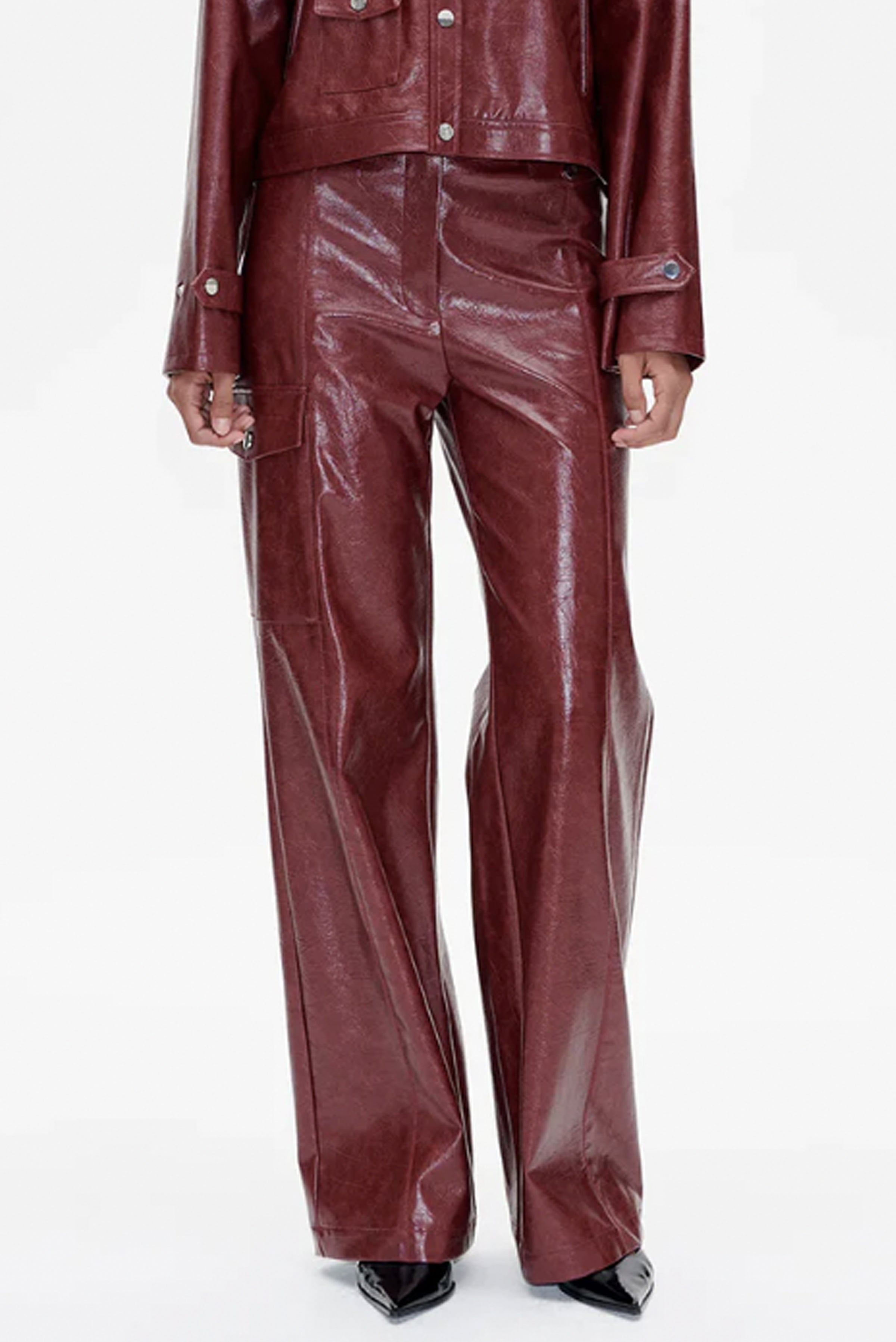 These high-rise, faux leather trousers feature a zip fly with a button closure and wide legs. There are two patch pockets on the sides and two flap pockets on the back.