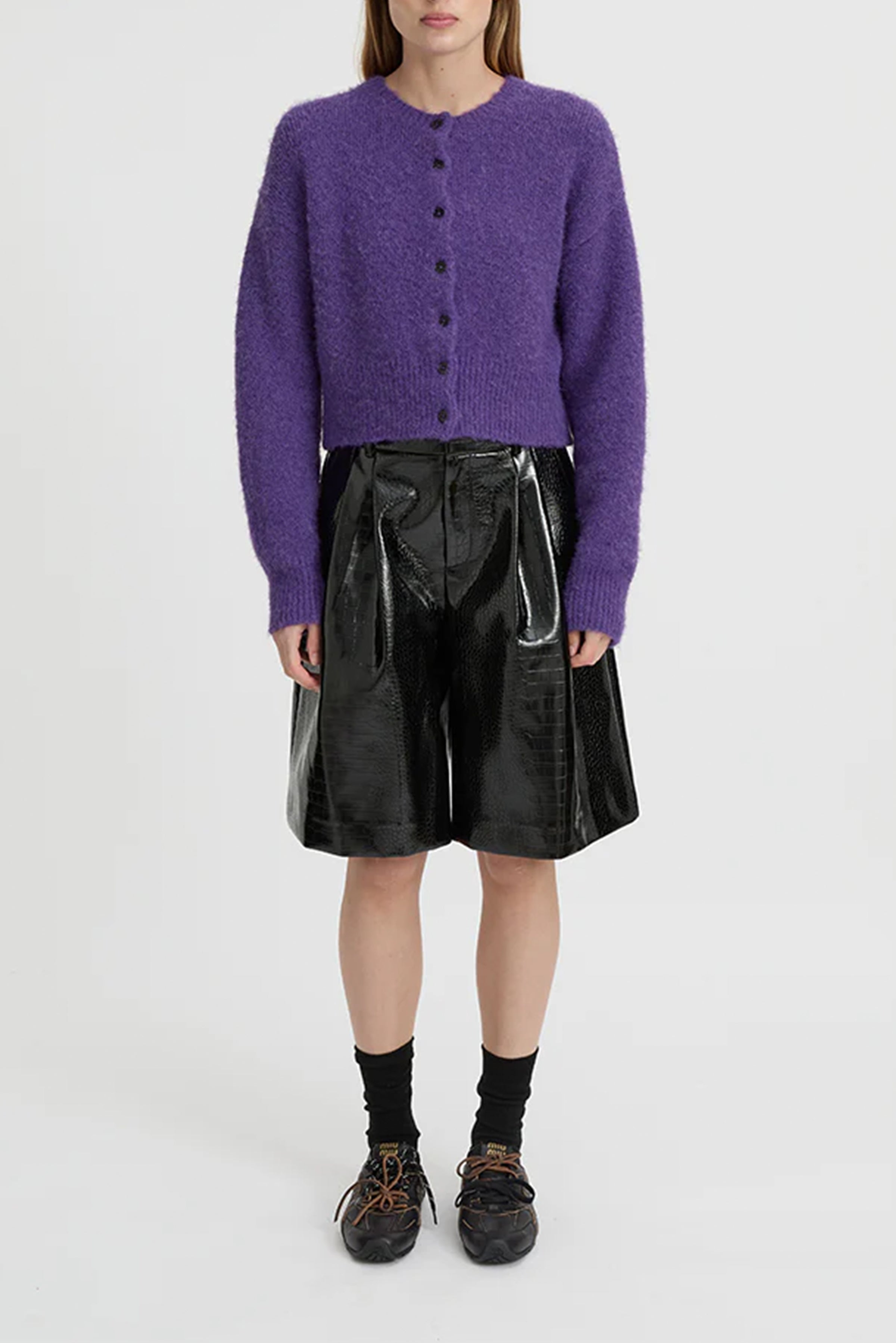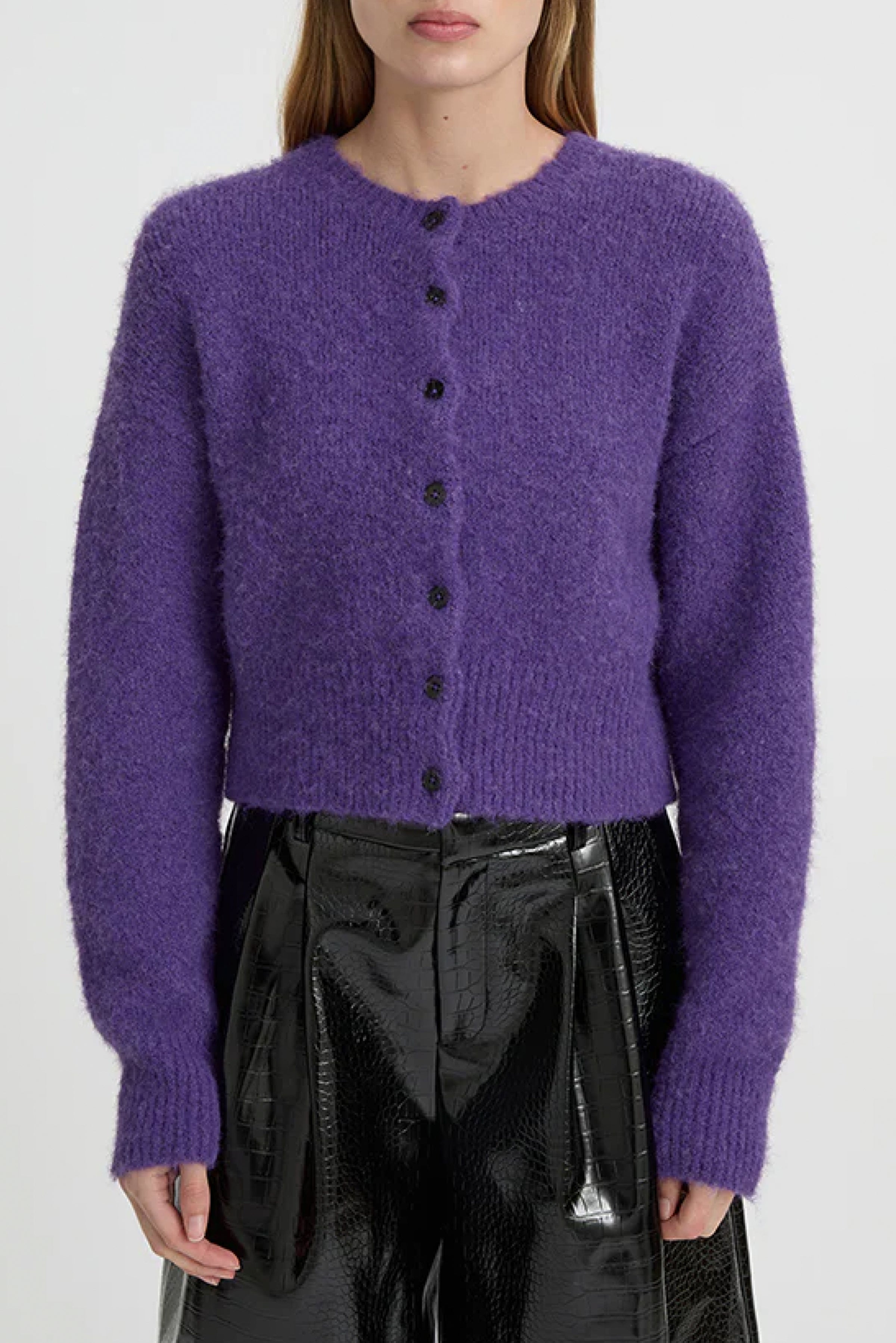 The Marlo Cardigan in vibrant purple offers a soft, cozy knit with a relaxed, slightly cropped fit.