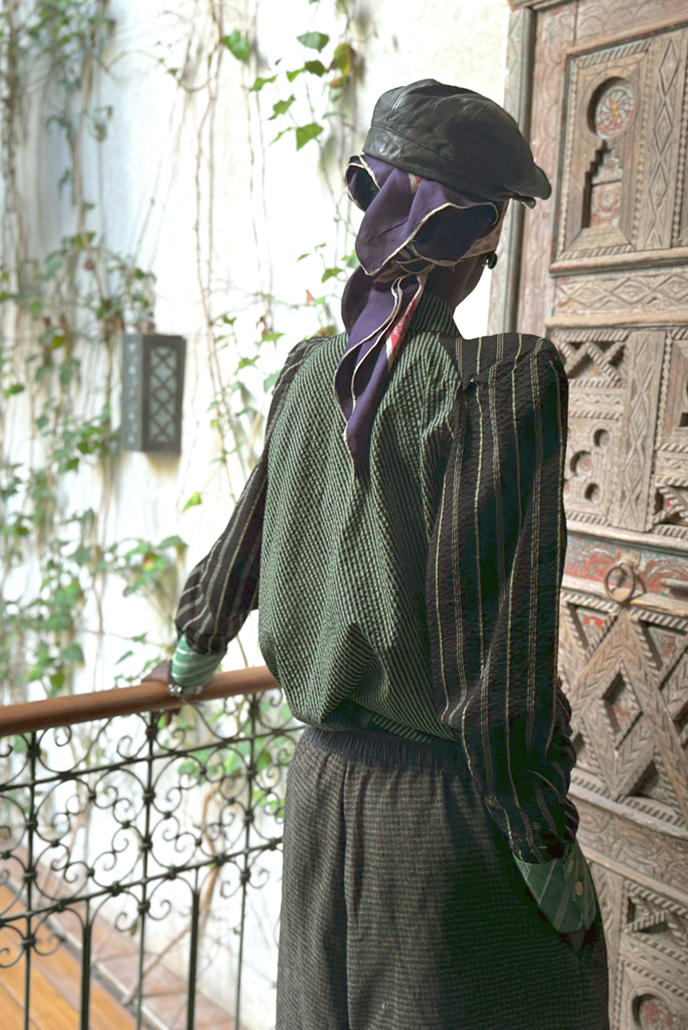 This blouse features puffed shoulder sleeves with contrasting colors on the arms, body, and cuffs, finished with elegant gold buttons.