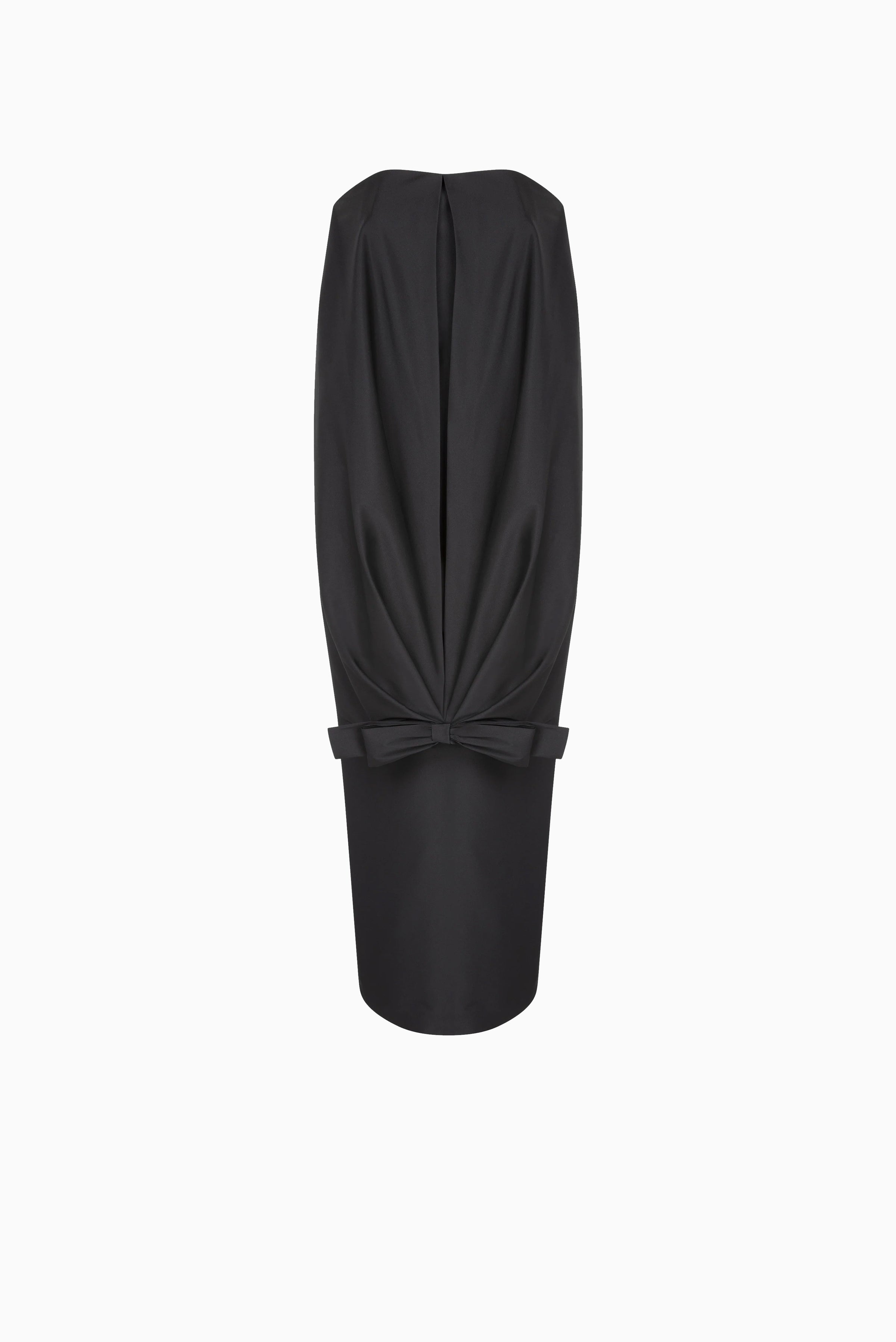 The Mary-Kate bustier dress features a fitted shape with a classic bow above the knees. It flows into a long, sweeping skirt, blending structure with softness.