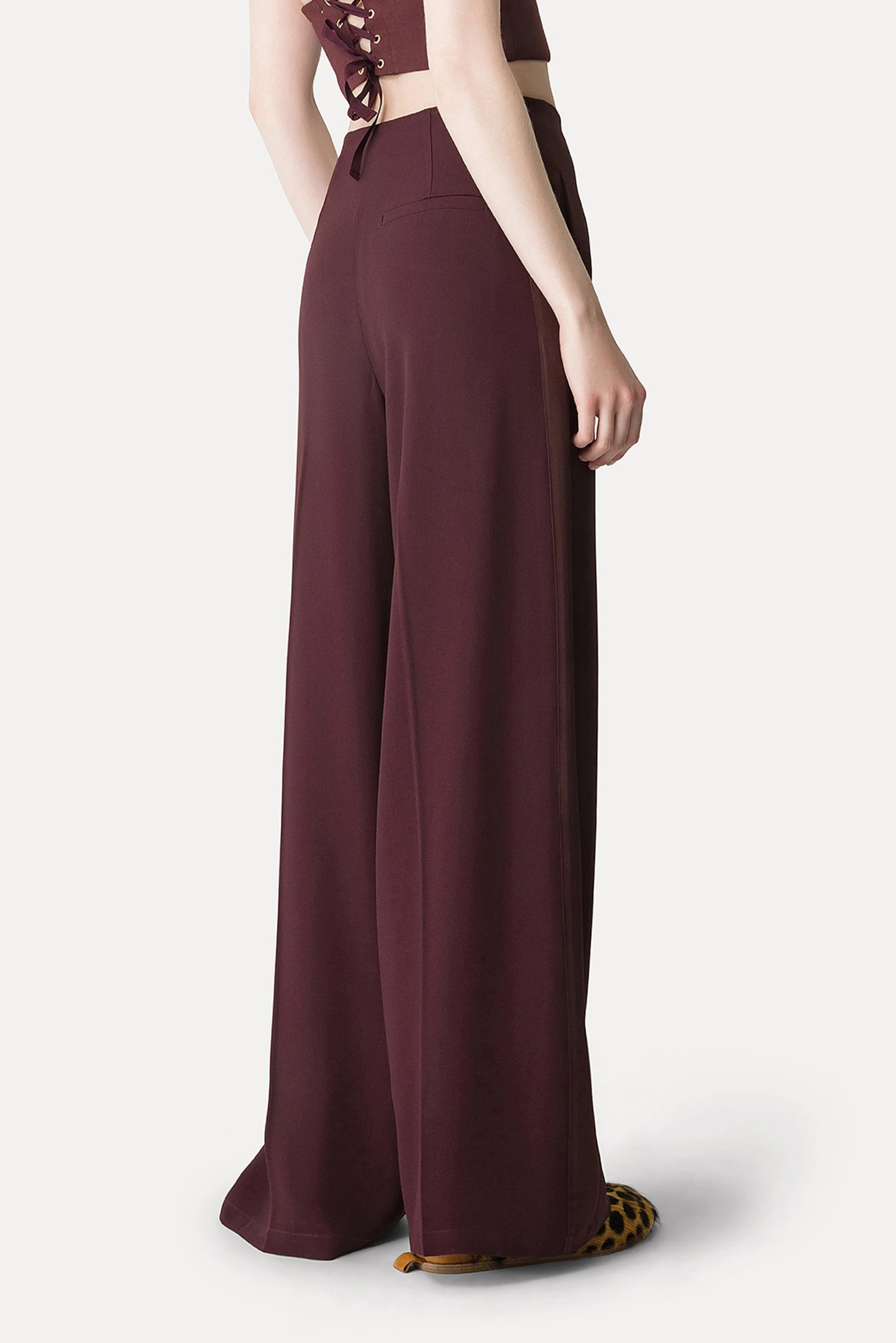 These satin palazzo pants feature a high-rise fit and wide leg for a flattering silhouette. The shiny satin side band and pressed crease add refined detail, combining elegance with a polished finish.