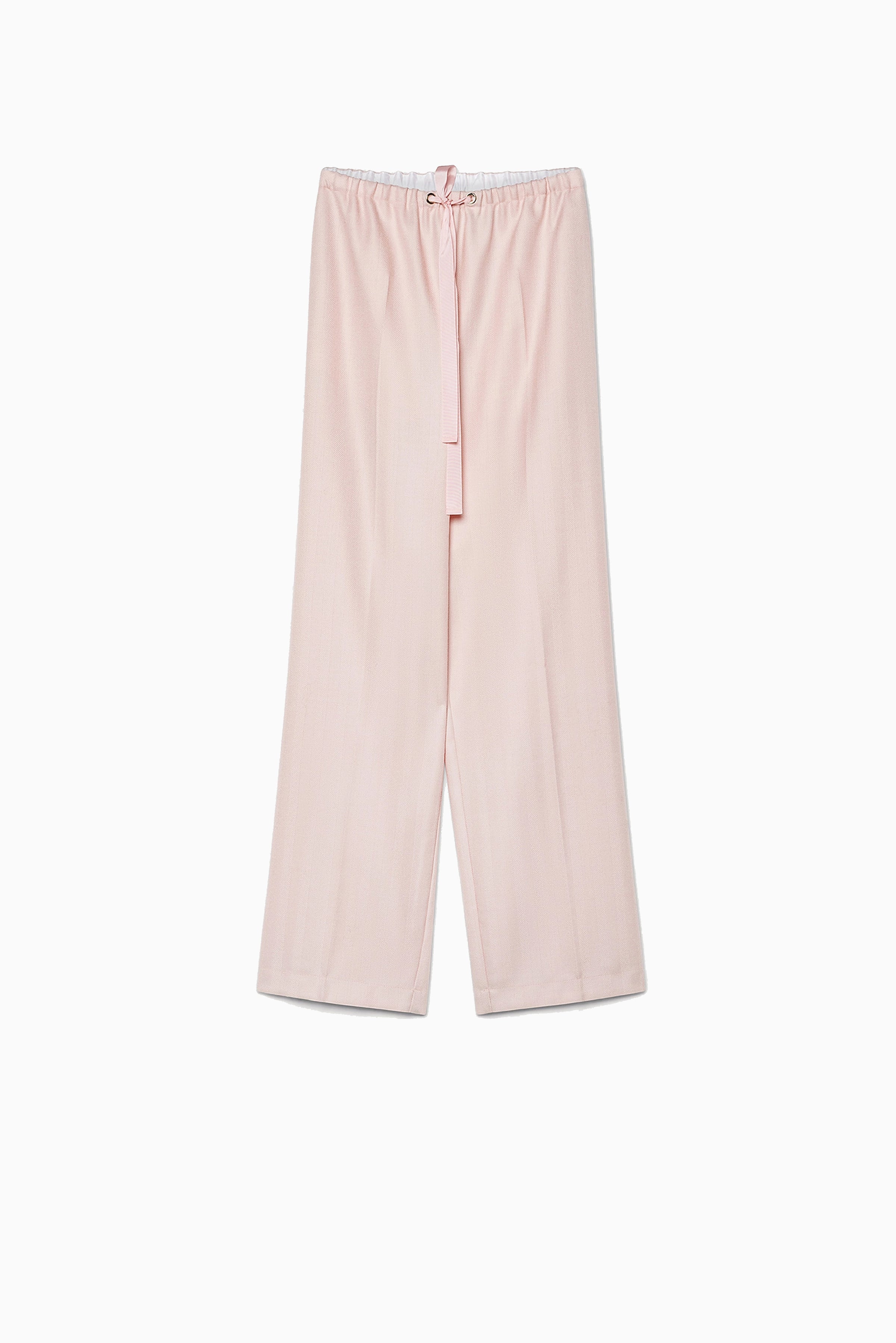 These pure wool drawstring trousers feature a high waist with elastic casing for comfort, soft drape, and feminine hues. Finished with grosgrain trim and metal eyelets, they combine relaxed style with refined details.