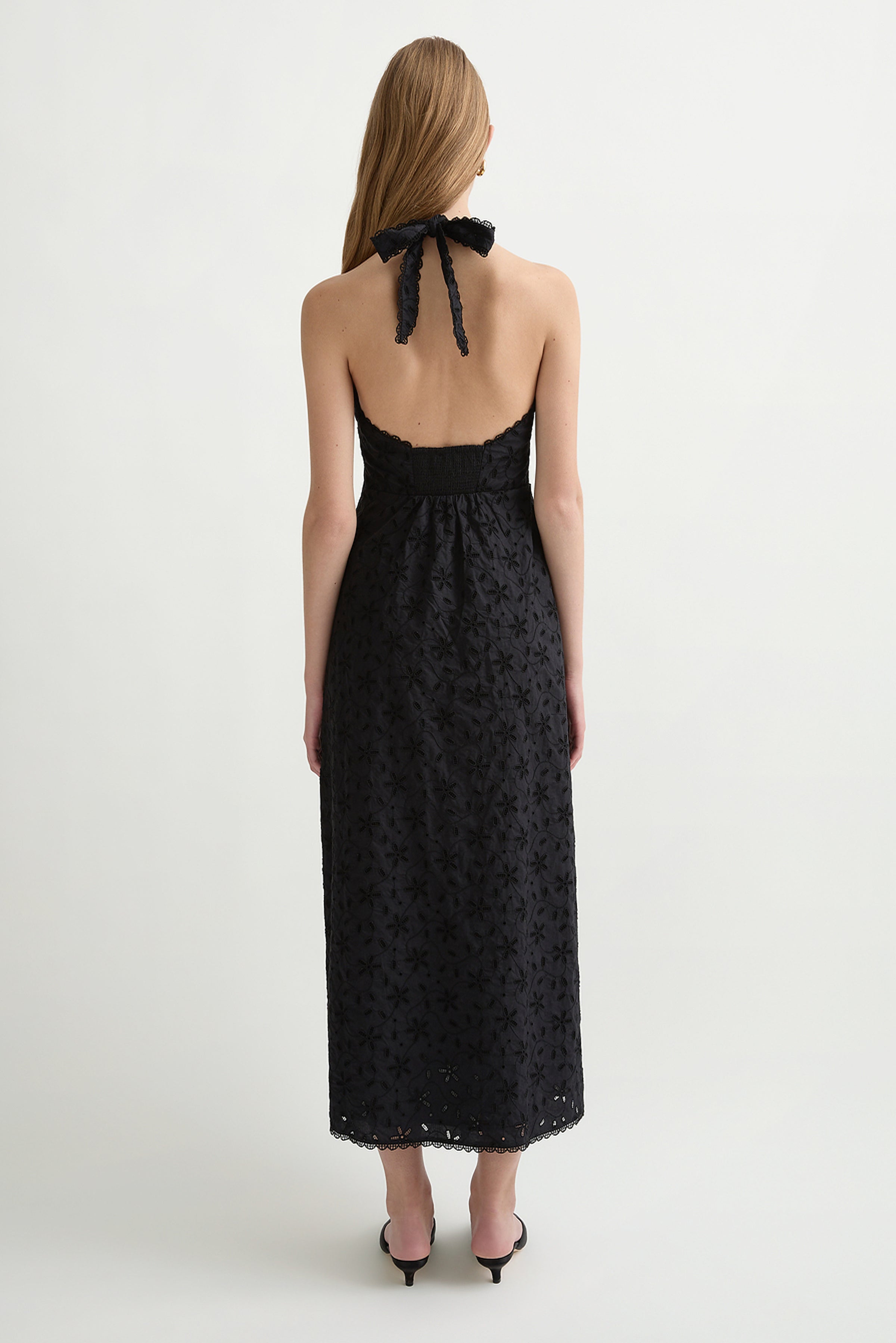 The Salma Dress is crafted from embroidered cotton with delicate lace trim detailing. It features a halter neck tie, shirred back bodice, and a soft, flowing midi-length skirt.