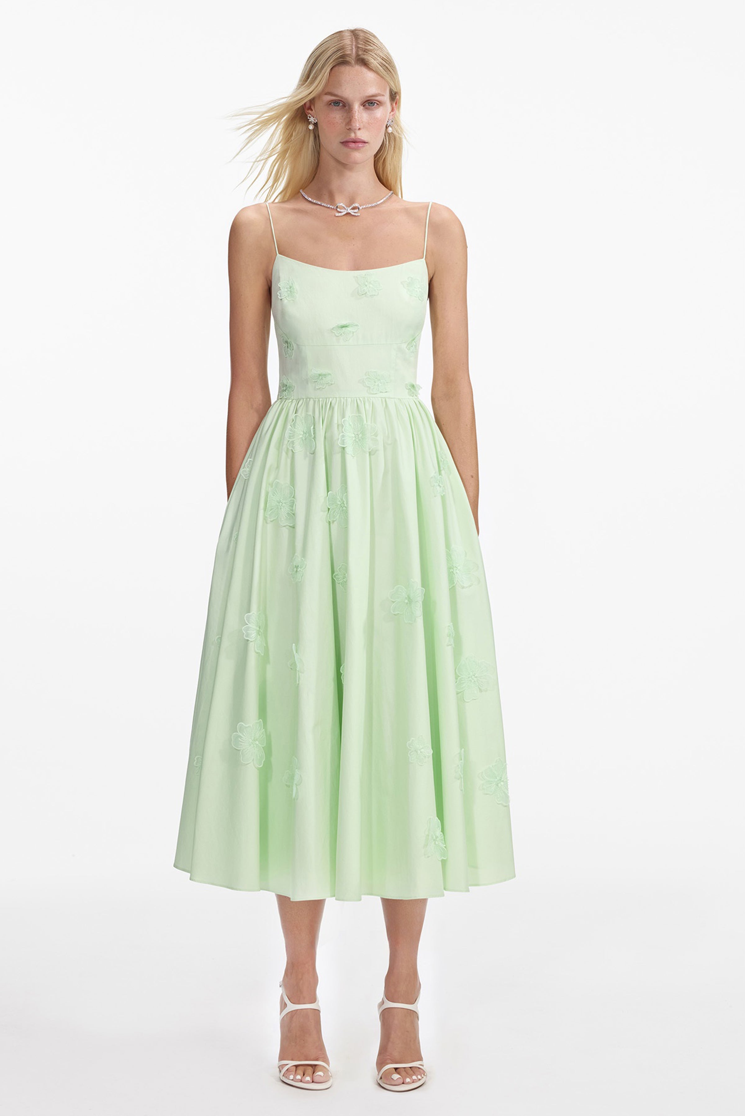 Elegant midi silhouette featuring dimensional floral embellishments and a structured bodice, suspended by delicate spaghetti straps. This refined piece combines sophisticated tailoring with textural botanical detailing, creating a versatile option for elevated occasions or refined everyday wear.