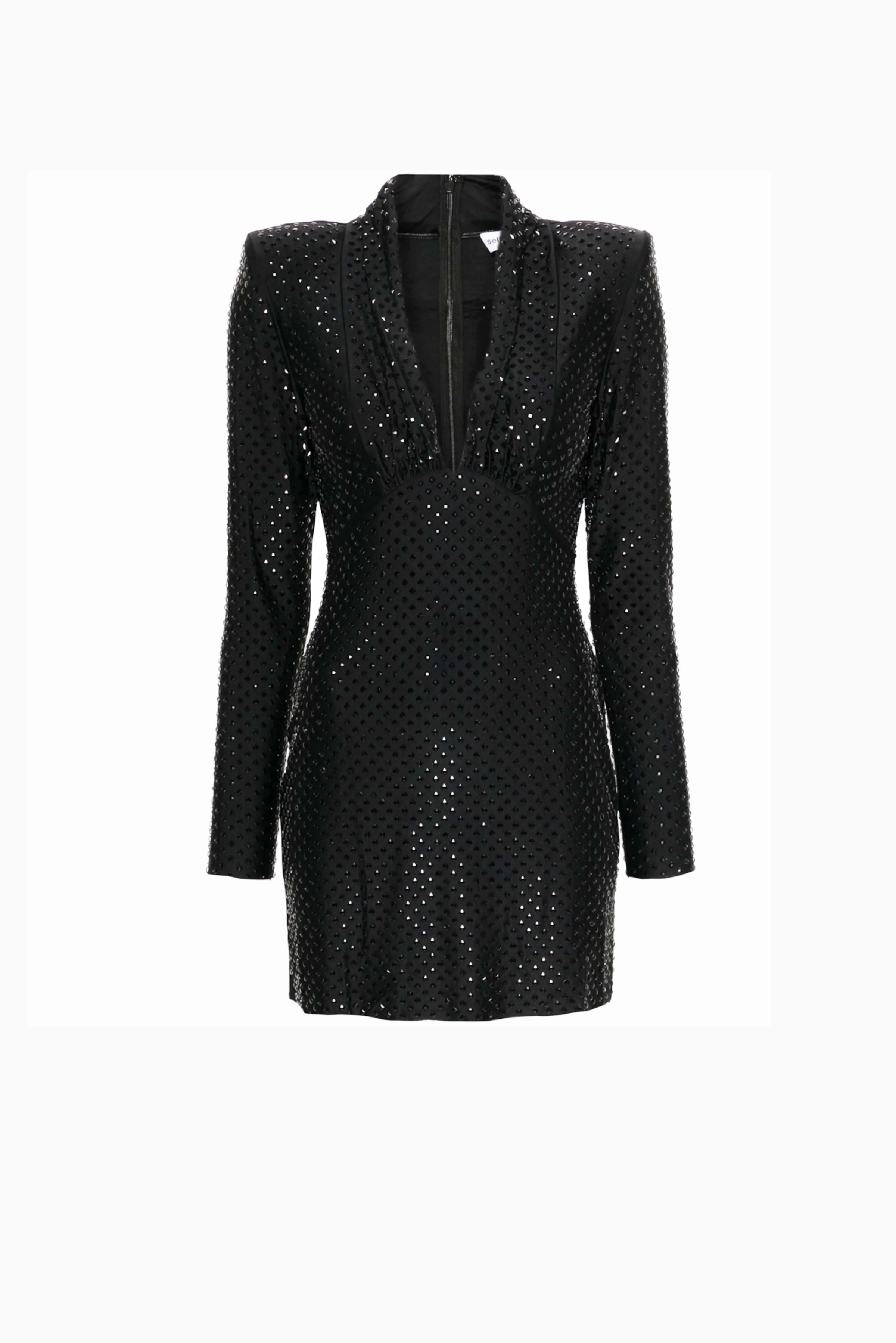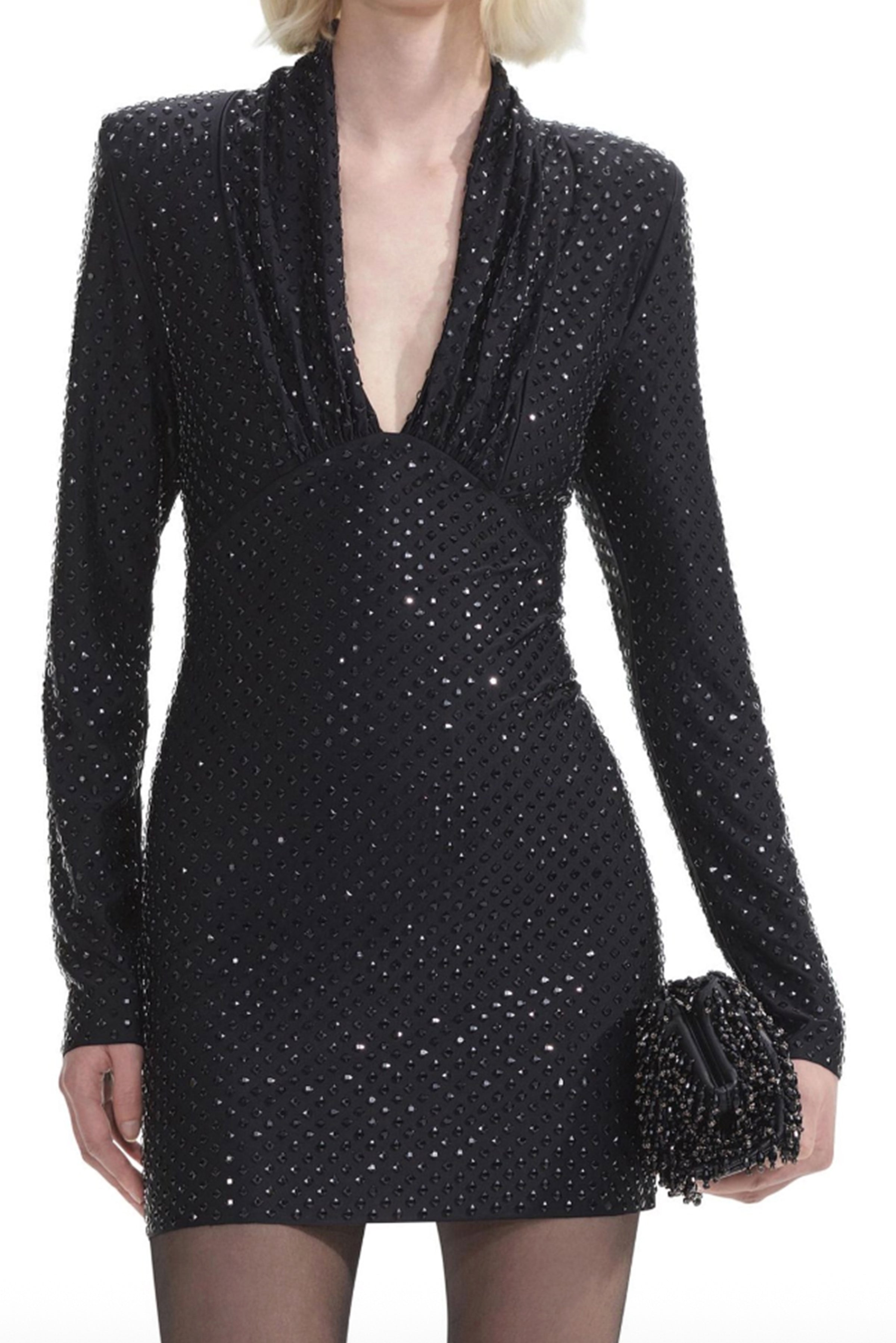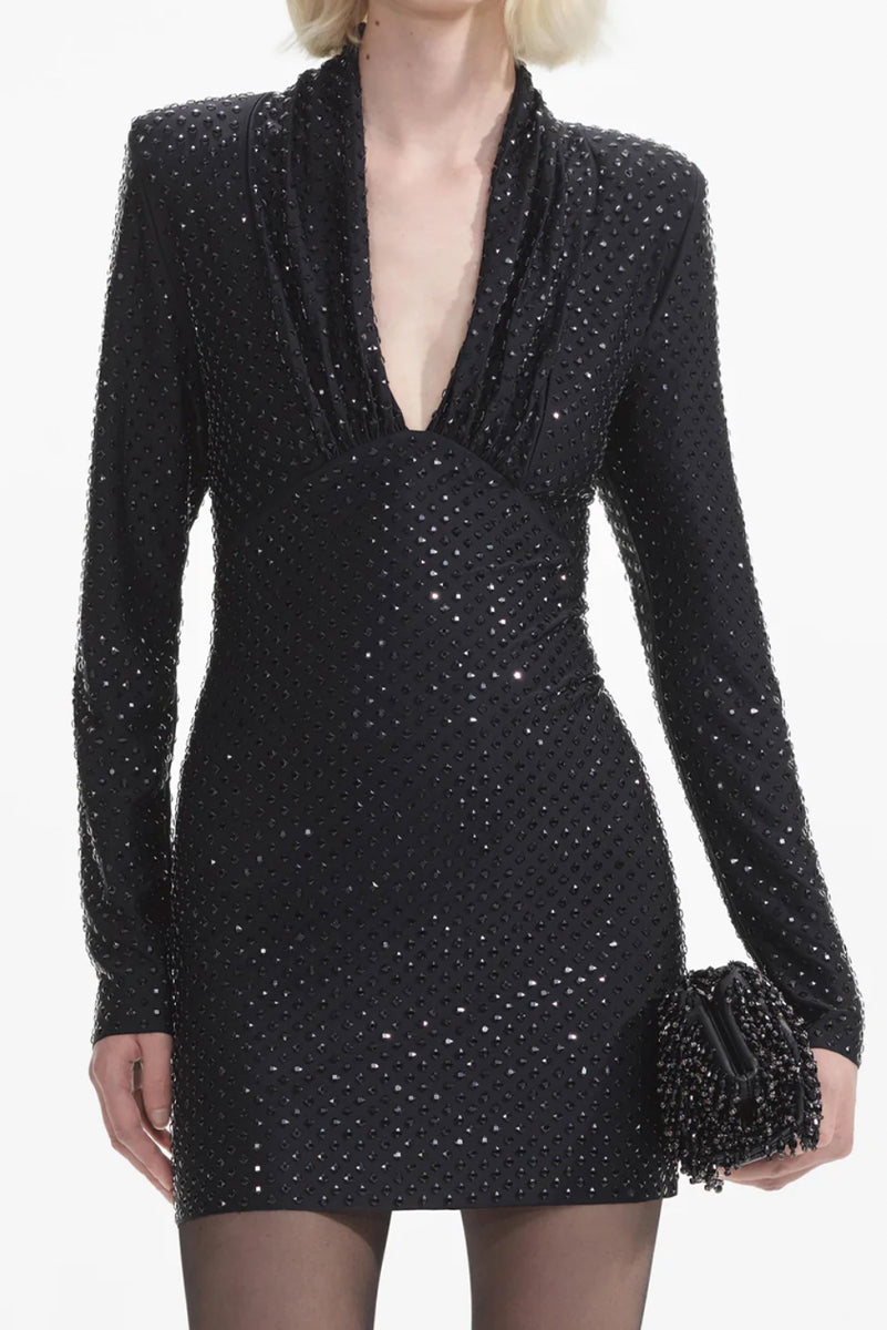 The Self-Portrait Black Jersey Rhinestone Mini Dress is a glamorous addition to any wardrobe. This stunning dress is crafted from rhinestone-studded jersey fabric, offering a high-shine finish perfect for a night out or special event. With a plunging neckline and a figure-skimming A-line silhouette, it is designed to accentuate your curves beautifully. The dress features a zip closure at the back and is fully lined for comfort. It also includes removable shoulder pads for added style. Pair it with your favorite heels and a chic clutch for an unforgettable look.