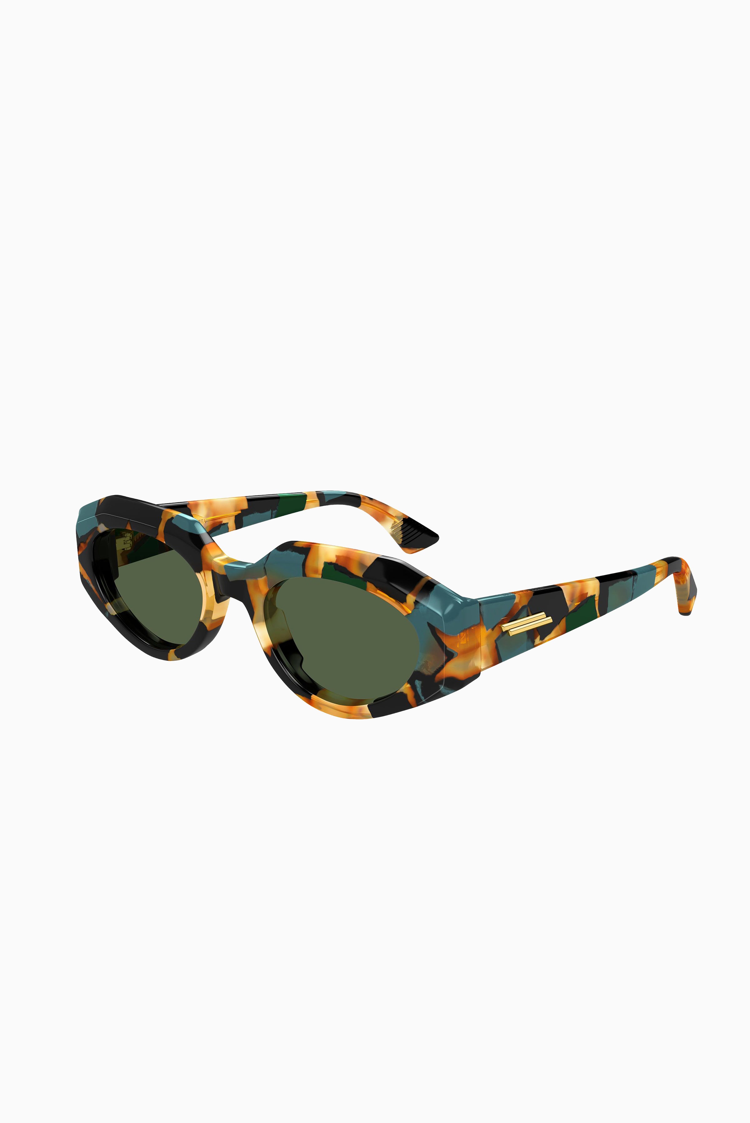 Crafted with a distinct style, these Bottega Veneta sunglasses present a round silhouette with a bold, expressive front. The medium-sized frame is accented with refined geometric details and subtle gold-toned hardware on the temples.