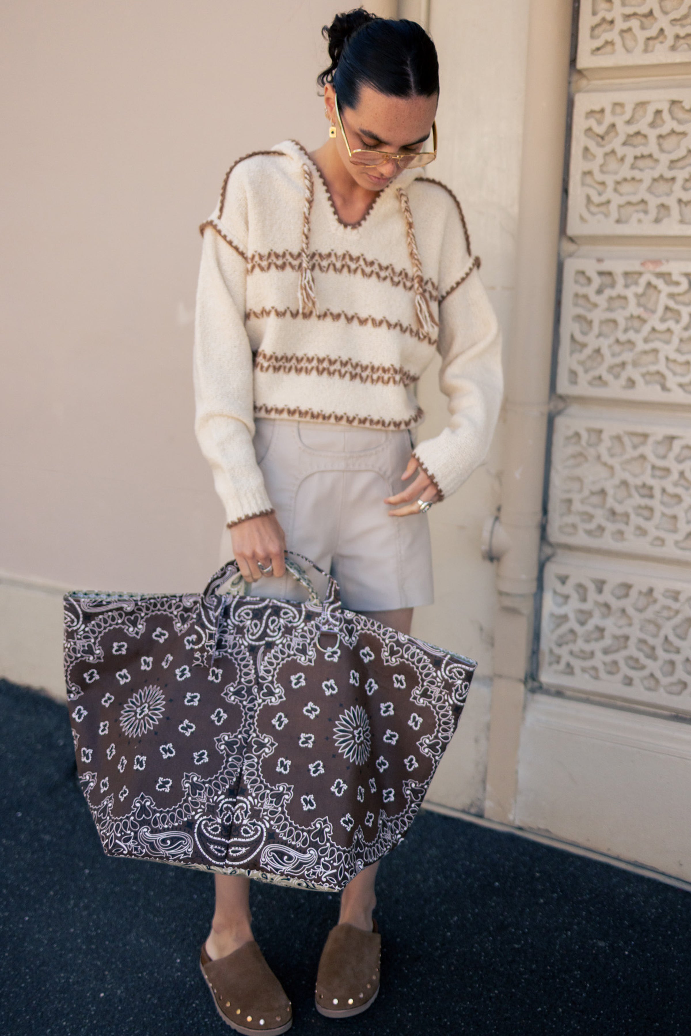 Length of handles: 23cm for the small handle and 59cm for the large handle. Dimensions: W 72 x H 42 x D 36 cm / W 28,3 x H 16,5 x D 14,17 inches Two rings for hanging a shoulder strap or gray-gray bags Large zipper Large inside pocket Also available in mini and medium sizes Composition: 100% cotton Bandanas made in the USA Made in Poland Our bandanas are handcrafted. Dye baths may vary slightly from one production to another.