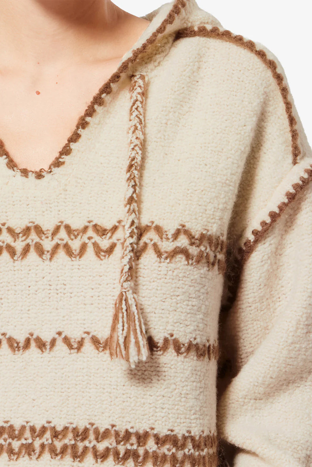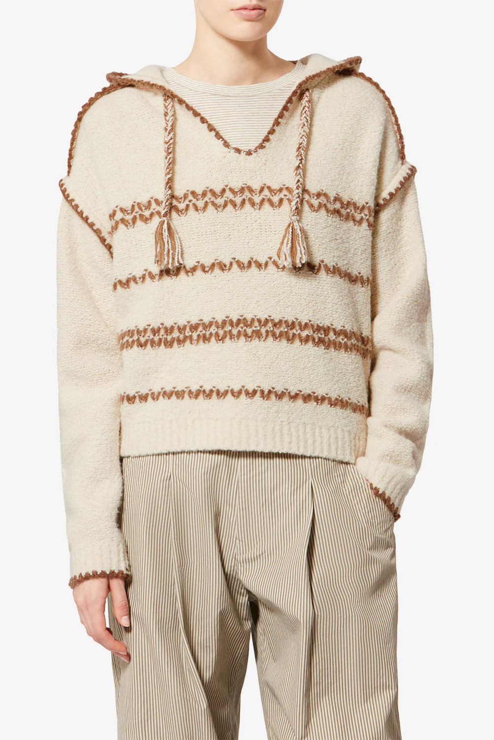 Merino wool tweed pullover with a relaxed fit, dropped armholes, and hooded neckline finished with drawstring and pompoms. Features contrasting ribbon detailing and ribbed trims throughout.