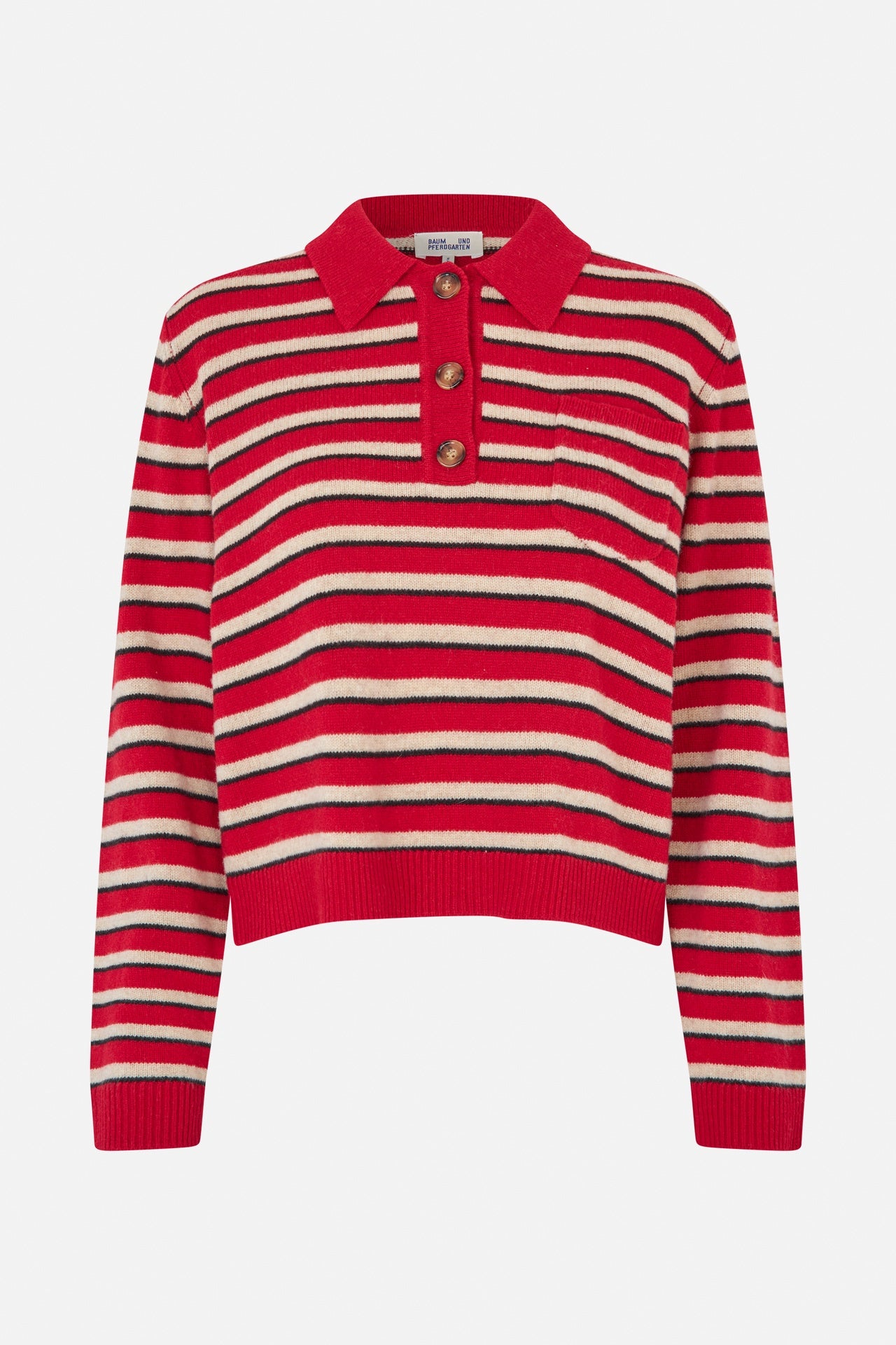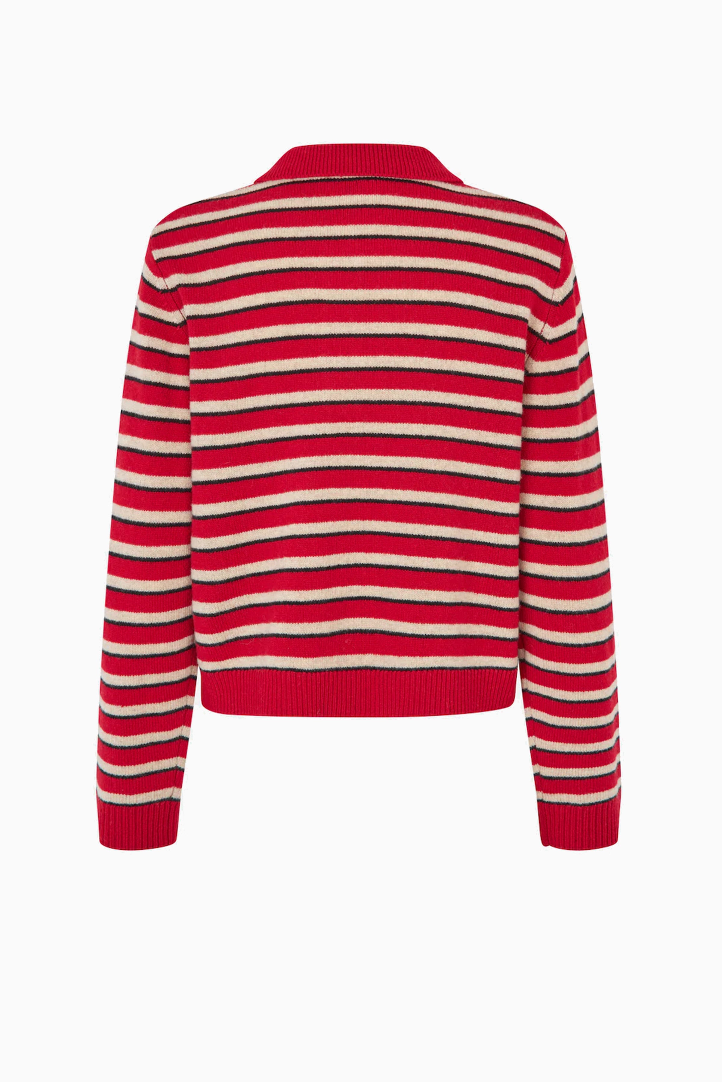 The Cori Knit features a soft merino wool fabric with a relaxed fit and classic polo collar. Its timeless crimson red stripe design makes it ideal for chilly days.