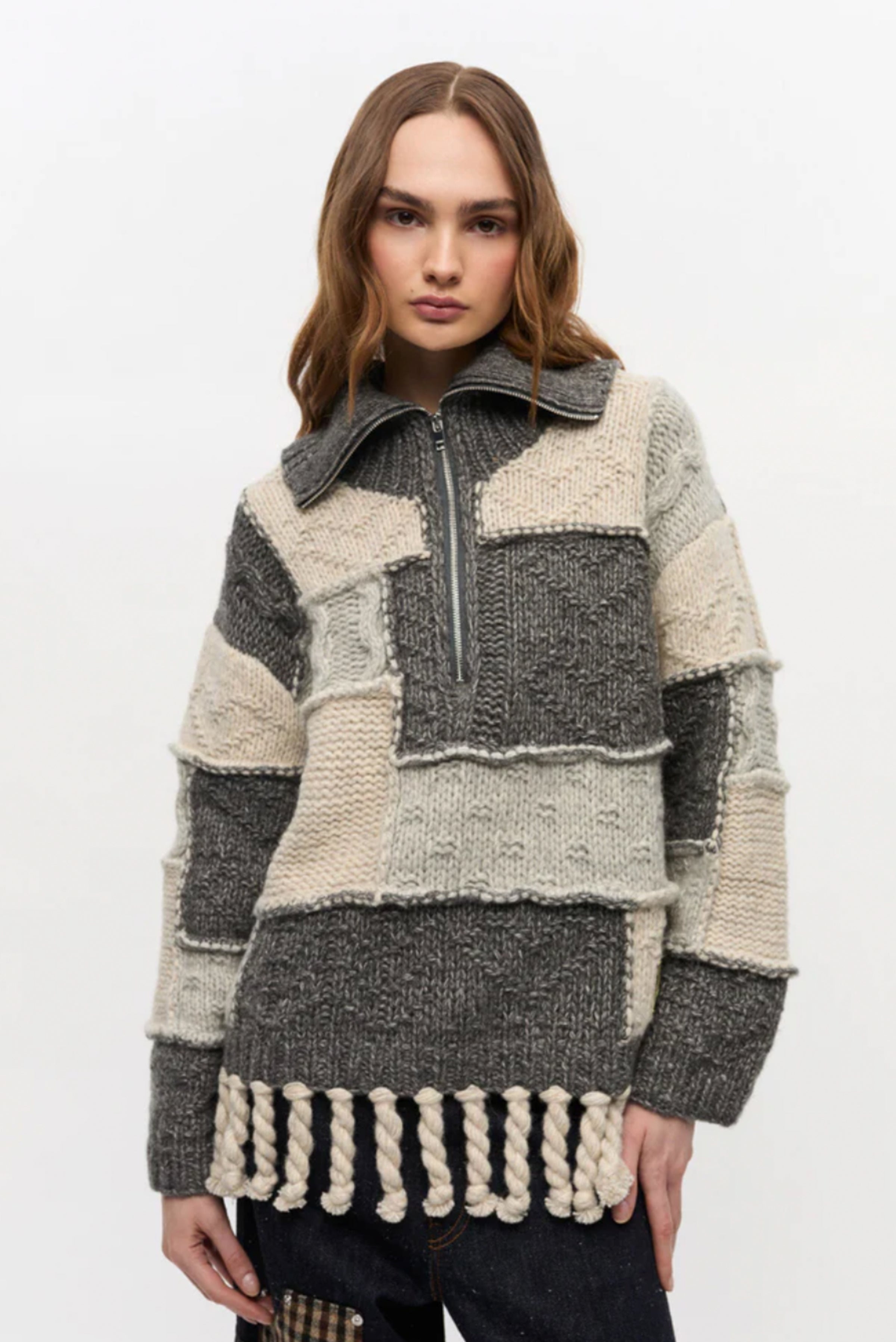 Bring warmth, texture and character into your wardrobe with GANNI's Wool Cotton Bubble Sweater – a celebration of the unconventional and the nostalgic. This knit sweater combines different knitting techniques and color nuances in a harmonious patchwork effect that exudes craftsmanship and personality. The wide, twisted fringes at the bottom give a playful and modern touch, while the high collar and half-zip detail make it both practical and stylish