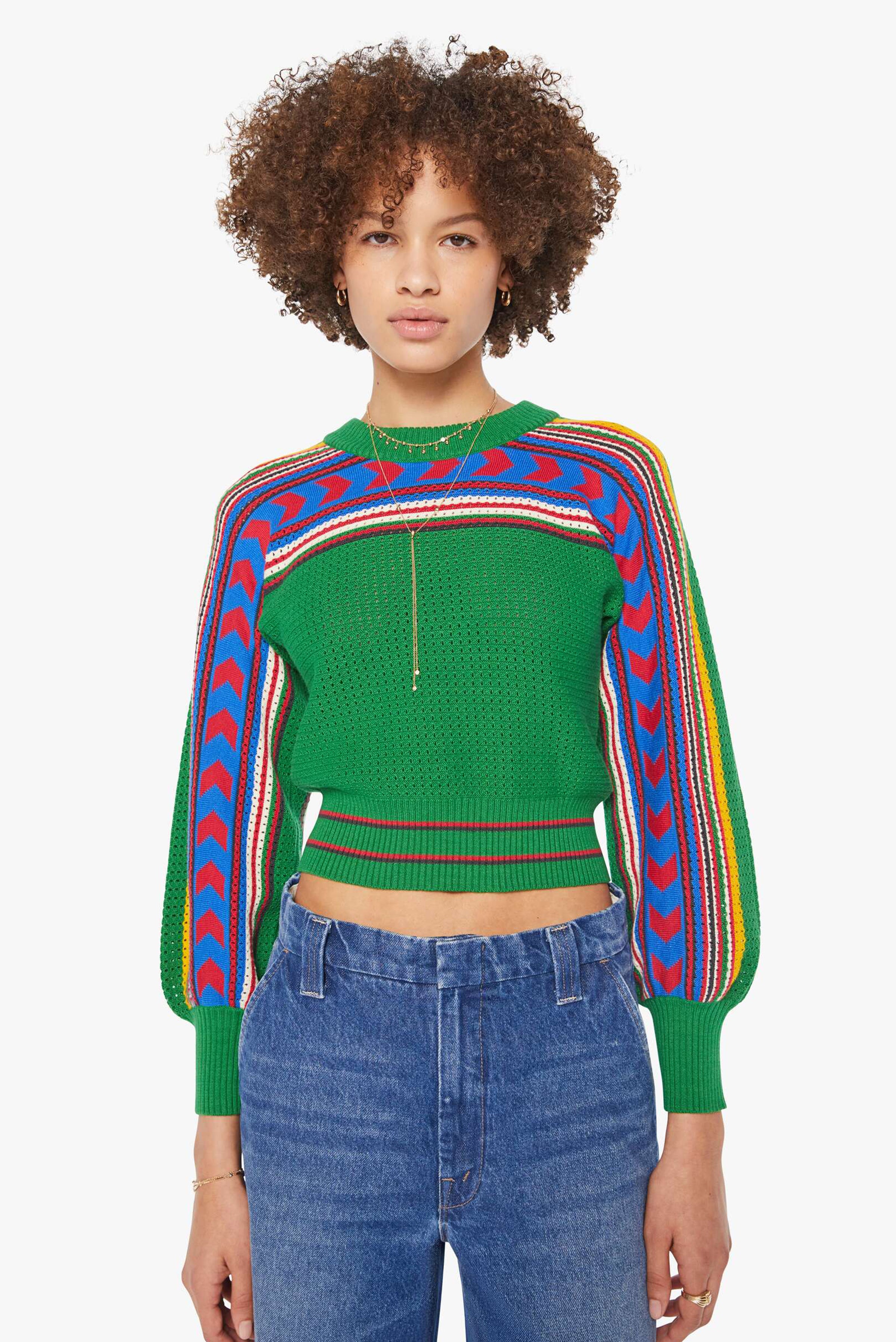 A crewneck raglan sweater with balloon sleeves, ribbed hems and a cropped fit. Made from 100% supima cotton, Off The Track is a vintage green with stripes across the sleeves, chest and hem.