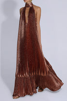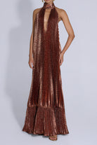 The Libertie Gown captures attention with its sculptural and elegant lines. Designed in a floor-sweeping silhouette, it features a dramatic halter neckline and a plunging keyhole cutout. Crafted from lightweight, pleated fabric that moves with ease, the gown cascades effortlessly from the structured neckline to a soft, flounced hem.