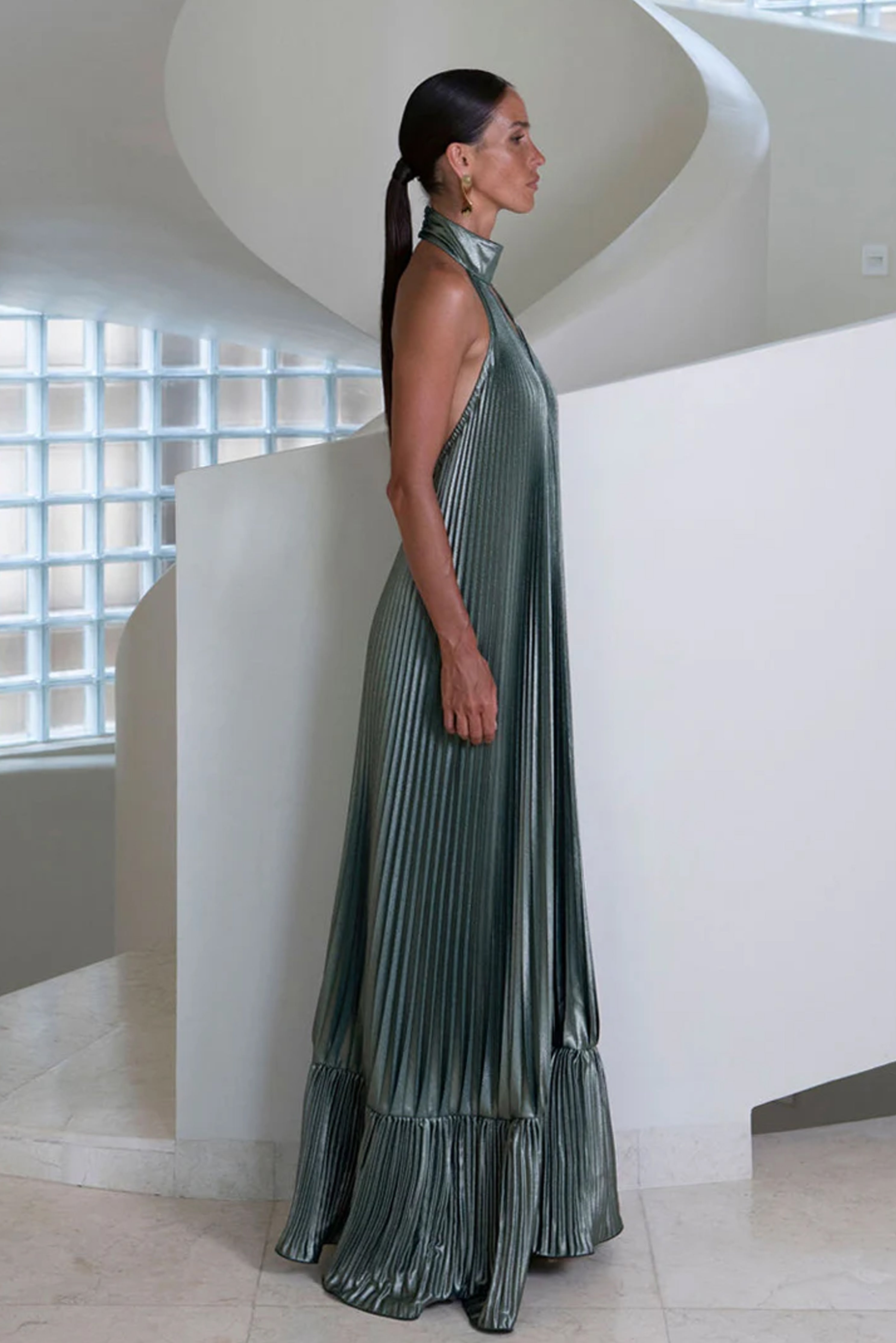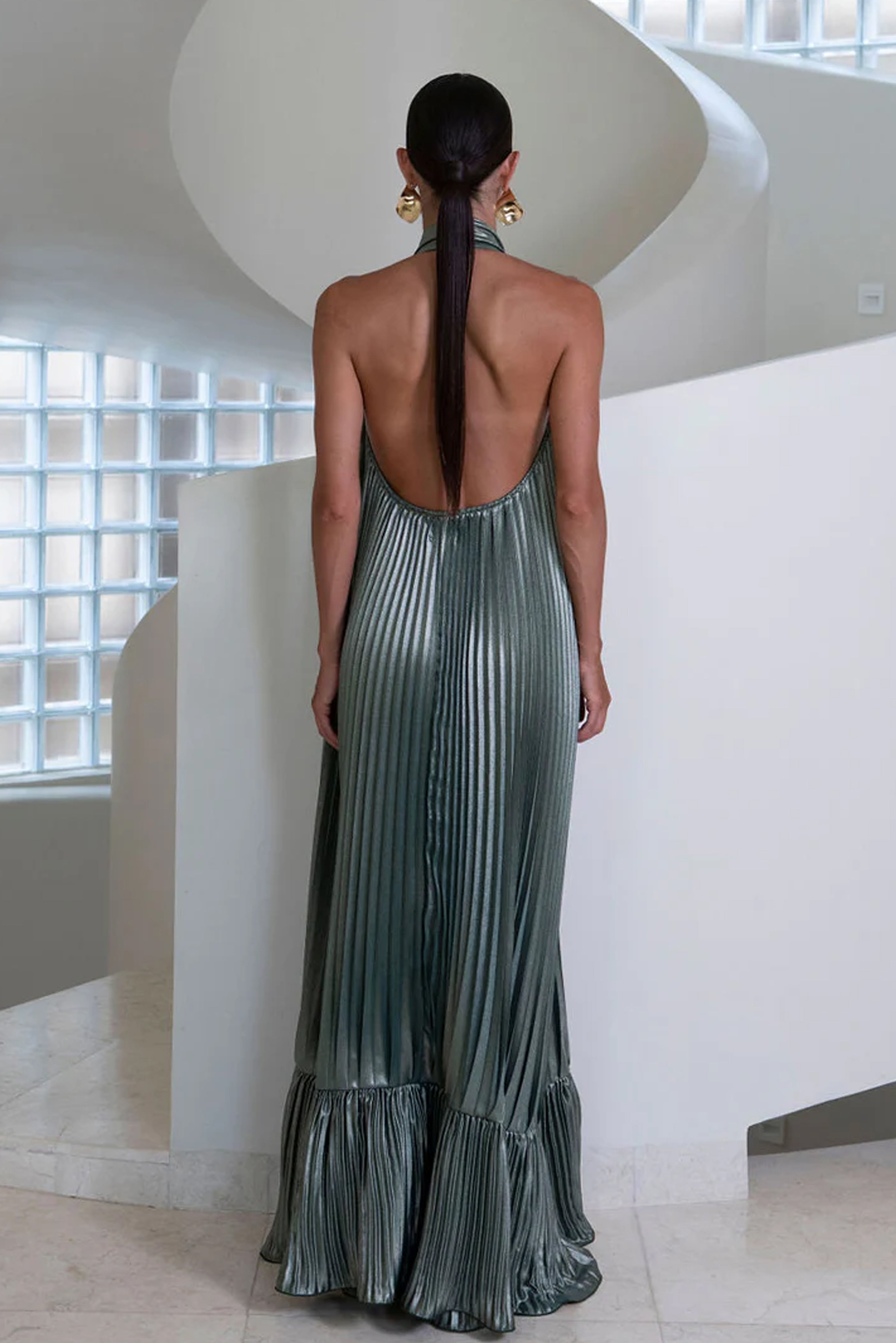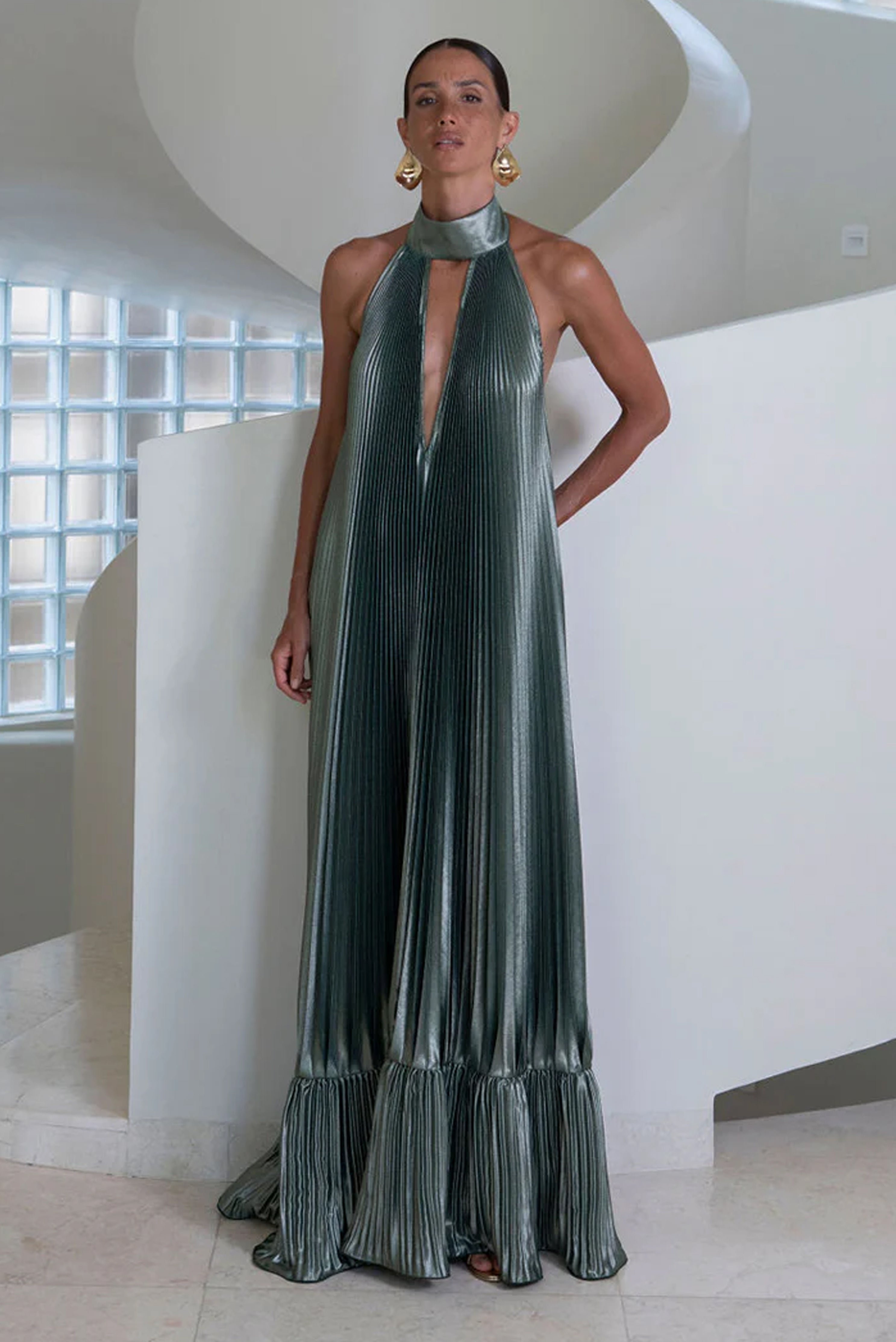 The Libertie Gown captures attention with its sculptural and elegant lines. Designed in a floor-sweeping silhouette, it features a dramatic halter neckline and a plunging keyhole cutout. Crafted from lightweight, pleated fabric that moves with ease, the gown cascades effortlessly from the structured neckline to a soft, flounced hem.