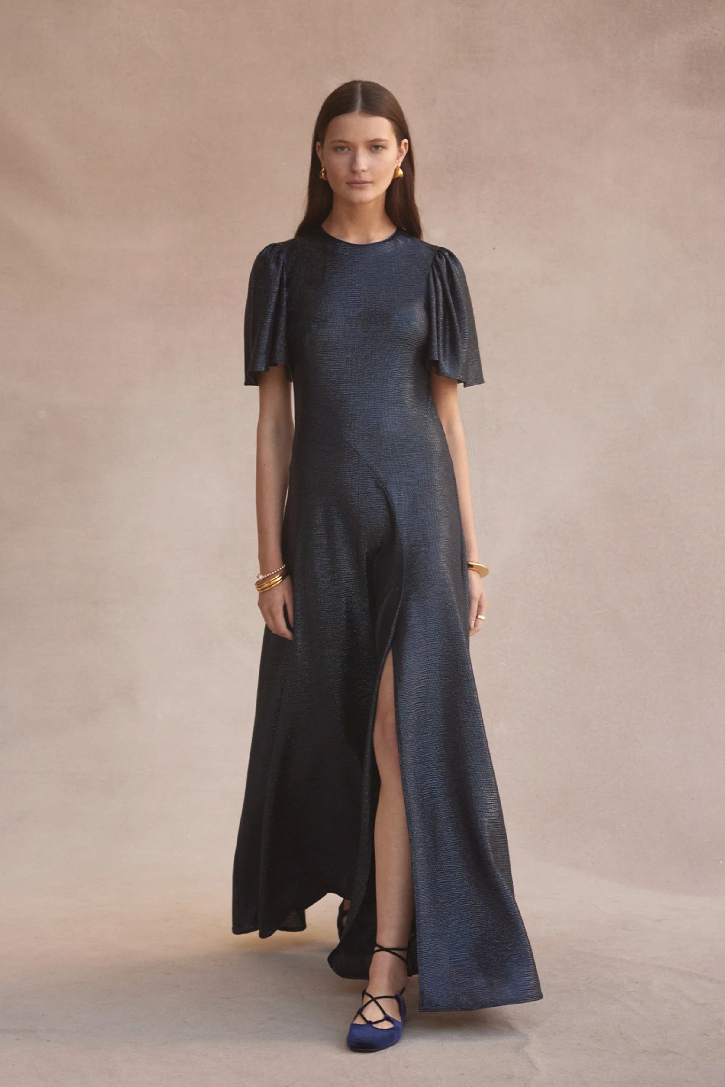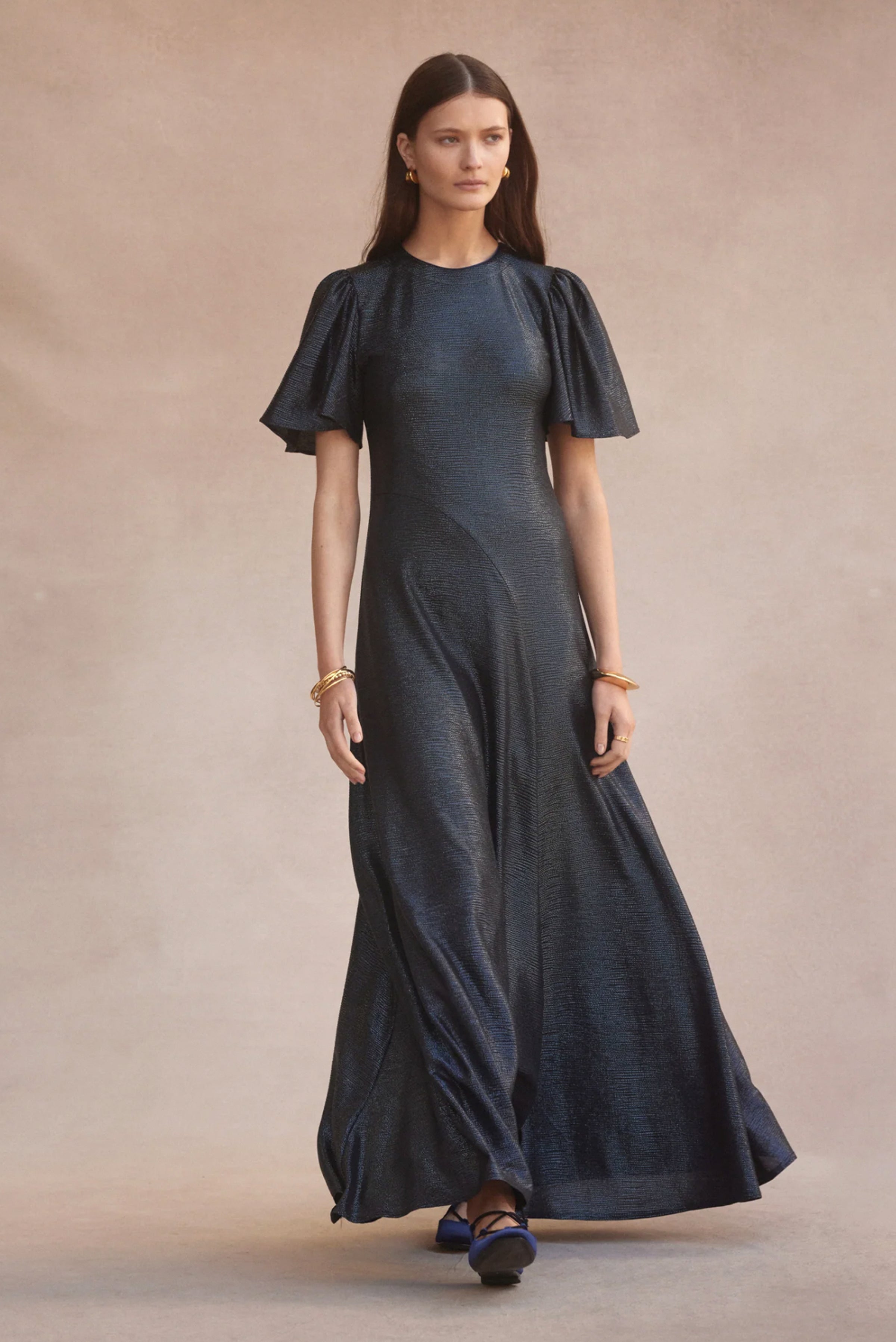 The Fluted Como Maxi Dress in Navy Metallic Shimmer offers a round neckline, flutter sleeves, and a fluted hem. Its front split and soft, stretchy metallic fabric ensure comfort and style, making it an easy-care wardrobe essential for any event.
