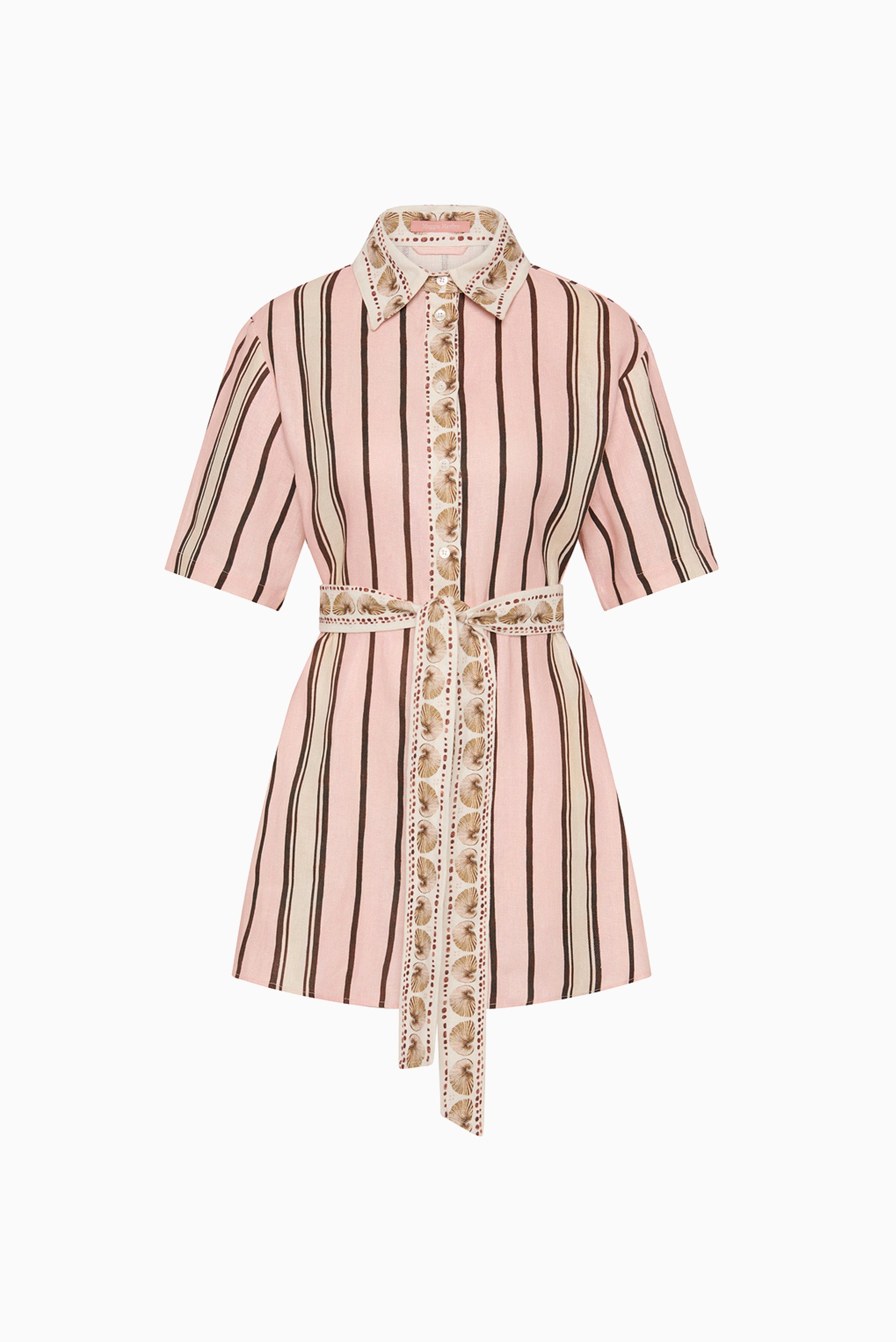 The Just Getting Good Mini Shirt Dress is crafted in linen with our signature stripe print.The dress has a collared neckline, a button-down front and a cinched tie-waist. Designed to wear with your swimwear or the matching Straight Talker Mini Shorts.