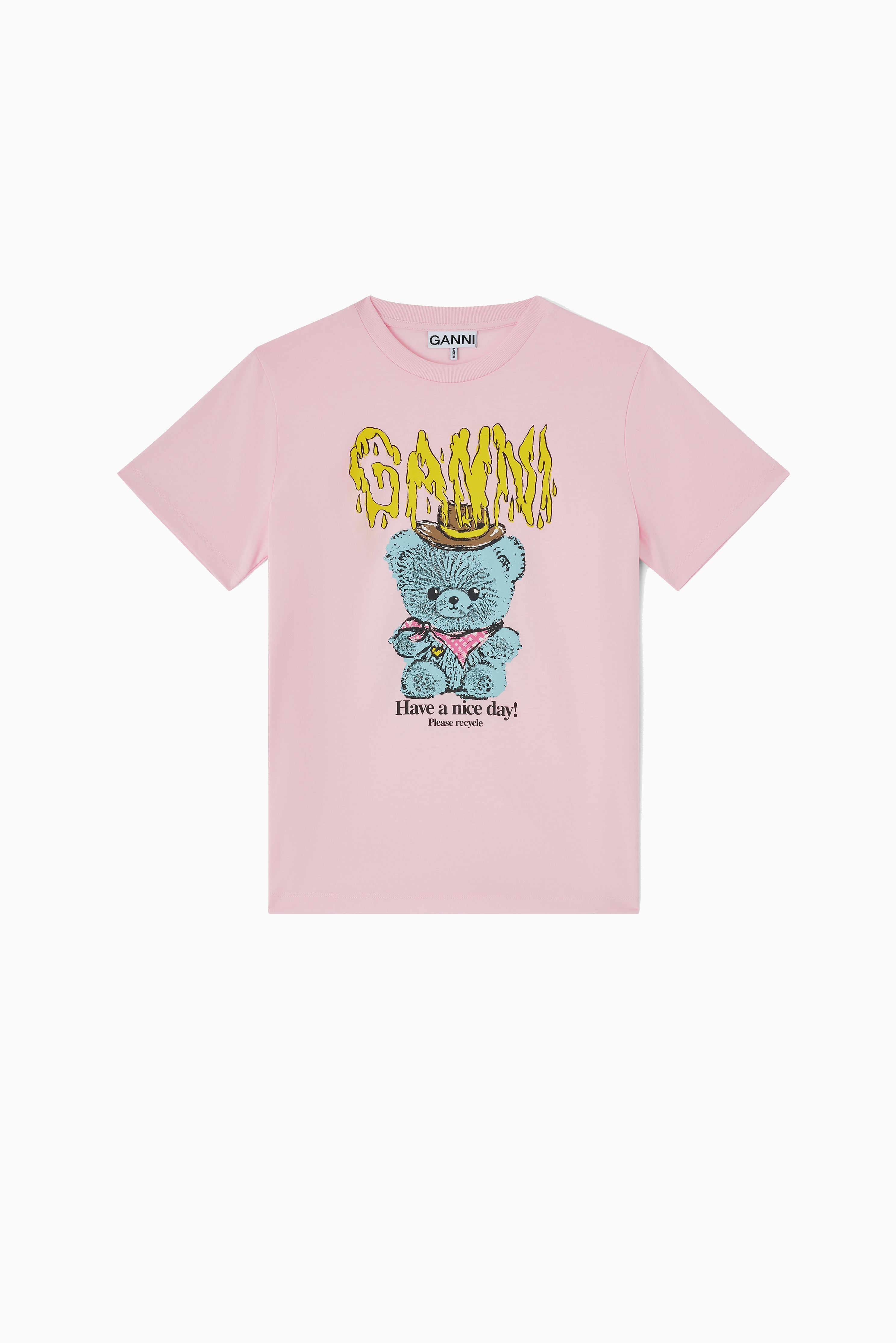 Basic Cotton Jersey T-shirt – Cowboy Bear Print from Ganni is a soft and comfortable t-shirt made from 100% organic cotton. The timeless silhouette is combined with a playful cowboy bear print that gives the t-shirt a unique and modern look. Perfect as a cool everyday piece, equally nice on its own or under knitwear and jackets.