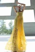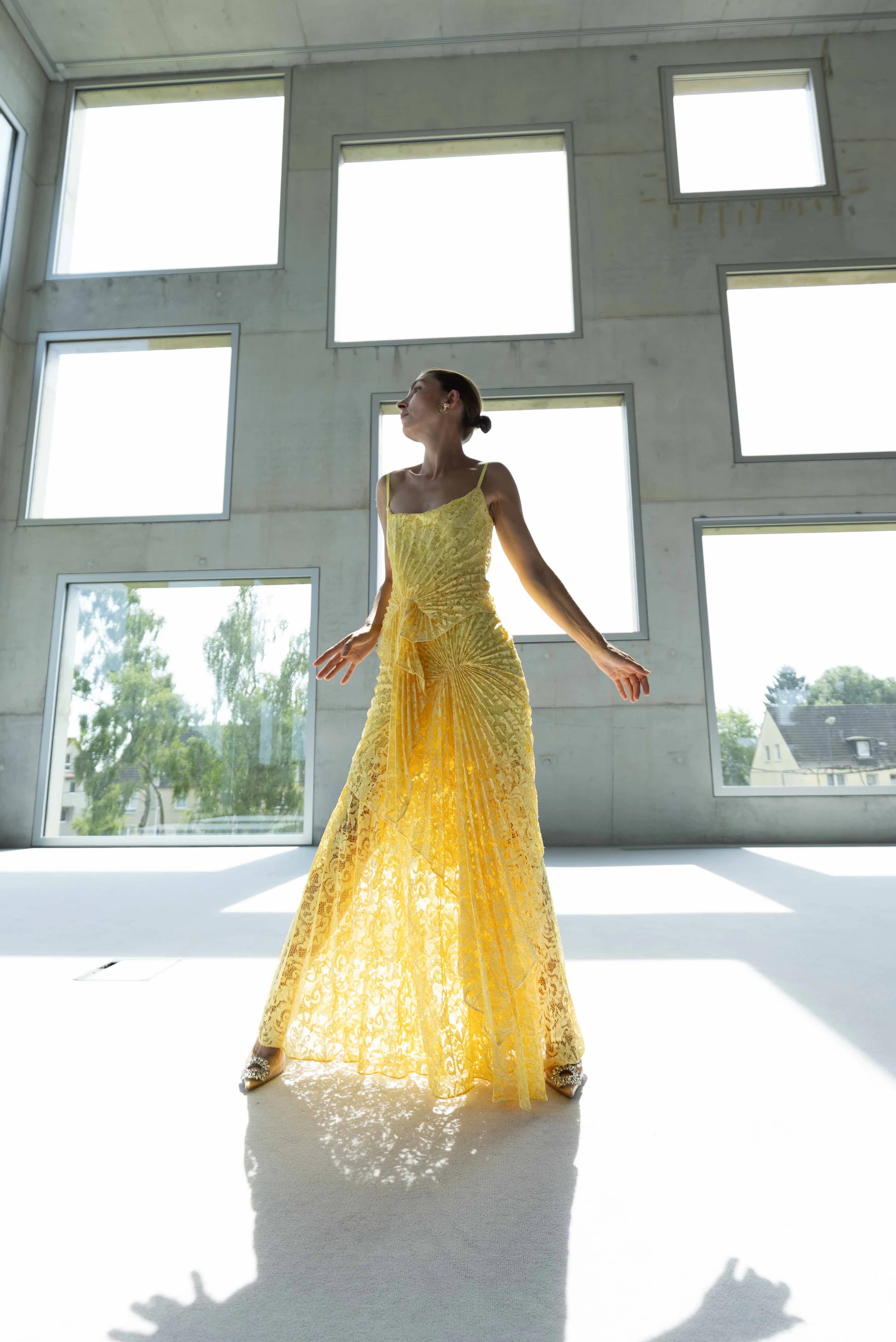 Discover our best selling Torrent style reimagined in delicate lace, elevating its romantic and timeless elegance. This full-length gown features delicate pleating in a flowing waterfall design, with thoughtfully gathered details. The softly gathered bodice frames the neckline and shoulders with refined grace and is complemented by adjustable straps. The intricate French Baroque-inspired lace fabric adds a subtle allure, while the waist tie provides a flattering silhouette.