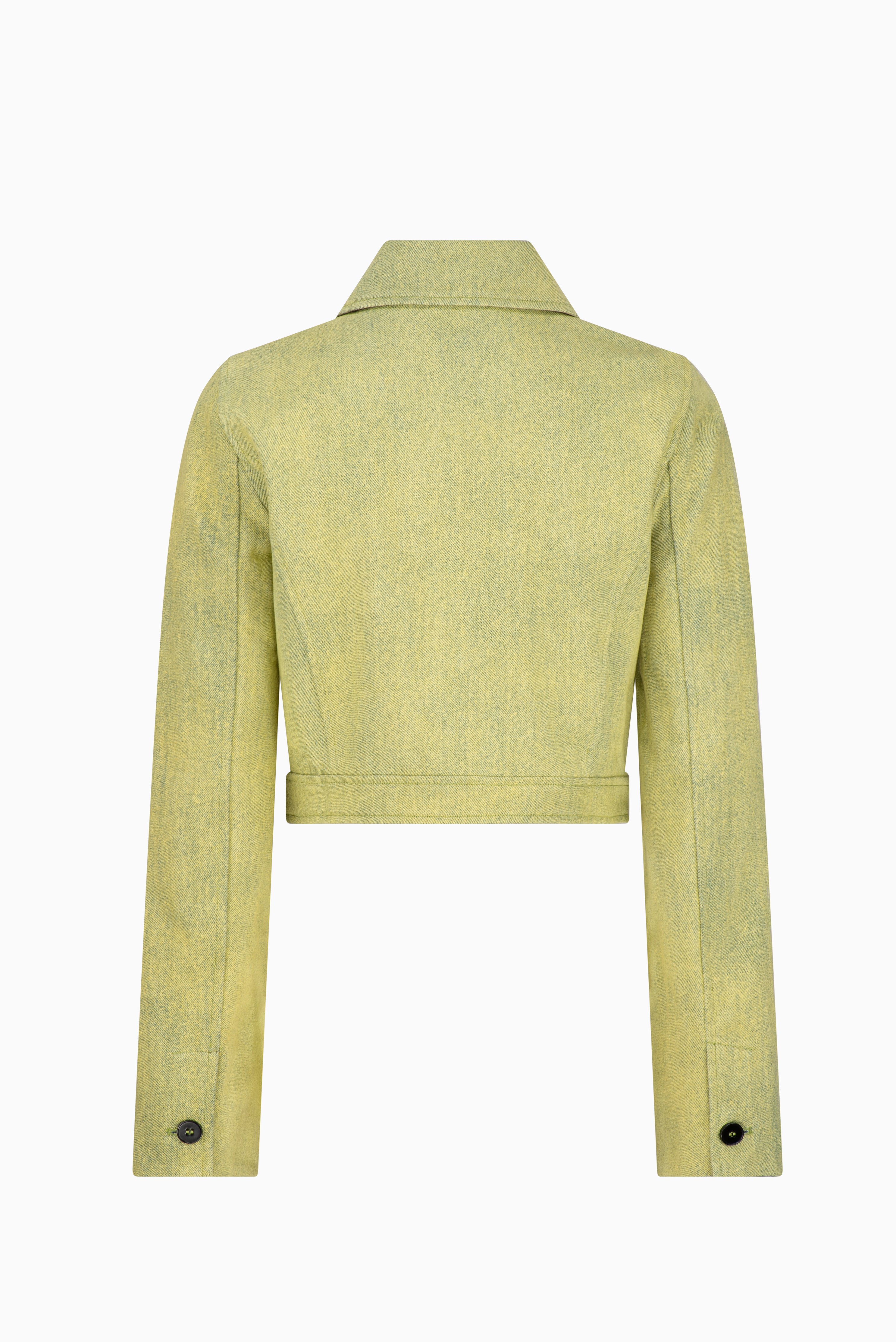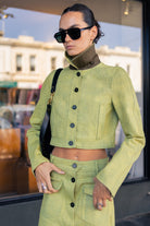 Introducing the Raphy Jacket in Moss Green, a substantial outerwear piece crafted from textured fabric designed to transition seamlessly through cooler seasons. Its robust construction provides reliable layering for autumn and winter wear. Style it with the coordinating skirt for a cohesive, polished look