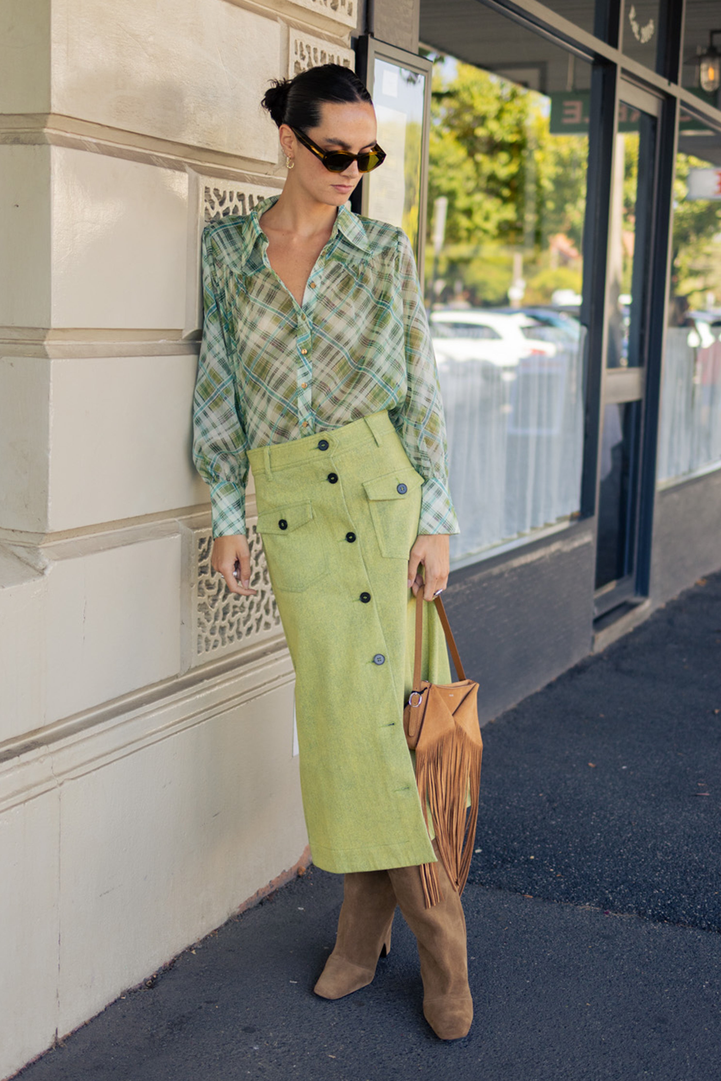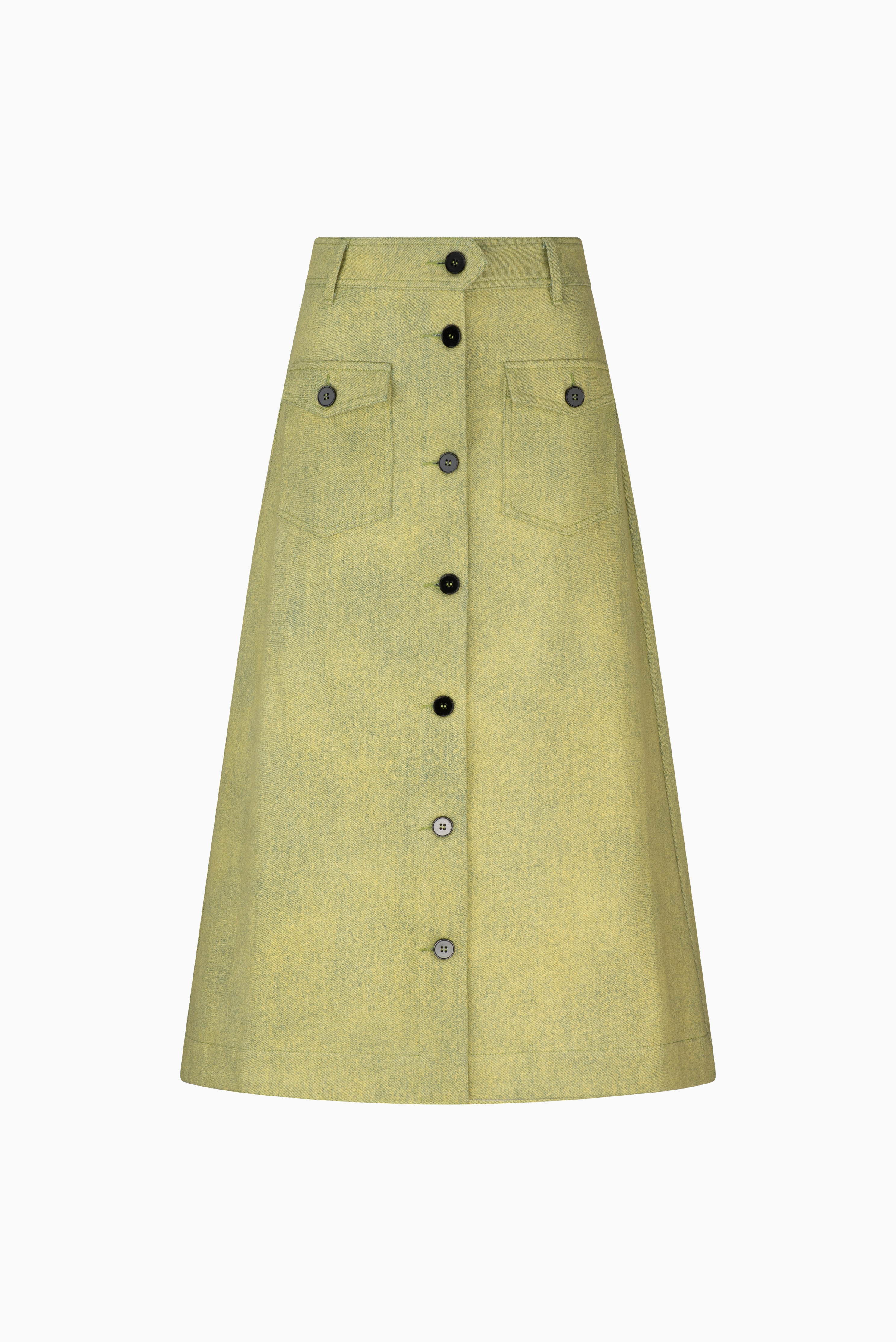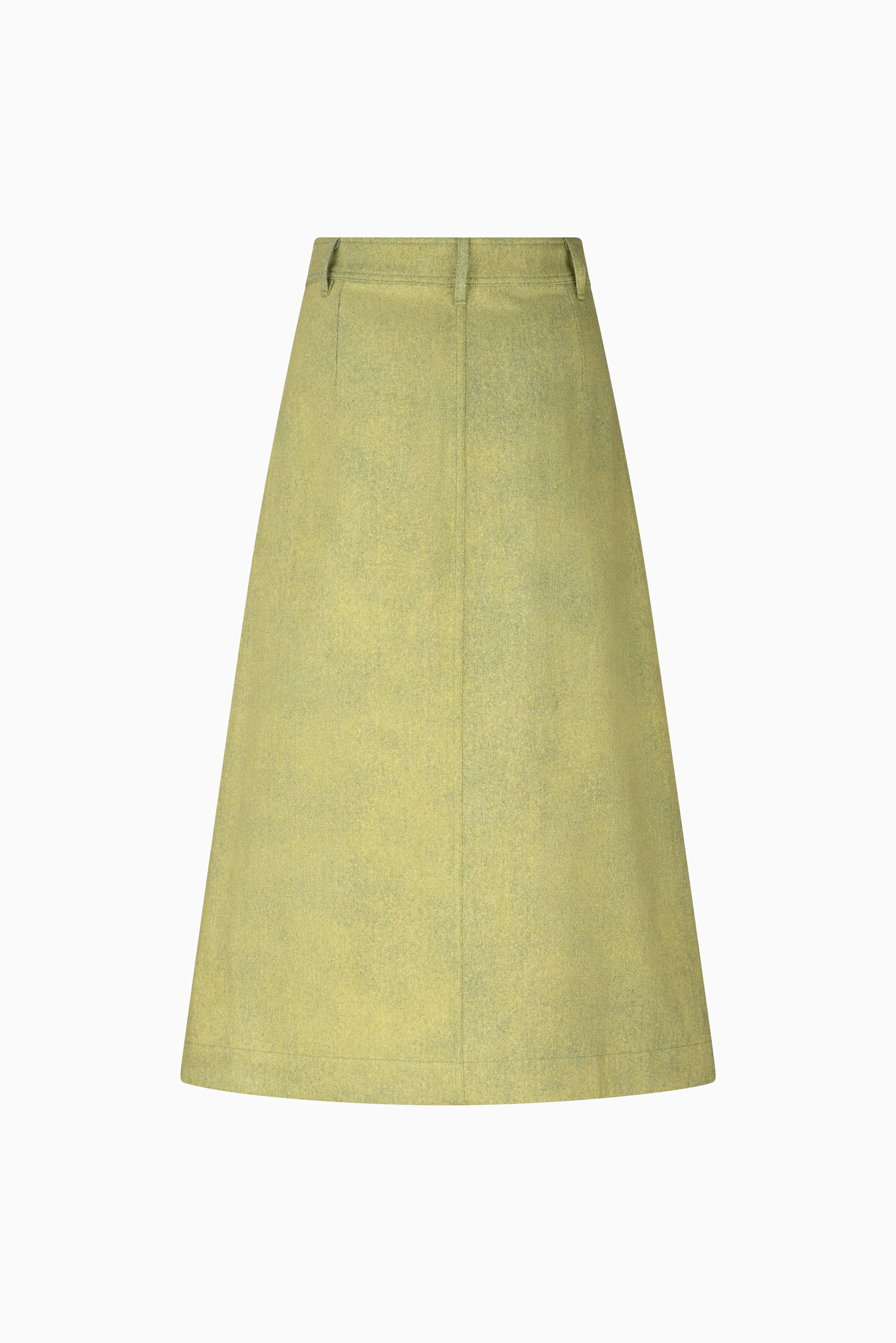 Introducing the Raphy skirt in Moss Green, a substantial outerwear piece crafted from textured fabric designed to transition seamlessly through cooler seasons. Its robust construction provides reliable layering for autumn and winter wear. Style it with the coordinating jacket for a cohesive, polished look