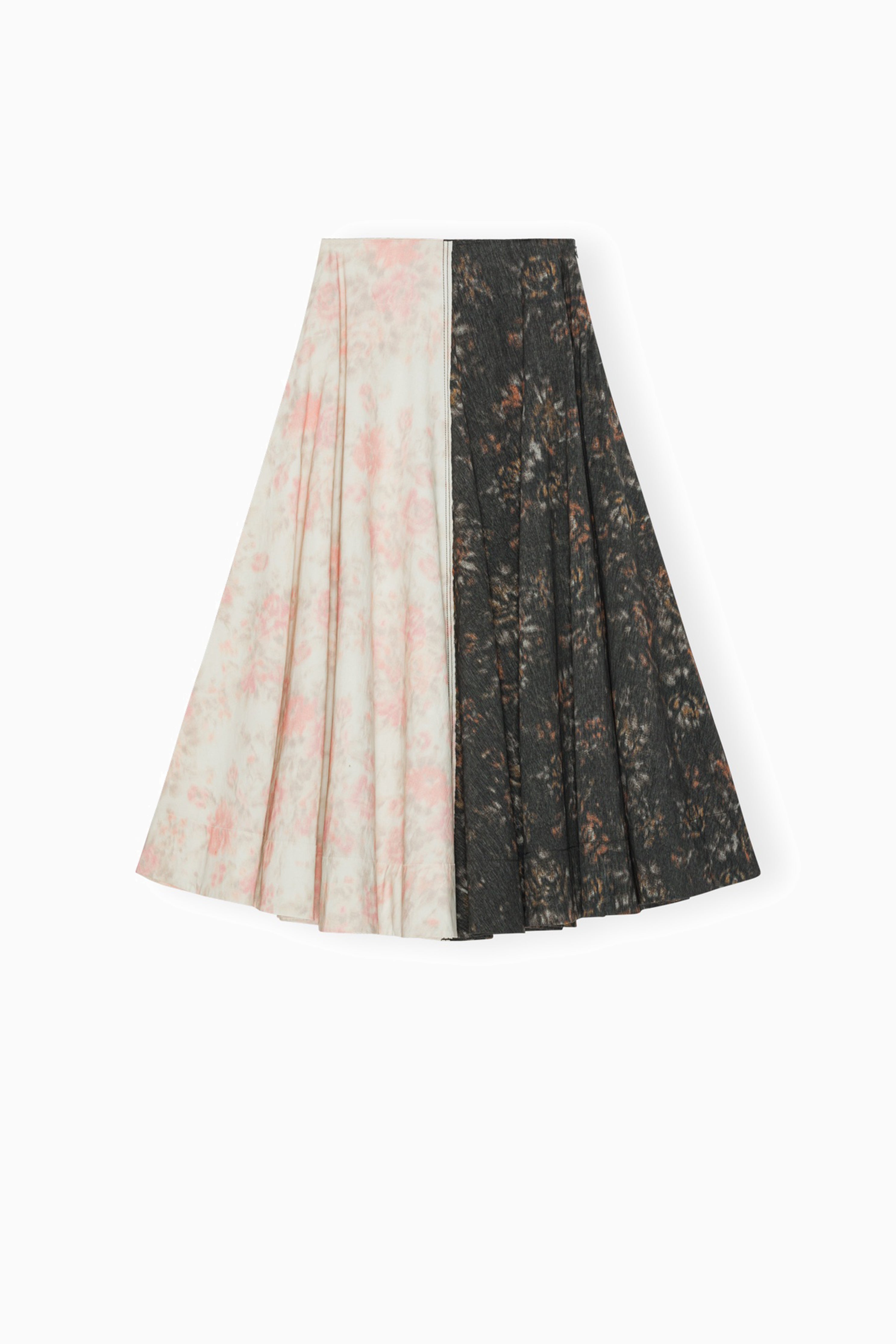 This long circle skirt showcases a two-tone floral print with panelled detailing, featuring an A-line silhouette and a hidden side zip