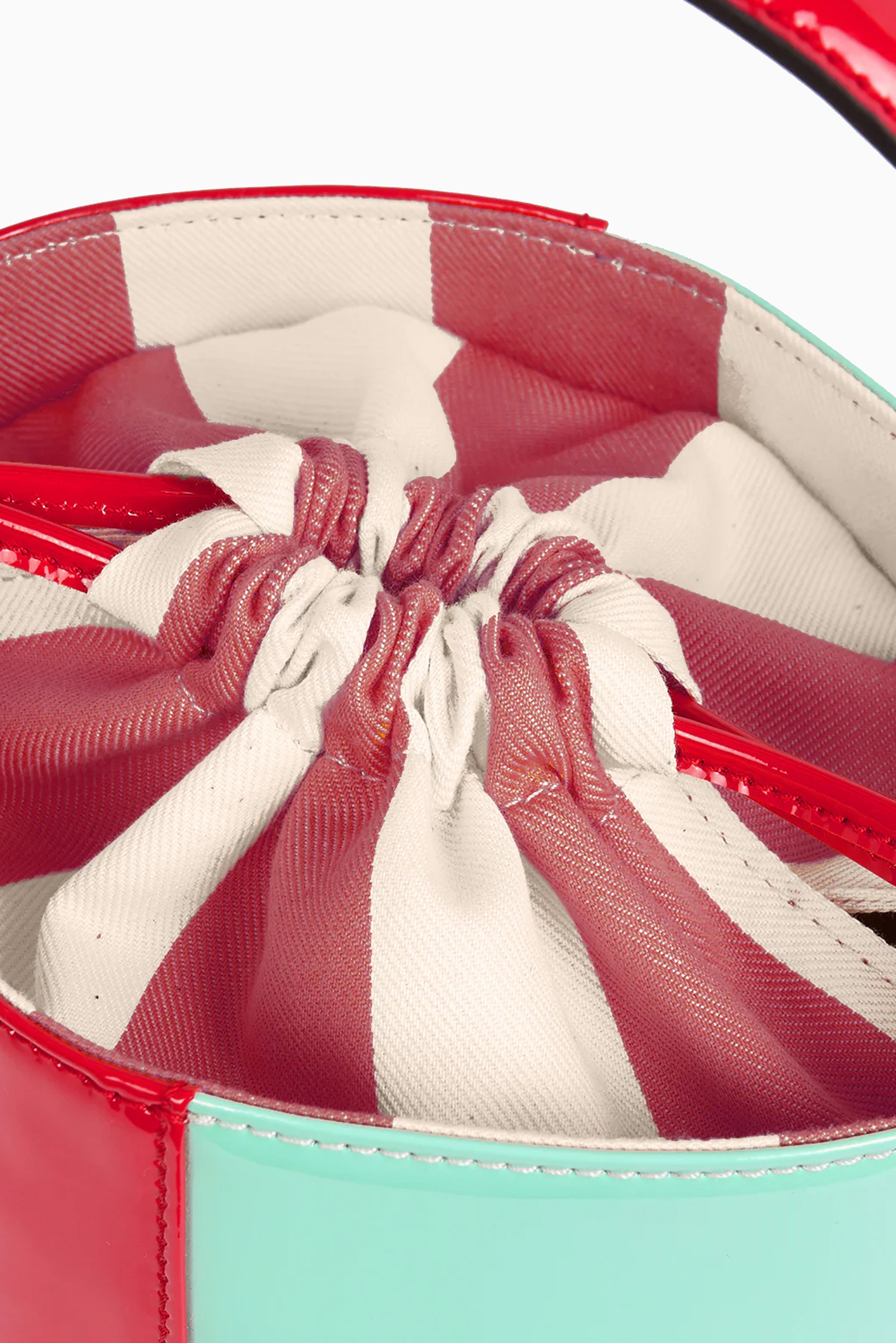 This red and turquoise patent leather bucket bag features a parasol lining, drawstring closure, side stripe detail, and an inside pocket. It measures 38cm long, 22cm wide, and 20cm high.