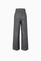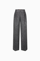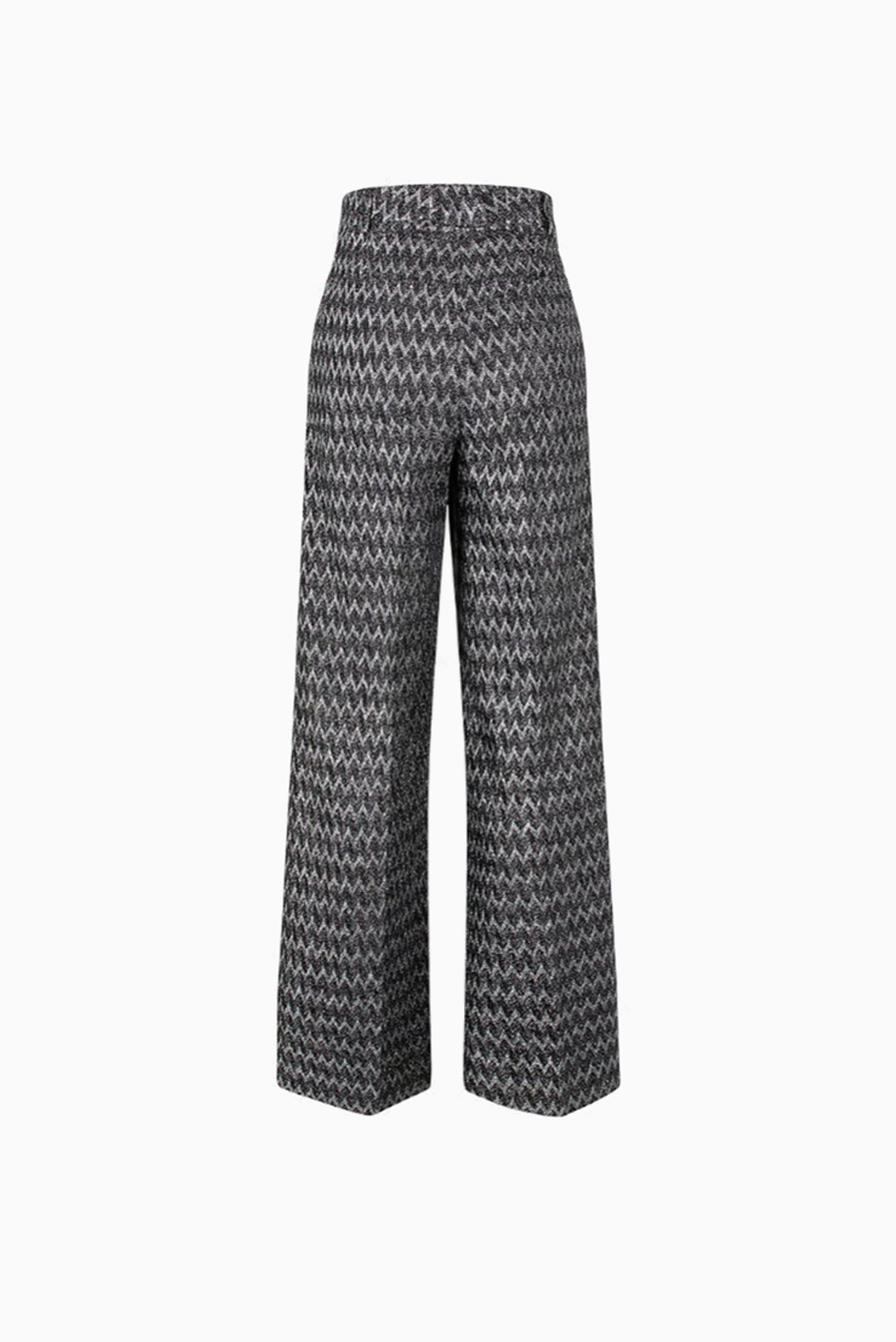 Crafted from luxurious lurex knit, these Missoni pants showcase the brand's iconic zigzag pattern in a sophisticated beige bronze palette. The relaxed wide-leg silhouette offers contemporary elegance with a touch of shimmer, making them a versatile statement piece for elevated everyday styling.
