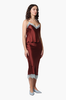 The Lipp Silk Skirt features a bold colour combination that brings instant character to your wardrobe. Cut from a soft silk with a contrasting lace trim. Pair it with the matching Lipp Cami for a full look, or leave solo.