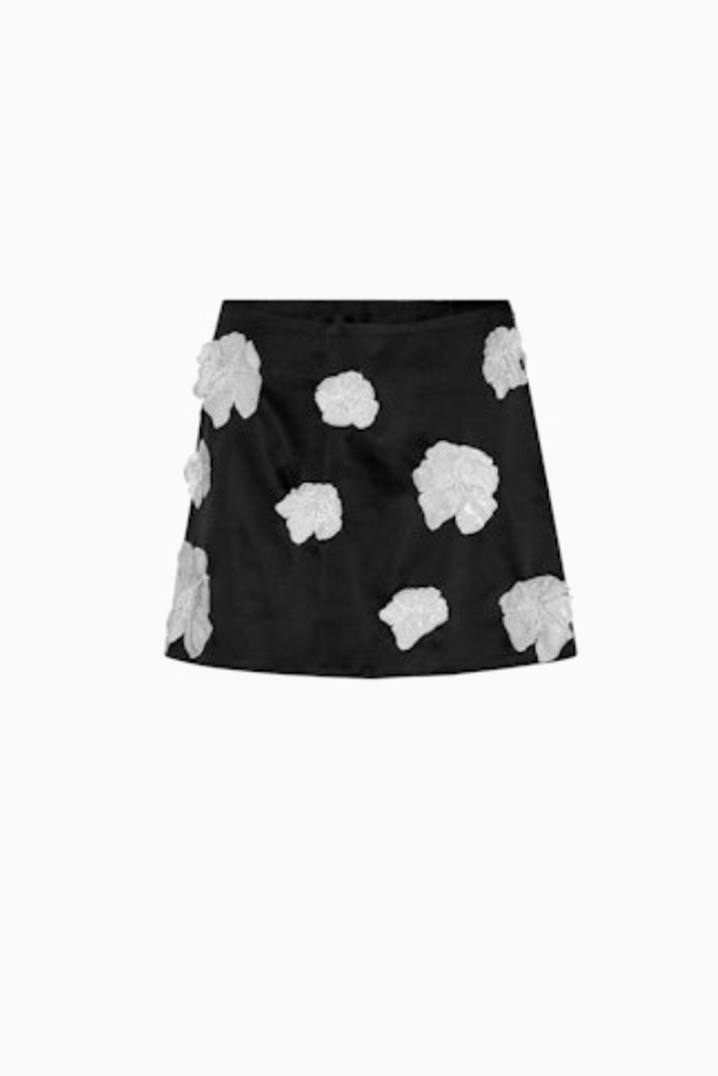 Delicate sequin florals adorn this sophisticated mini skirt, crafted from luxurious satin for an elegant silhouette. Perfect for evening occasions or statement styling, the intricate floral embellishments catch light beautifully while the classic black base ensures versatile coordination with your wardrobe.