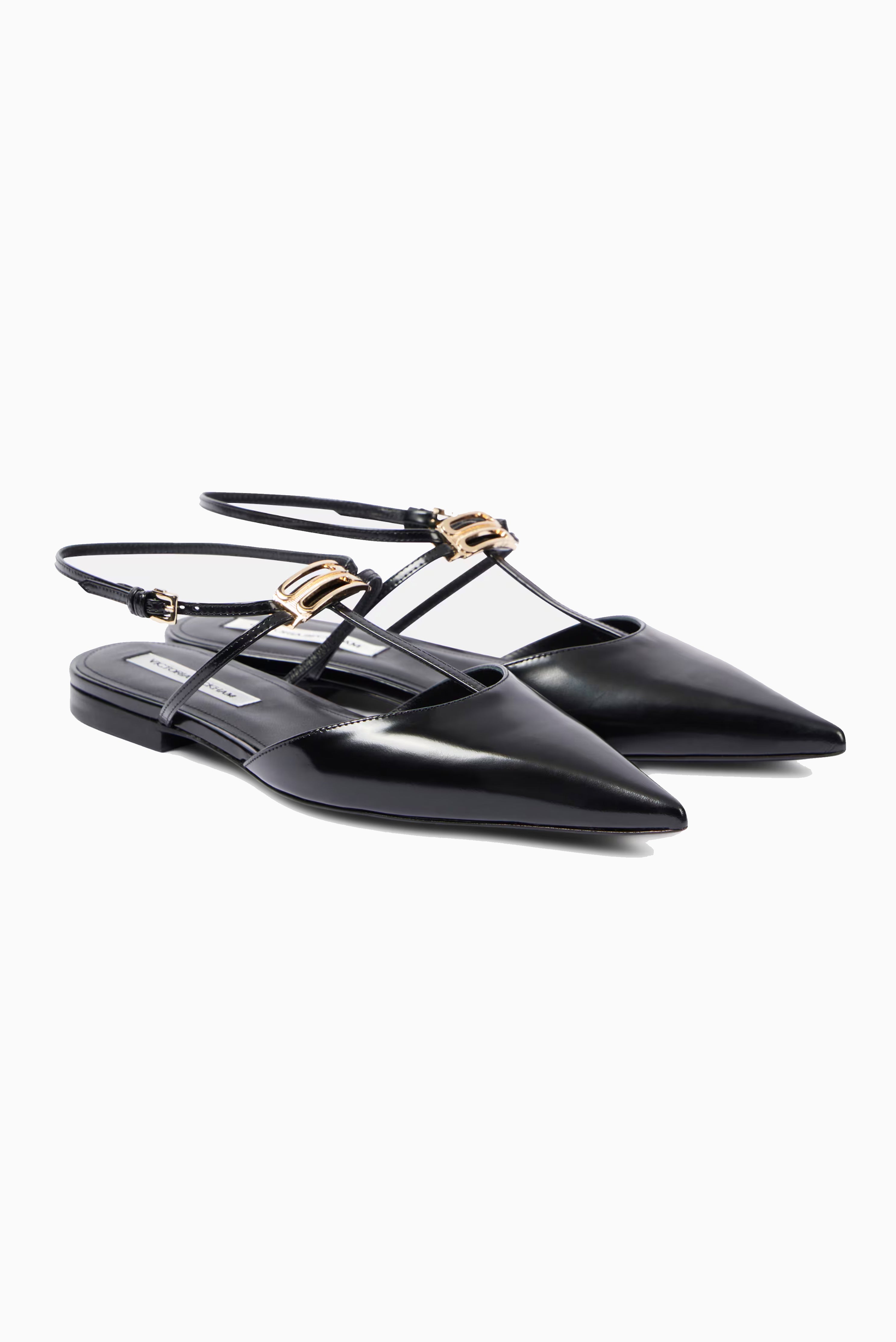 Sleek black leather shoe made in Italy featuring a refined pointed toe, buckle ankle strap, and gold hardware. Constructed entirely from premium leather with matching lining and sole.