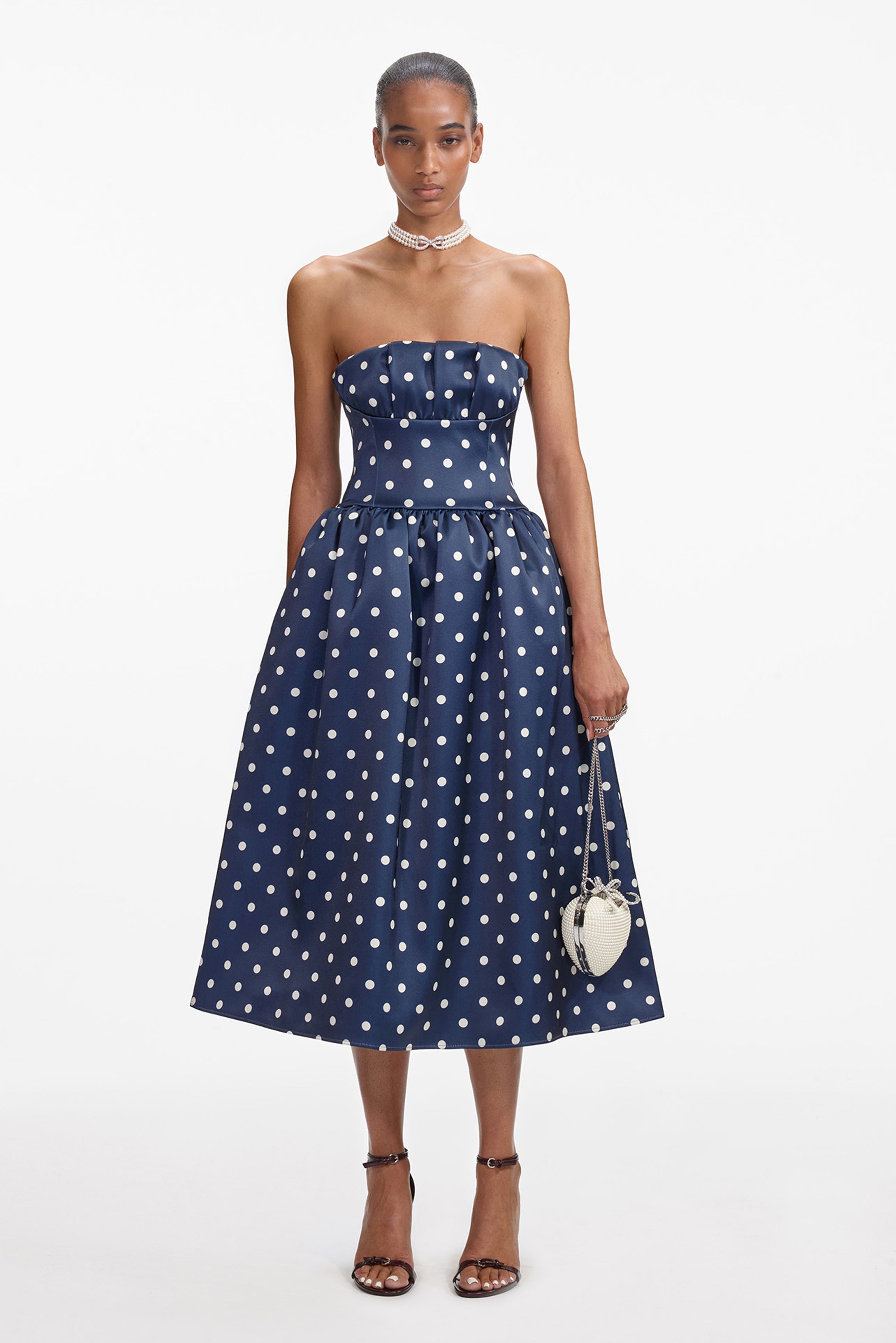 Elegant navy satin midi dress featuring a timeless polka dot pattern and sophisticated strapless silhouette. The flowing skirt creates a refined, elongated line perfect for special occasions or elevated everyday wear. A versatile piece that transitions seamlessly from day to evening.