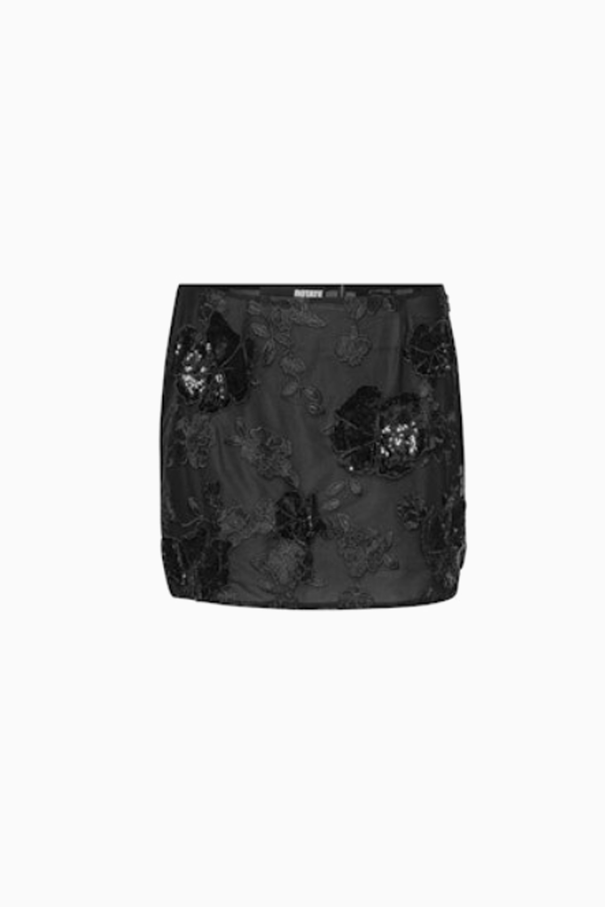 Sleek black mini skirt featuring dimensional sequin embellishments that catch the light with every movement. The textured 3D detailing adds visual interest and sophistication to this versatile wardrobe essential, perfect for elevating casual looks or creating standout evening styles.