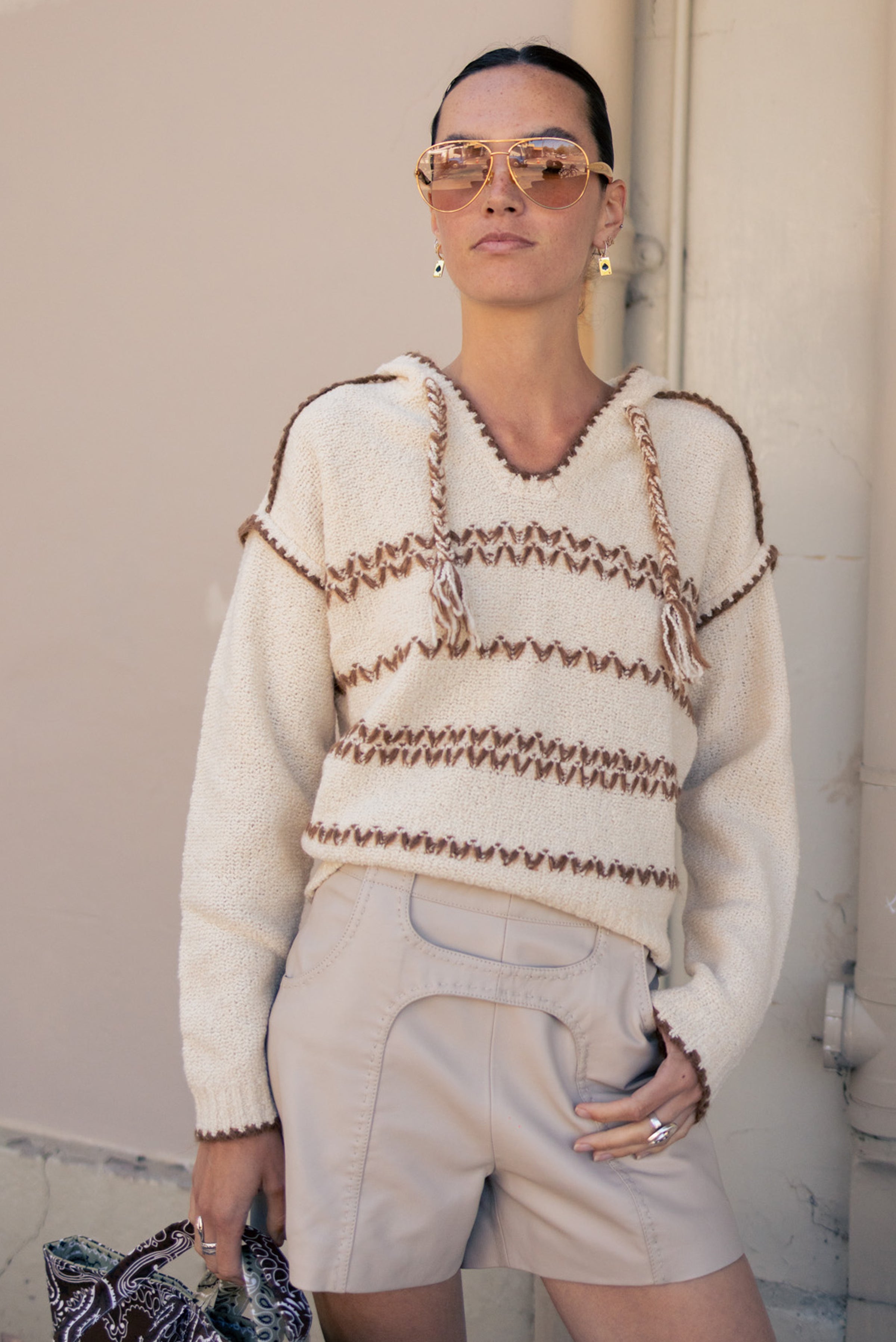 Merino wool tweed pullover with a relaxed fit, dropped armholes, and hooded neckline finished with drawstring and pompoms. Features contrasting ribbon detailing and ribbed trims throughout.