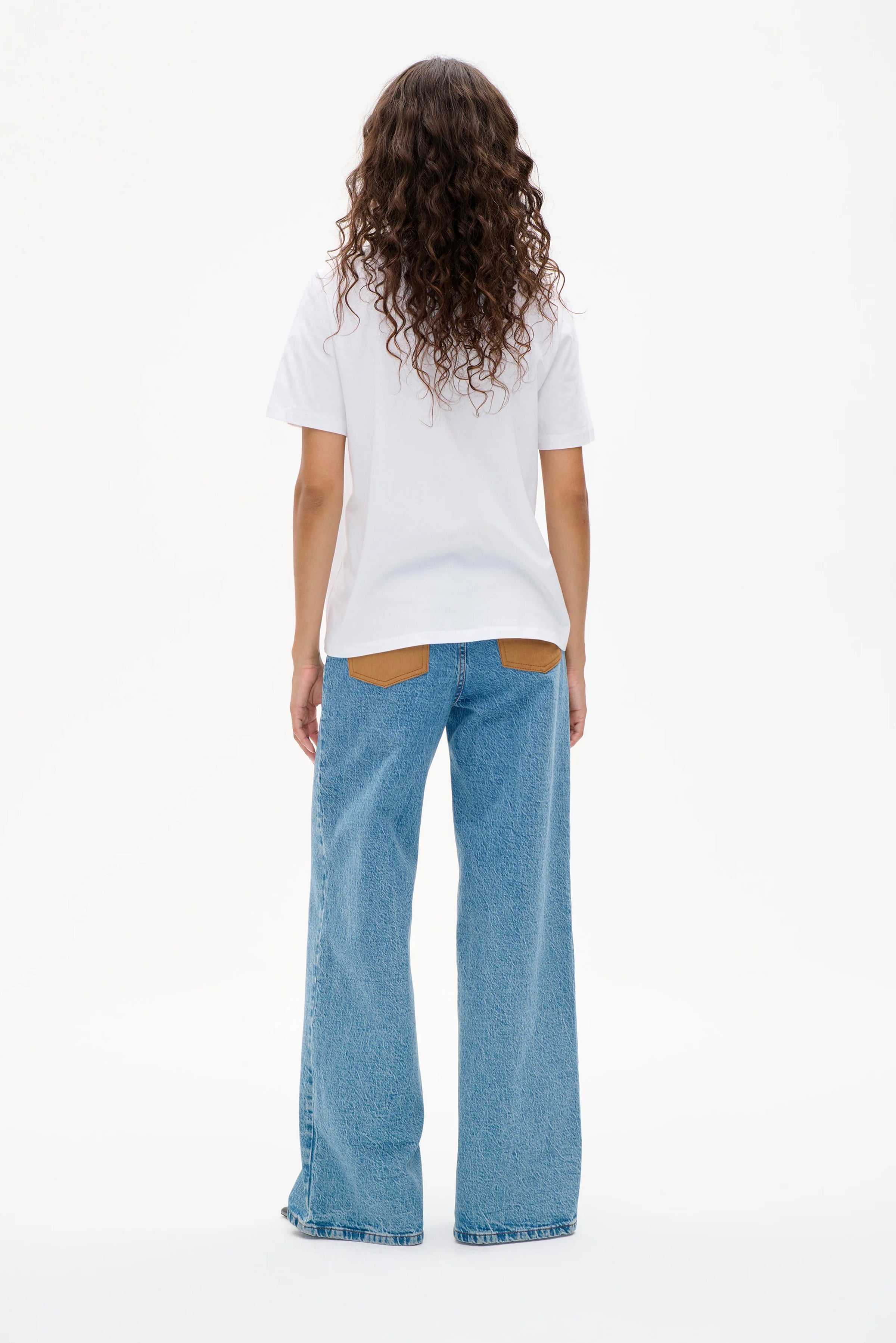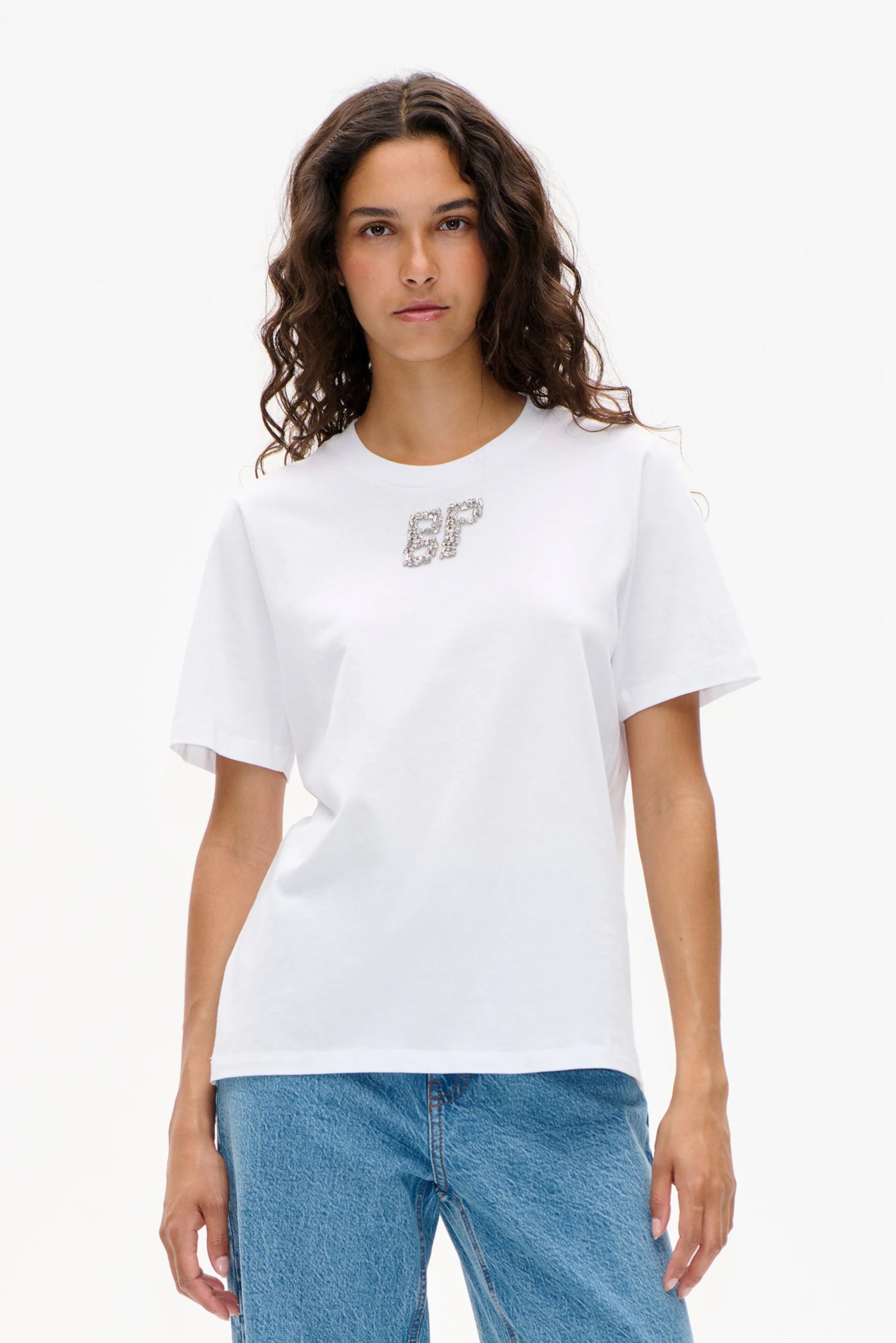 Soft organic cotton t-shirt with a relaxed fit, crew neck, and rhinestone logo detail at the chest. A timeless wardrobe essential.