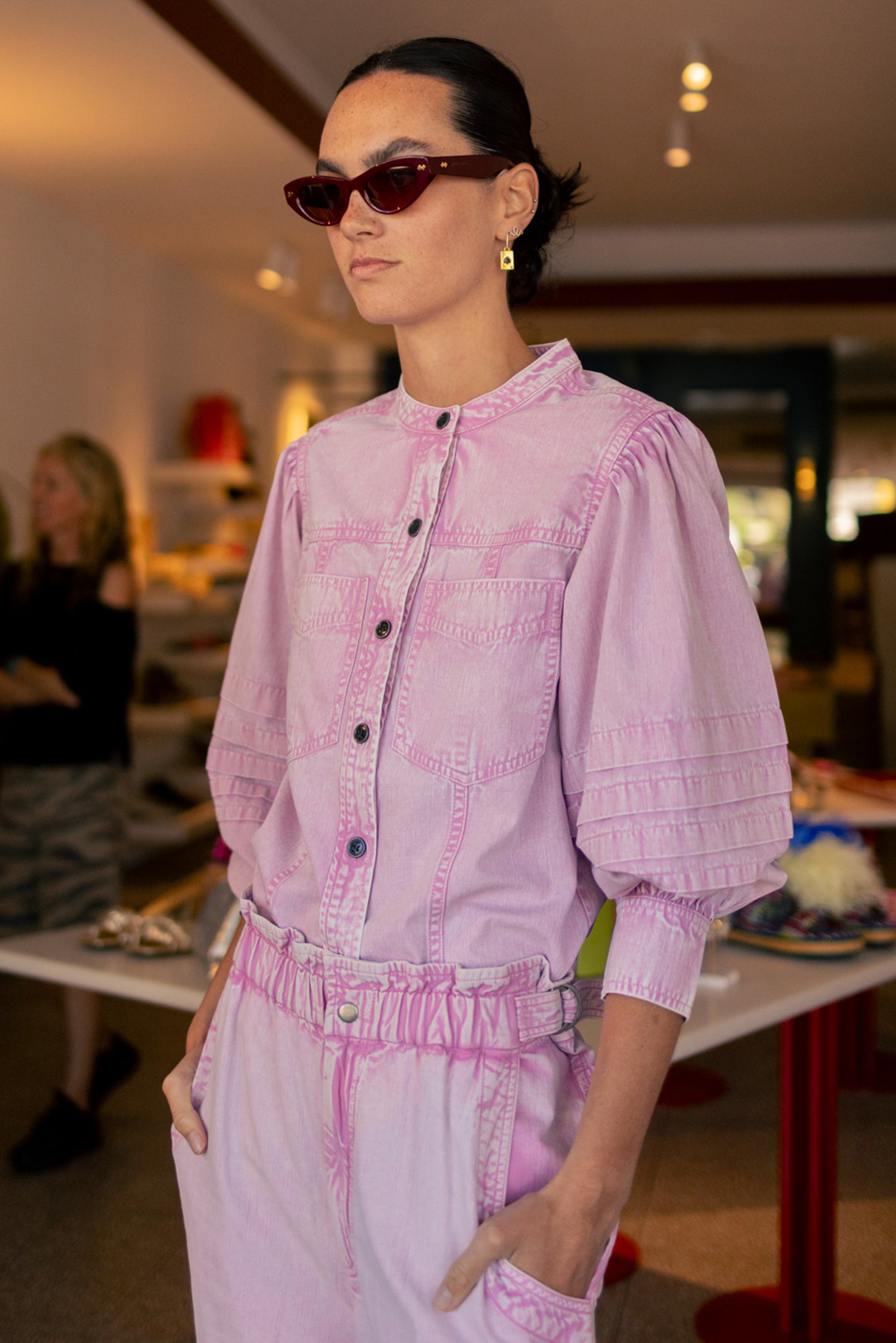 Lightweight faded cotton chambray shirt with round neckline, long sleeves, buttoned front, and patch pockets. Straight cut with rounded hem.