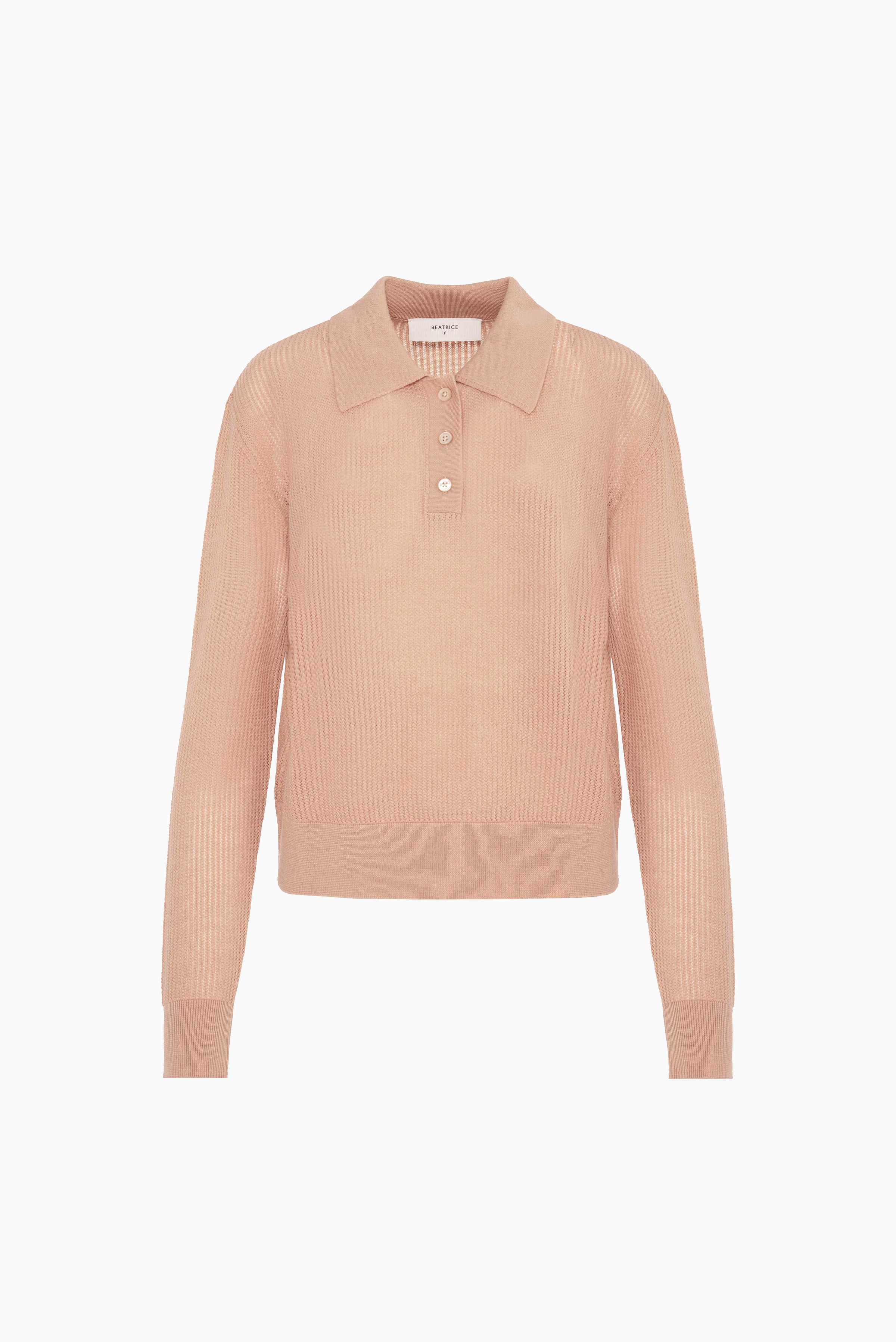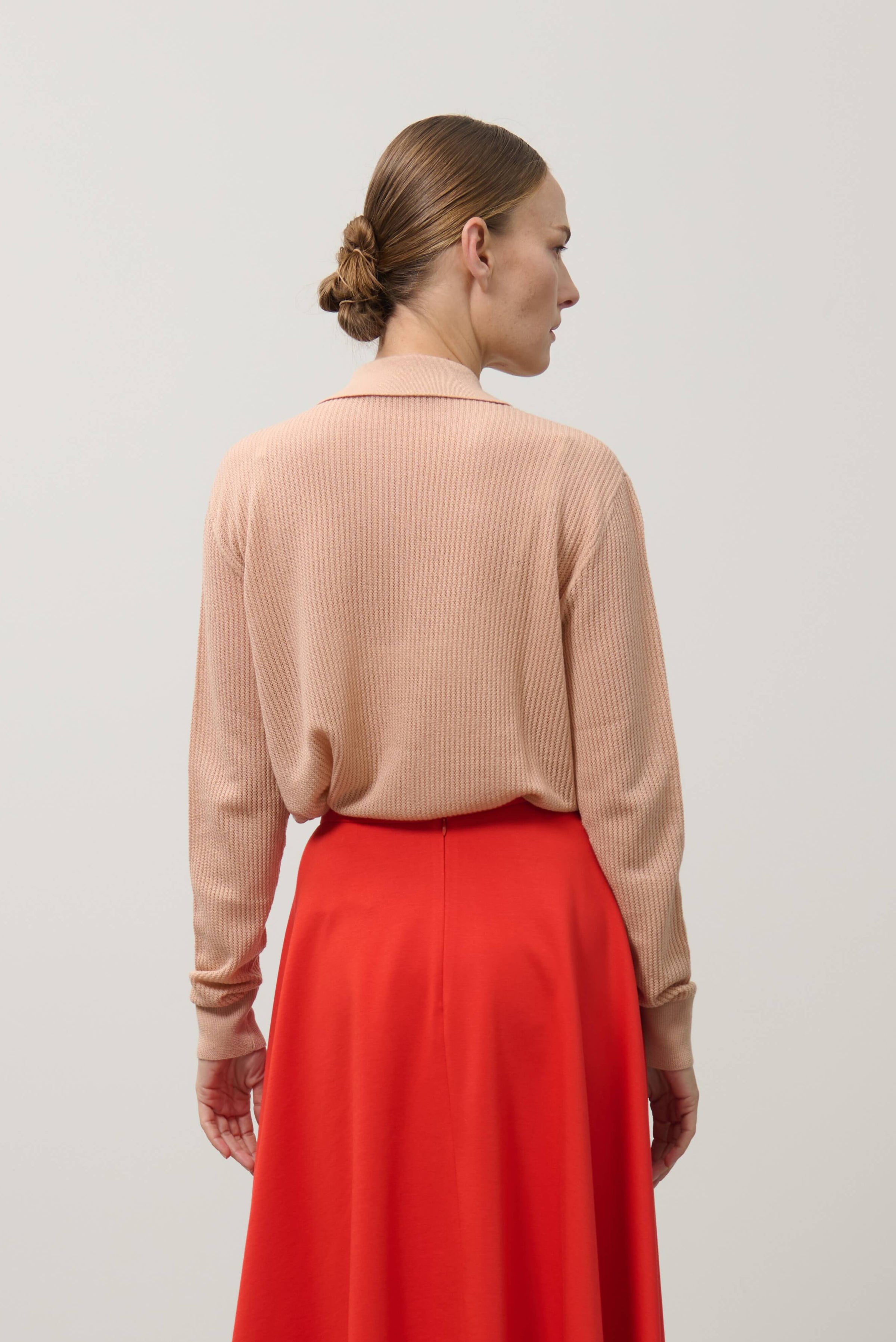 A refined knit polo featuring long sleeves in a warm ginger hue. This versatile piece combines classic polo styling with contemporary comfort, ideal for layering or standalone wear across seasons.