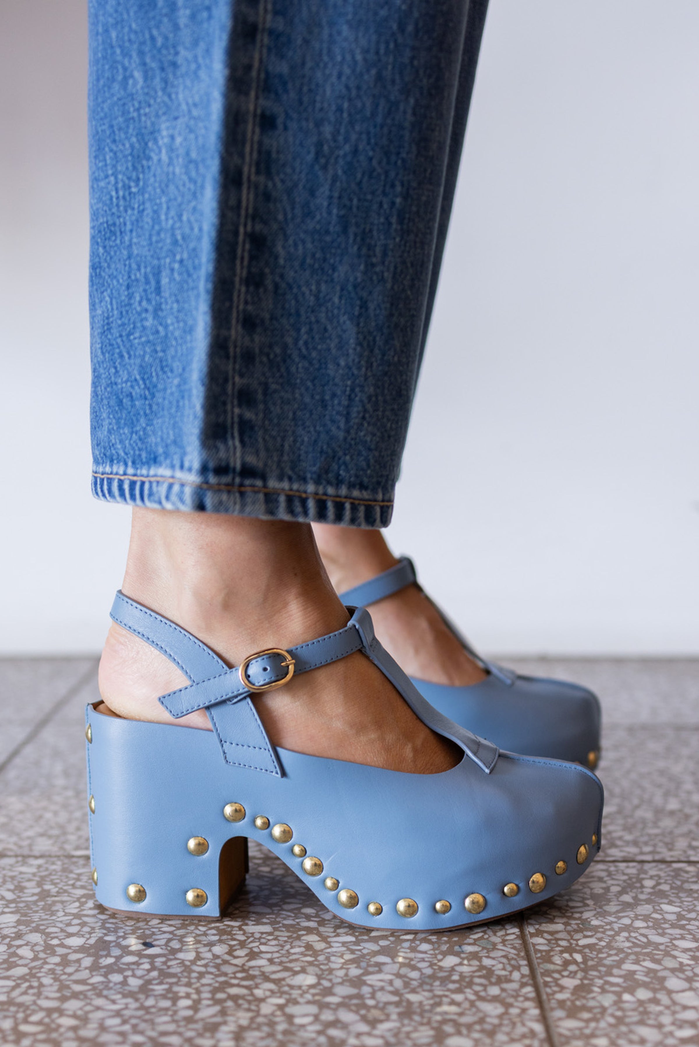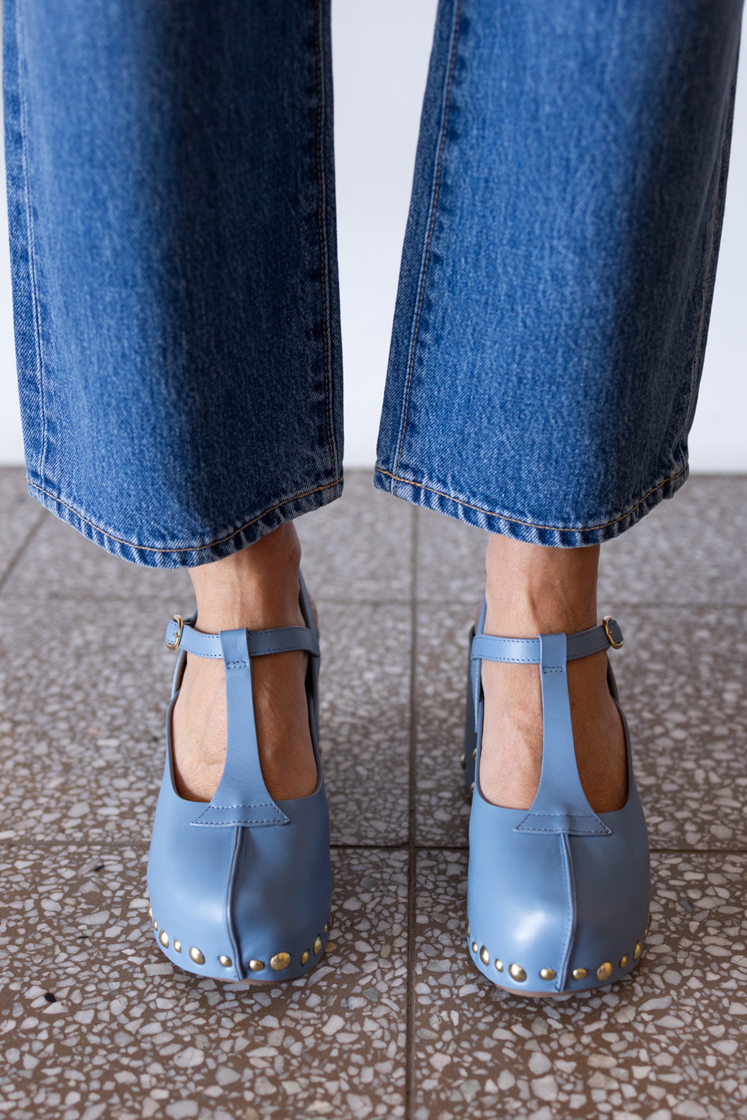 Sleek blue leather clog featuring a Mary Jane silhouette, elevated with refined gold stud accents for understated sophistication.
