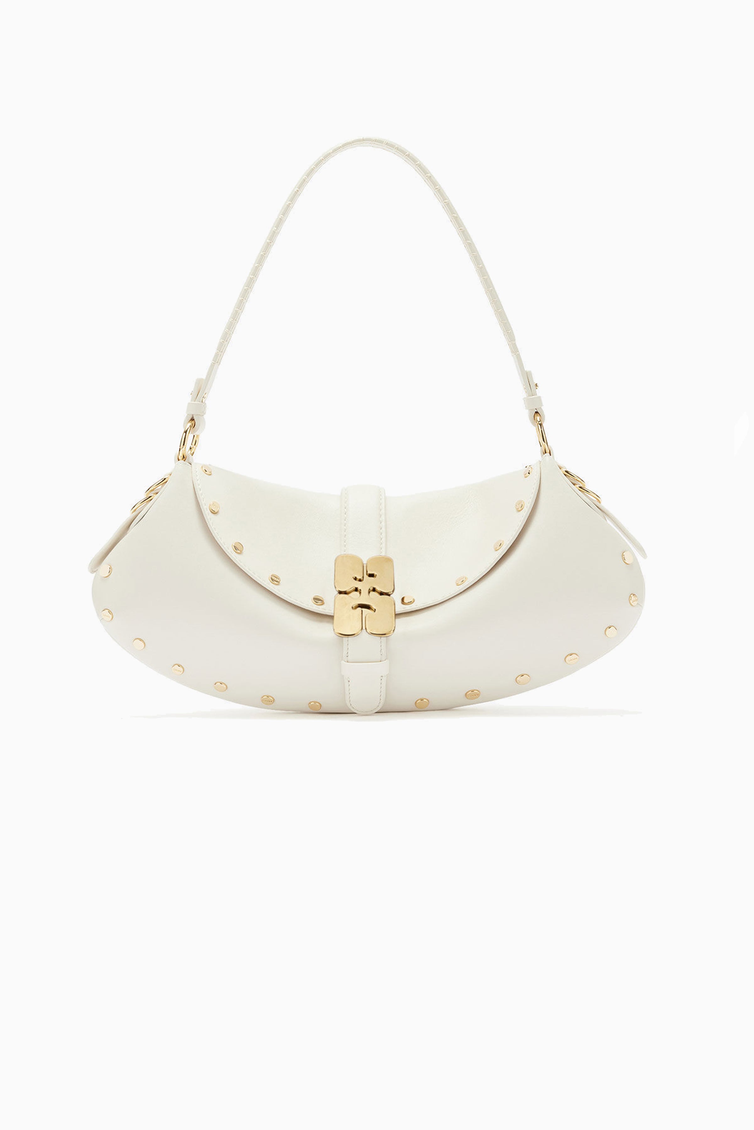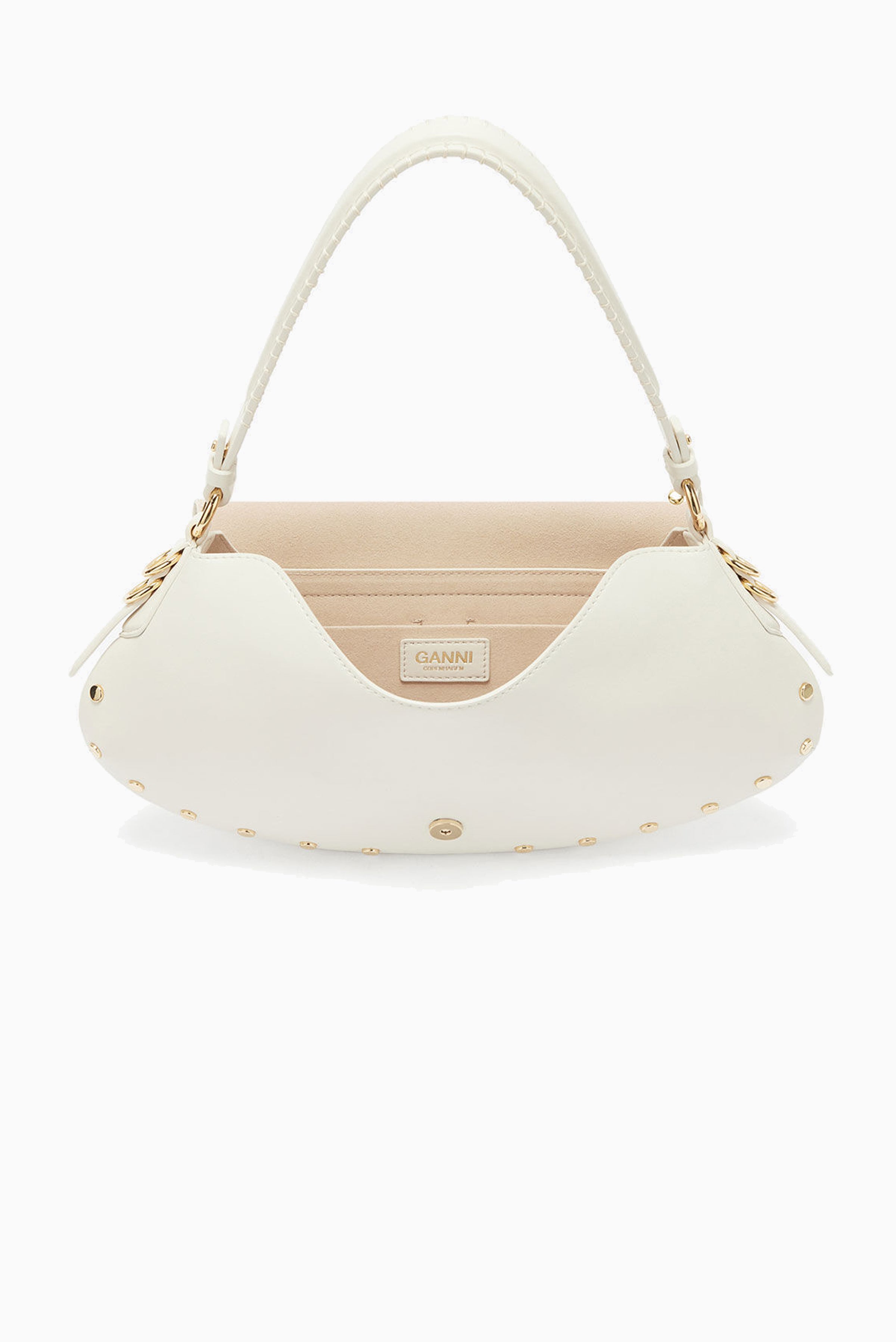This bag features a curved silhouette, flap closure with the signature GANNI Butterfly and a shoulder strap. The bag has D-ring detailing at the side, one main compartment and an inside open pocket