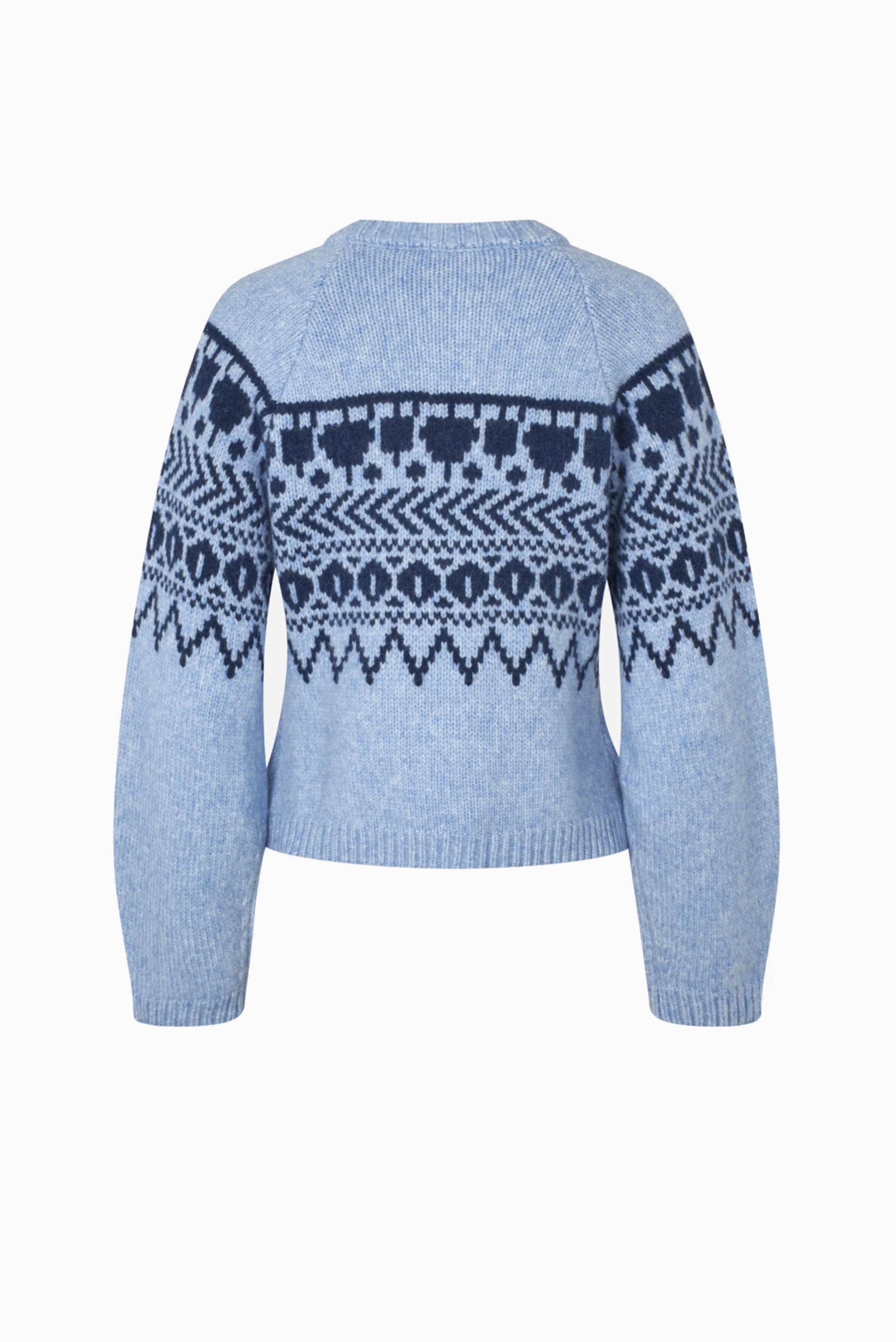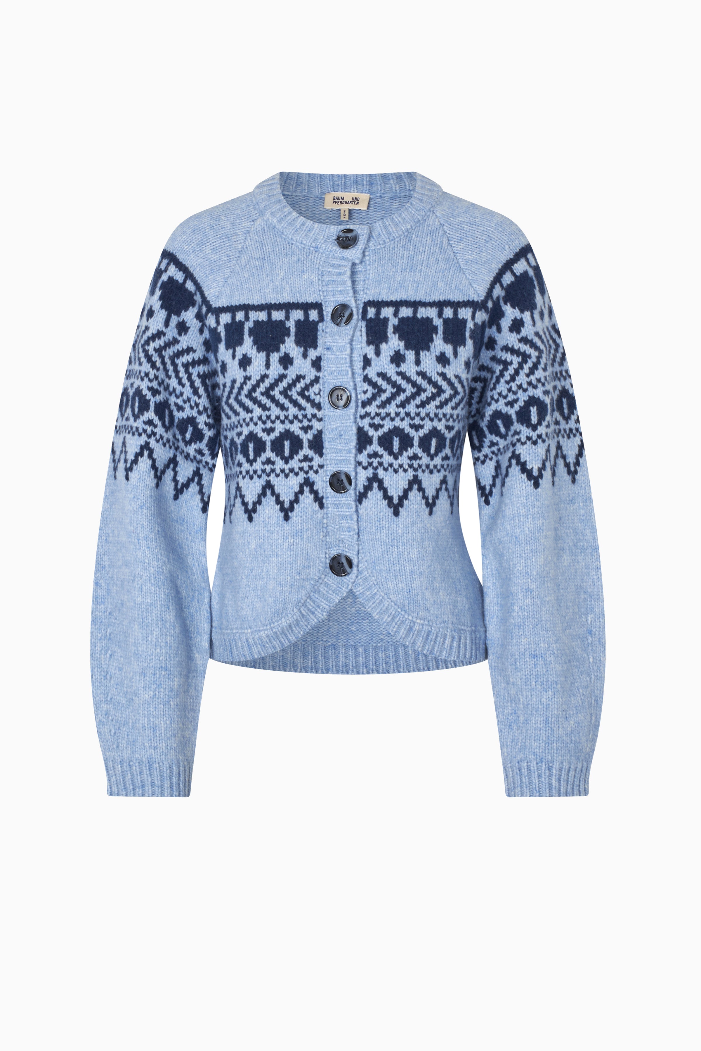 The Colin Cardigan features a soft wool blend and a two-color Fair Isle pattern, offering warmth and a comfortable, relaxed fit with raglan sleeves and ribbed edges.