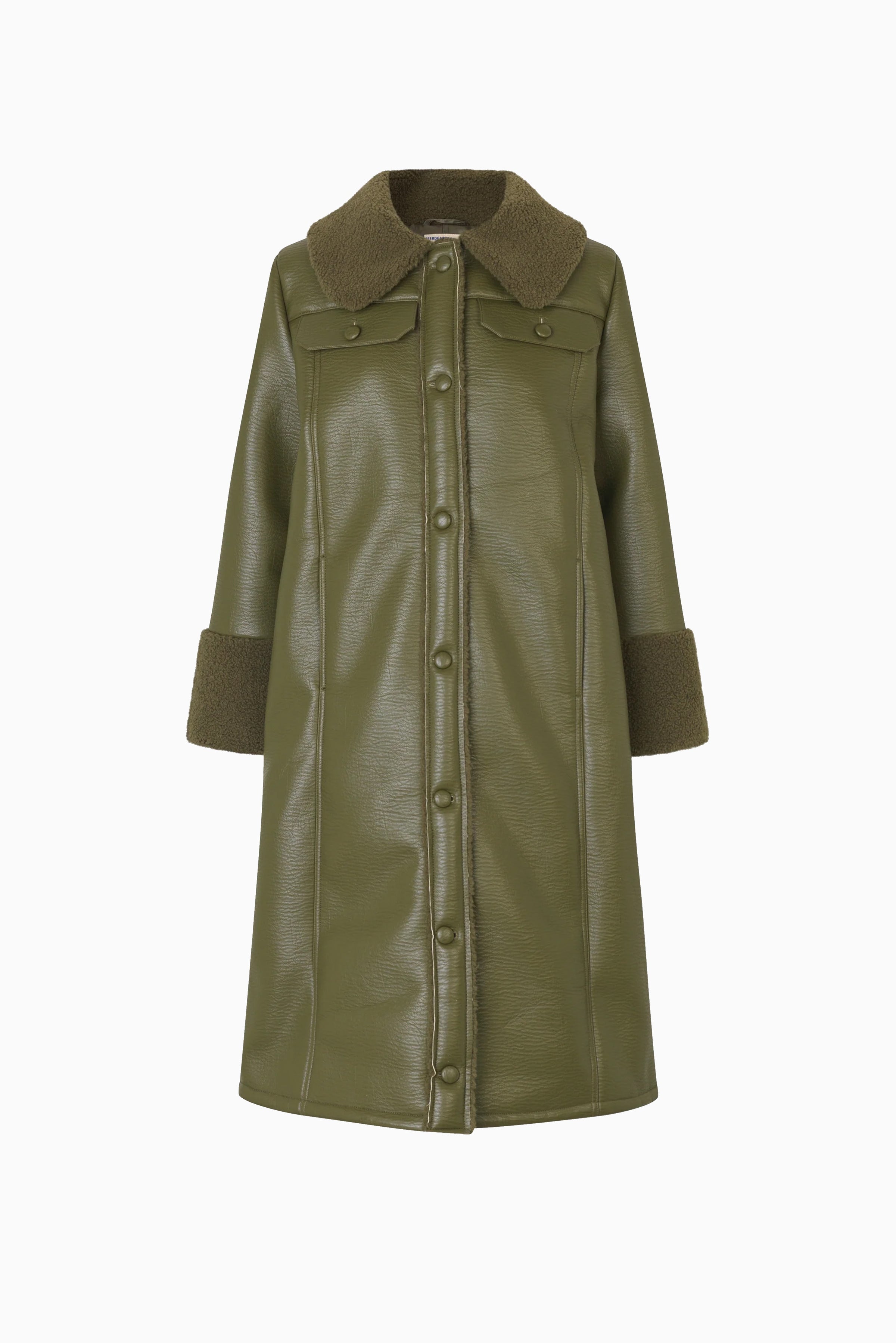 The Desire Coat combines textured faux leather with soft faux shearling on the collar and cuffs for a stylish, comfortable fit. Its loose, midi-length design includes side pockets and button closure.