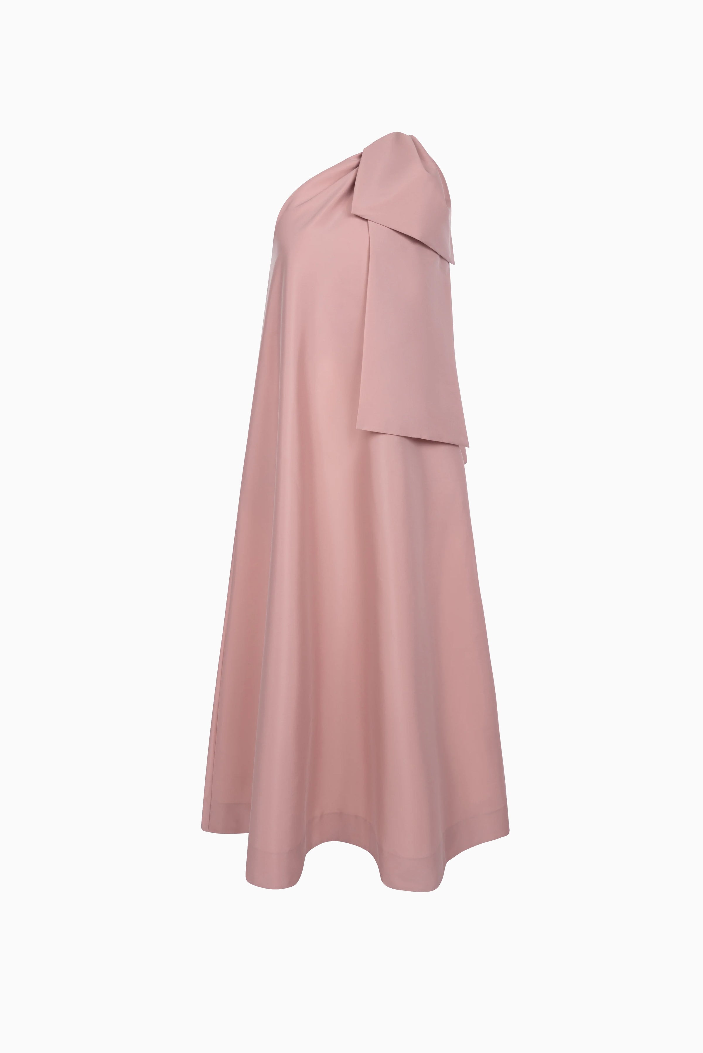 The Midi Dress Winnie features a one-shoulder design in crisp taffeta, ending with a striking bow. It’s now offered in a winter pink shade.