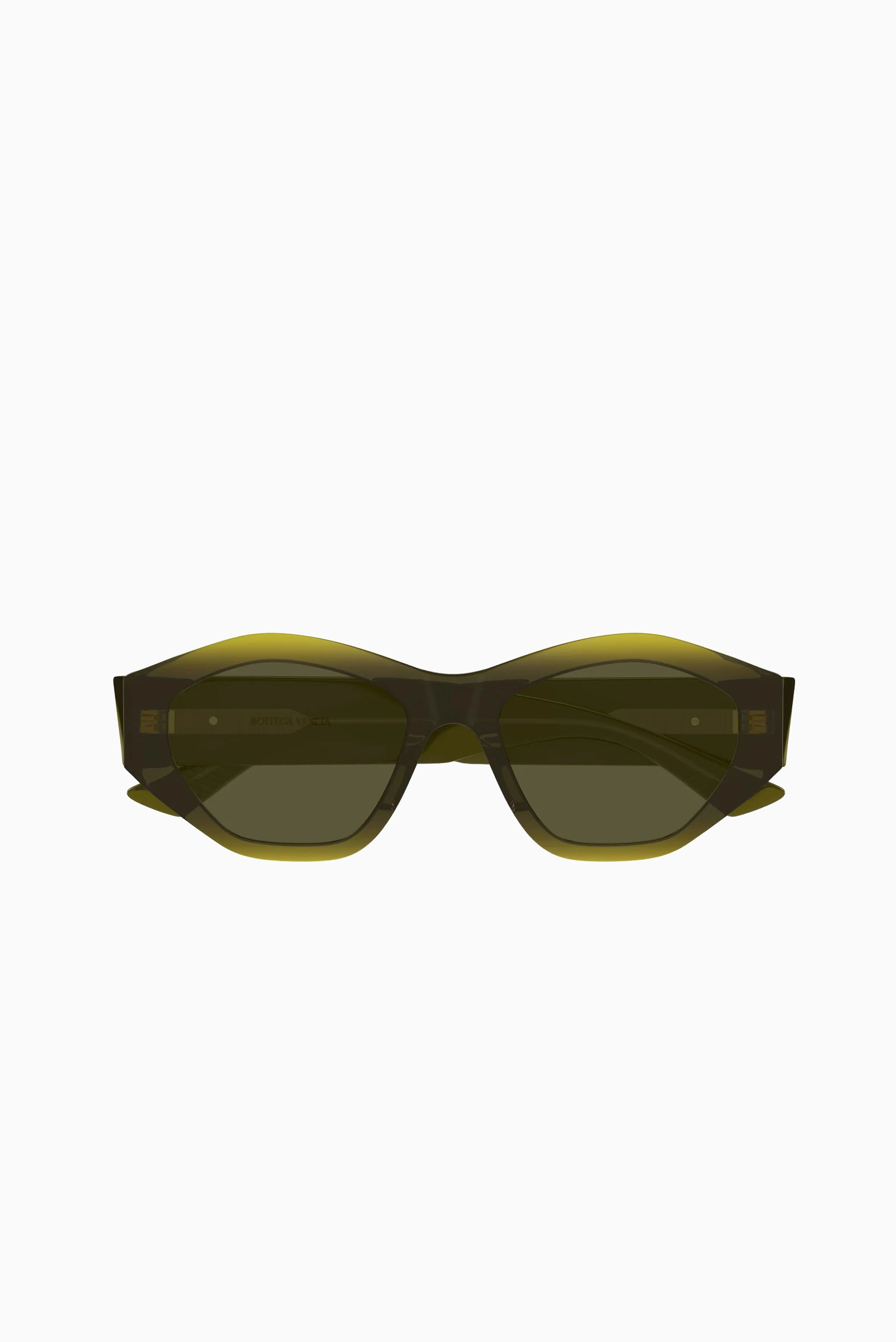 Bottega Veneta BV1408S 003 sunglasses for women, featuring shiny transparent bilayer green / yellow geometric recycled acetate frame and solid green bio nylon lenses.