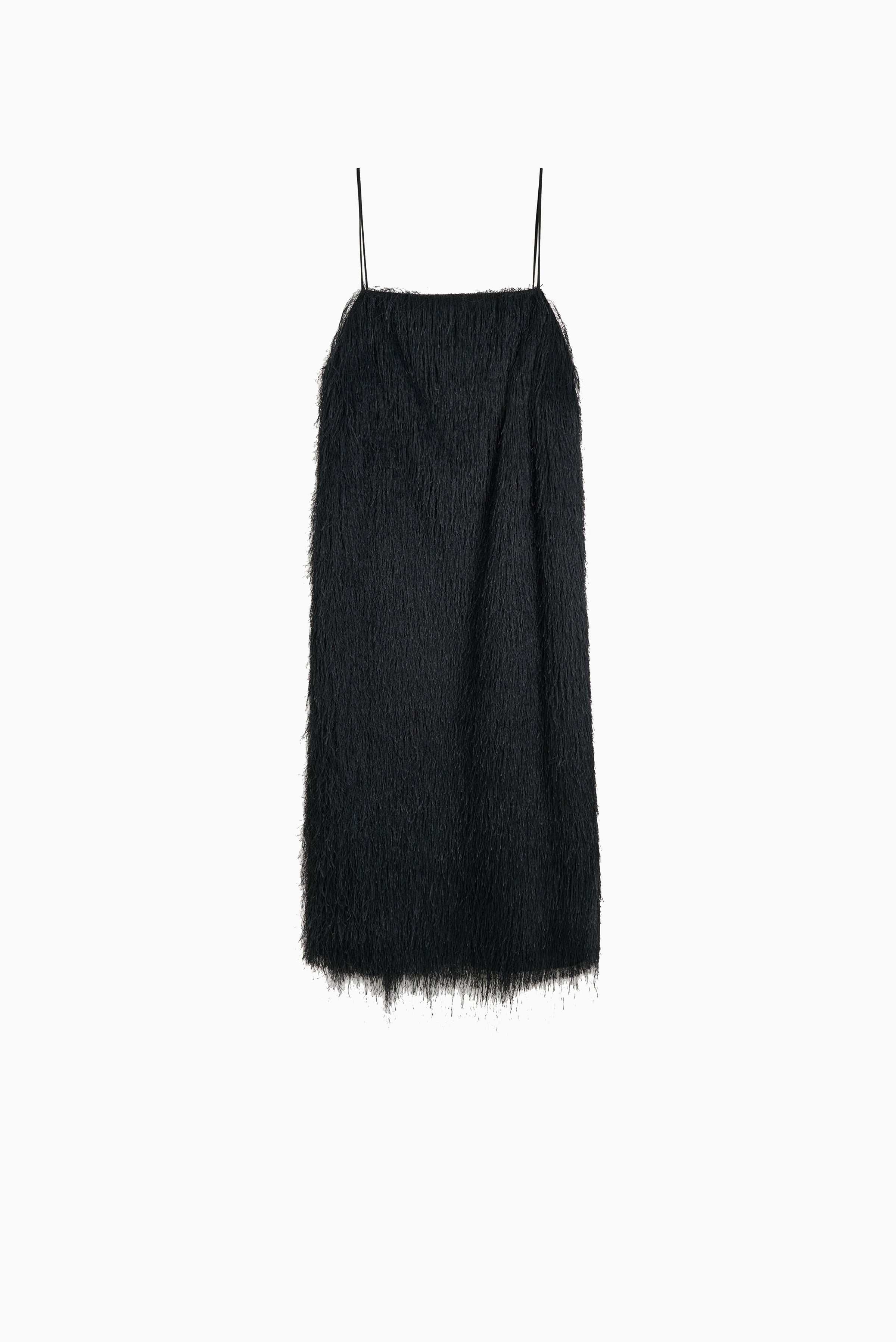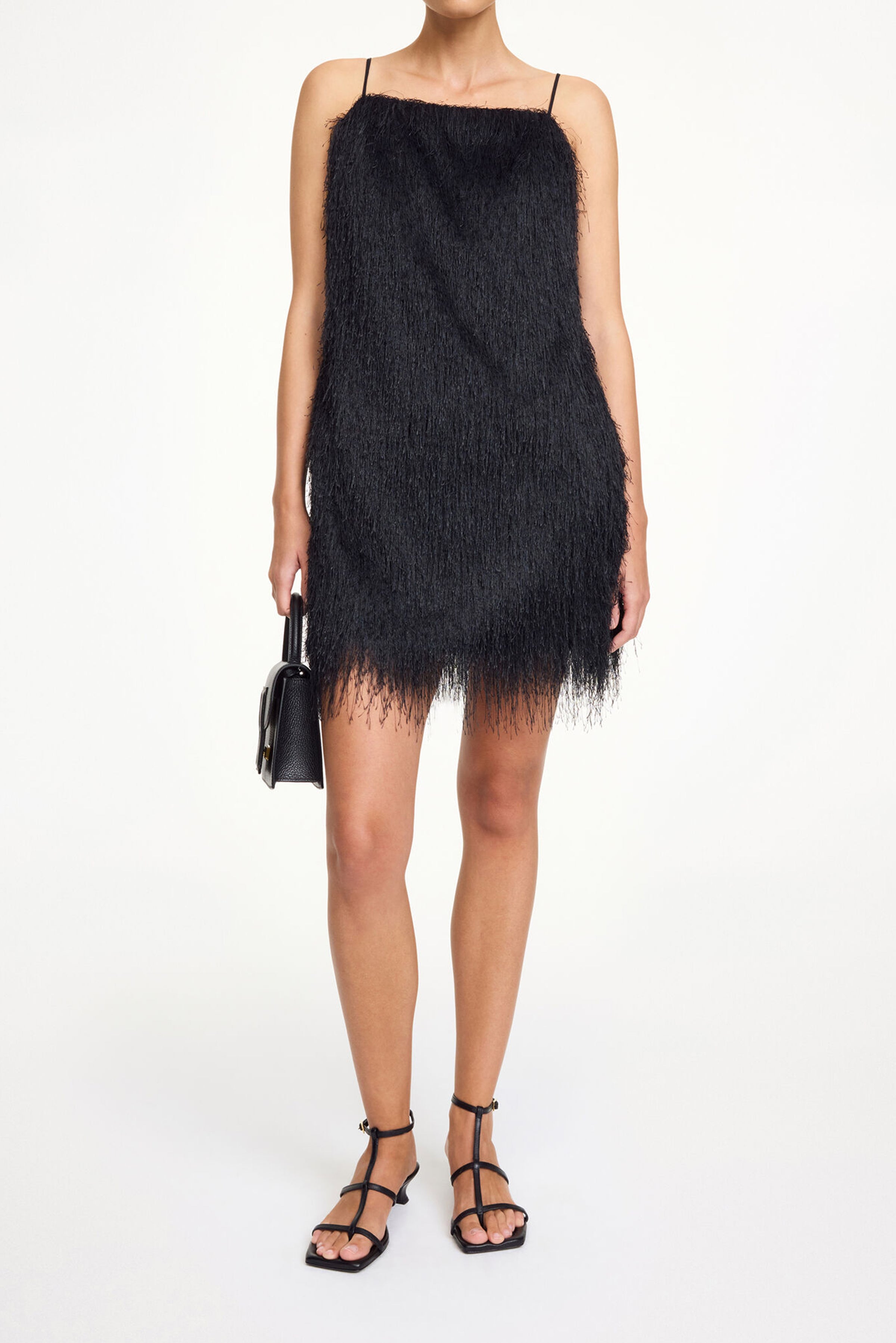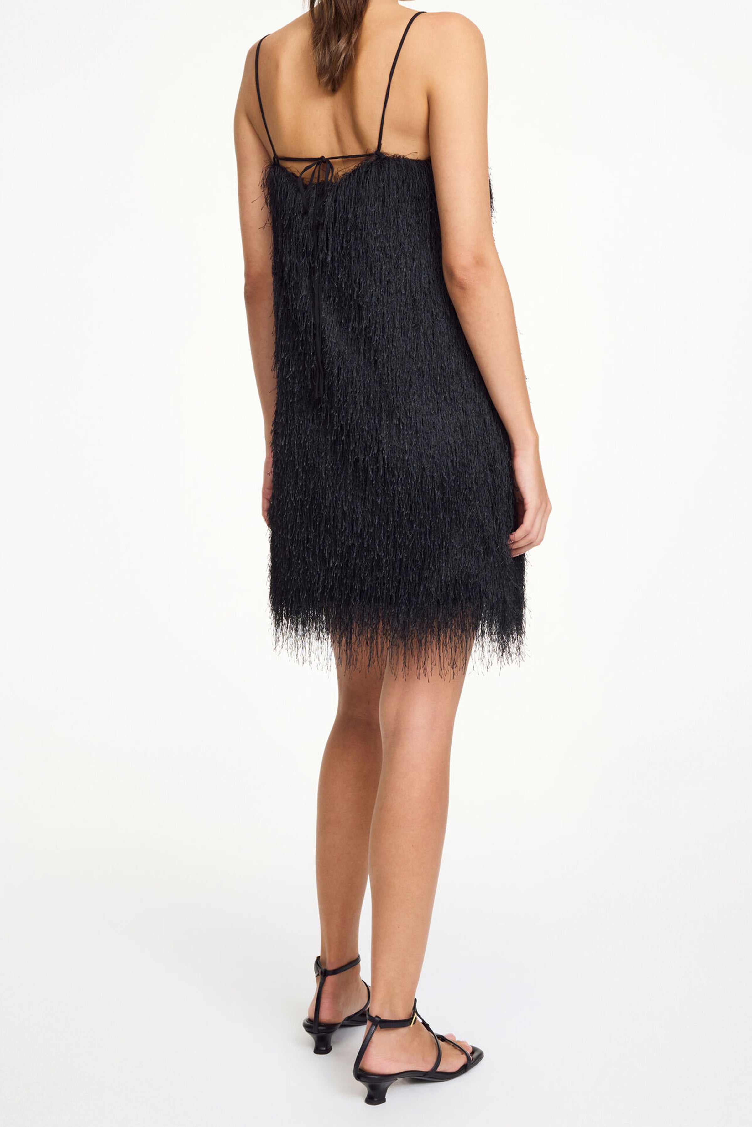 The Ledo dress features a simple straight neckline and a fully lined mini length with fringes that move as you walk.