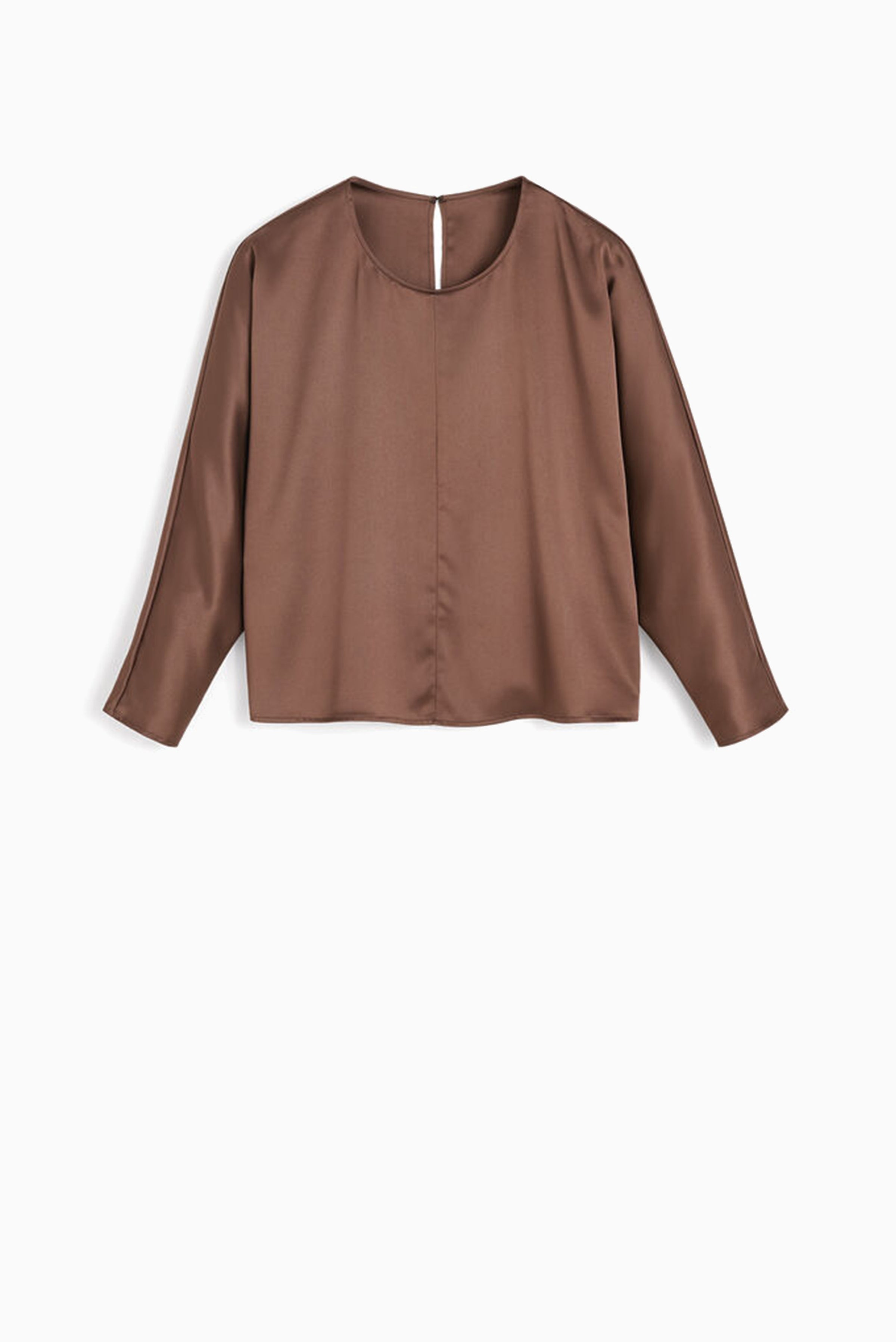 The By Malene Birger Odelleys blouse features a straight cut, tapered long sleeves, a U-neckline, and a back button closure.