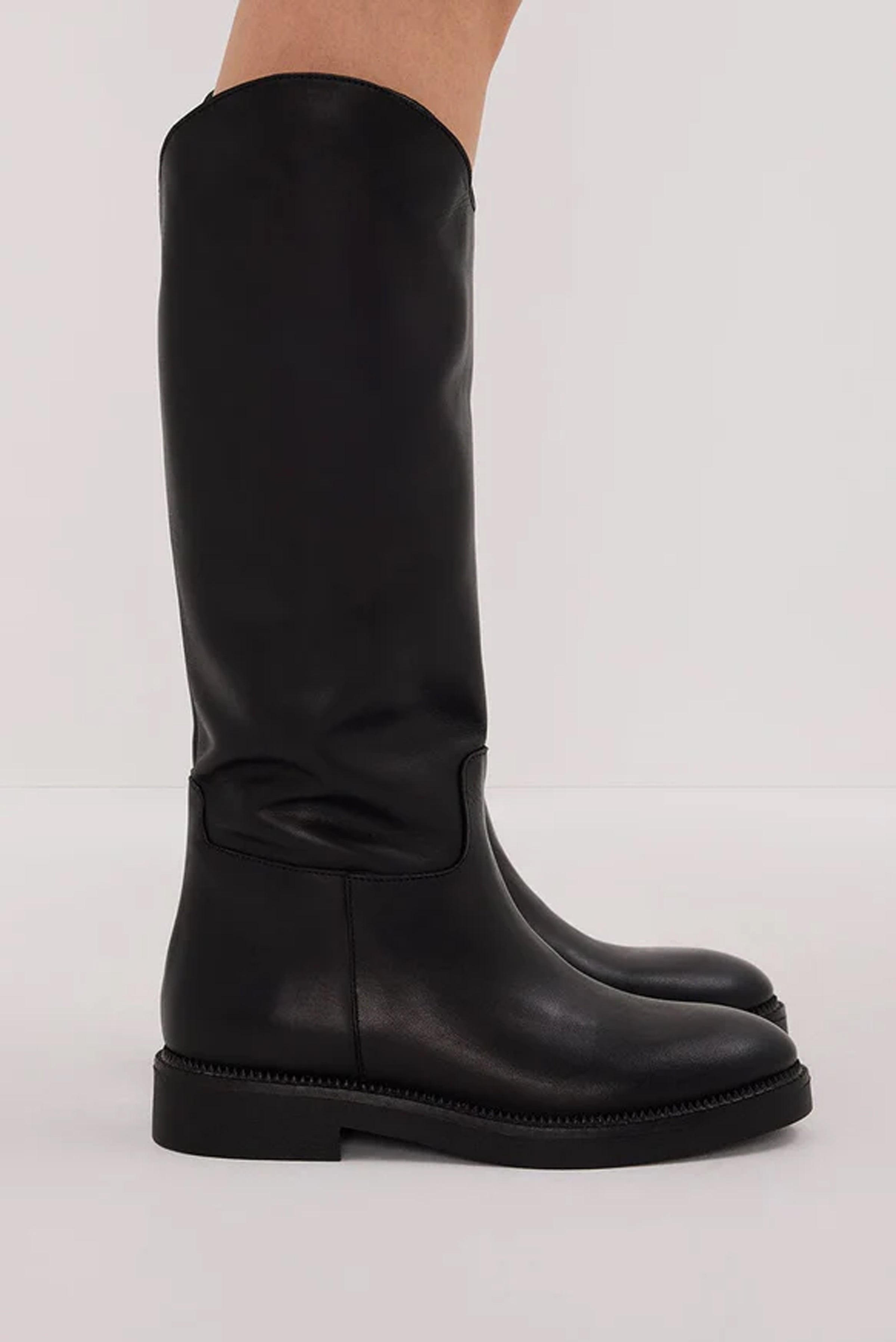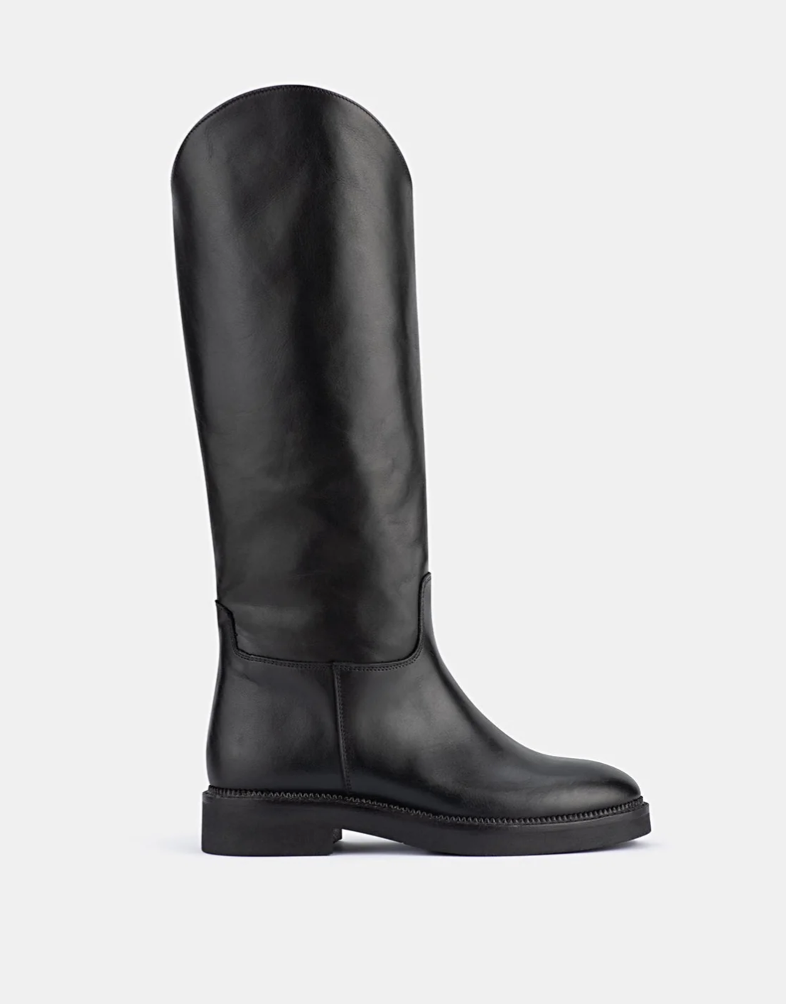 Wide-leg black leather boot with a round toe and pull-on design. Leather lining and durable rubber sole.