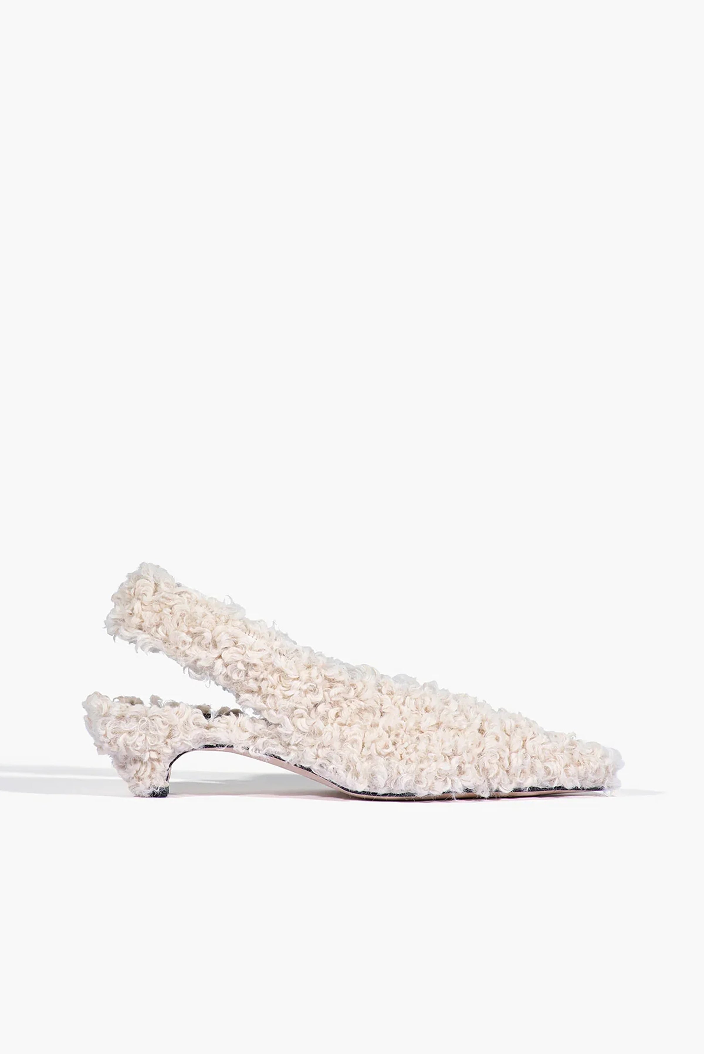The Tory Heels are a modern interpretation of a classic pump, with bold slingback straps and a low heel. Imagined in a cream shearling fabrication, Tory offers a distinctive point of interest to a minimalist outfit.