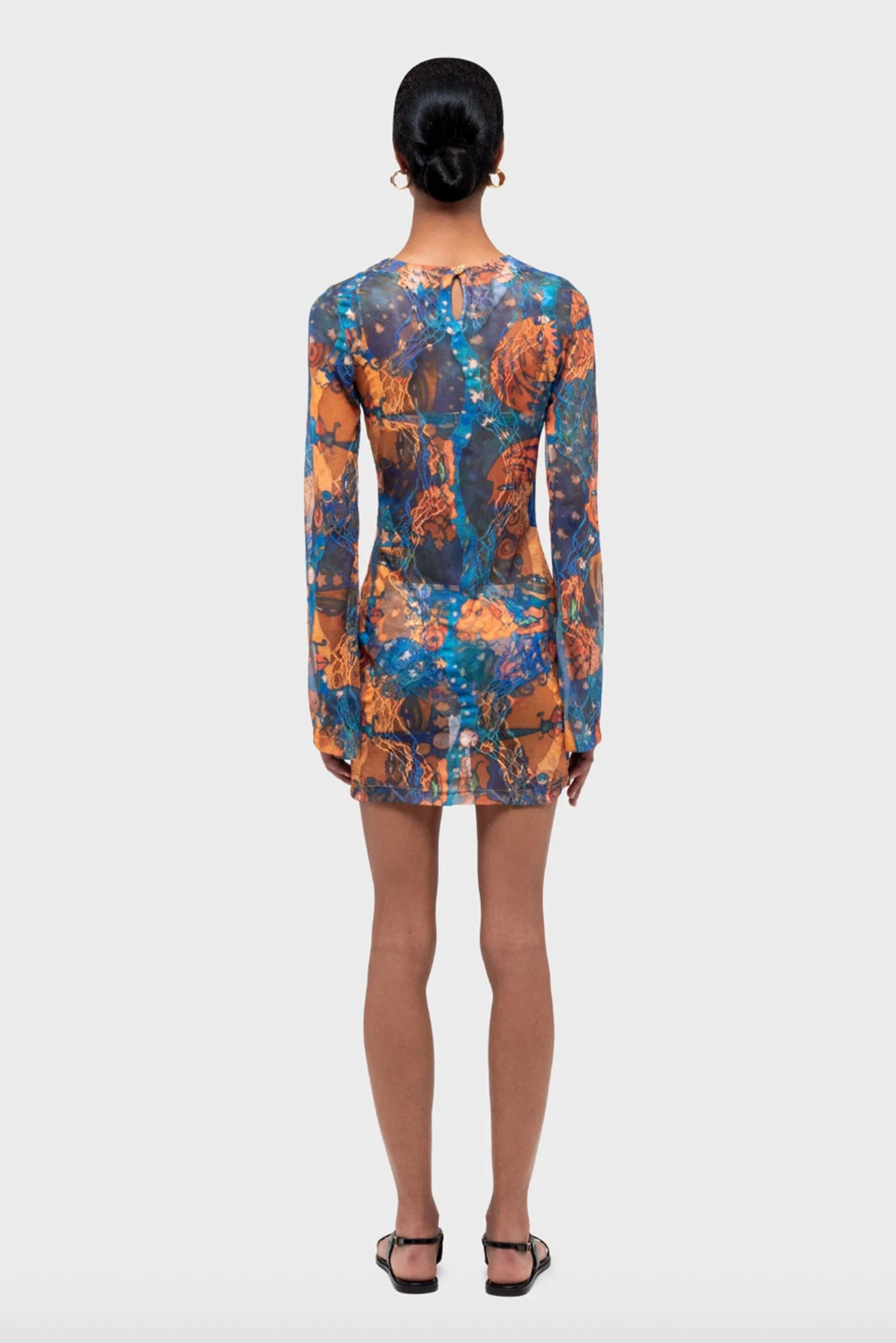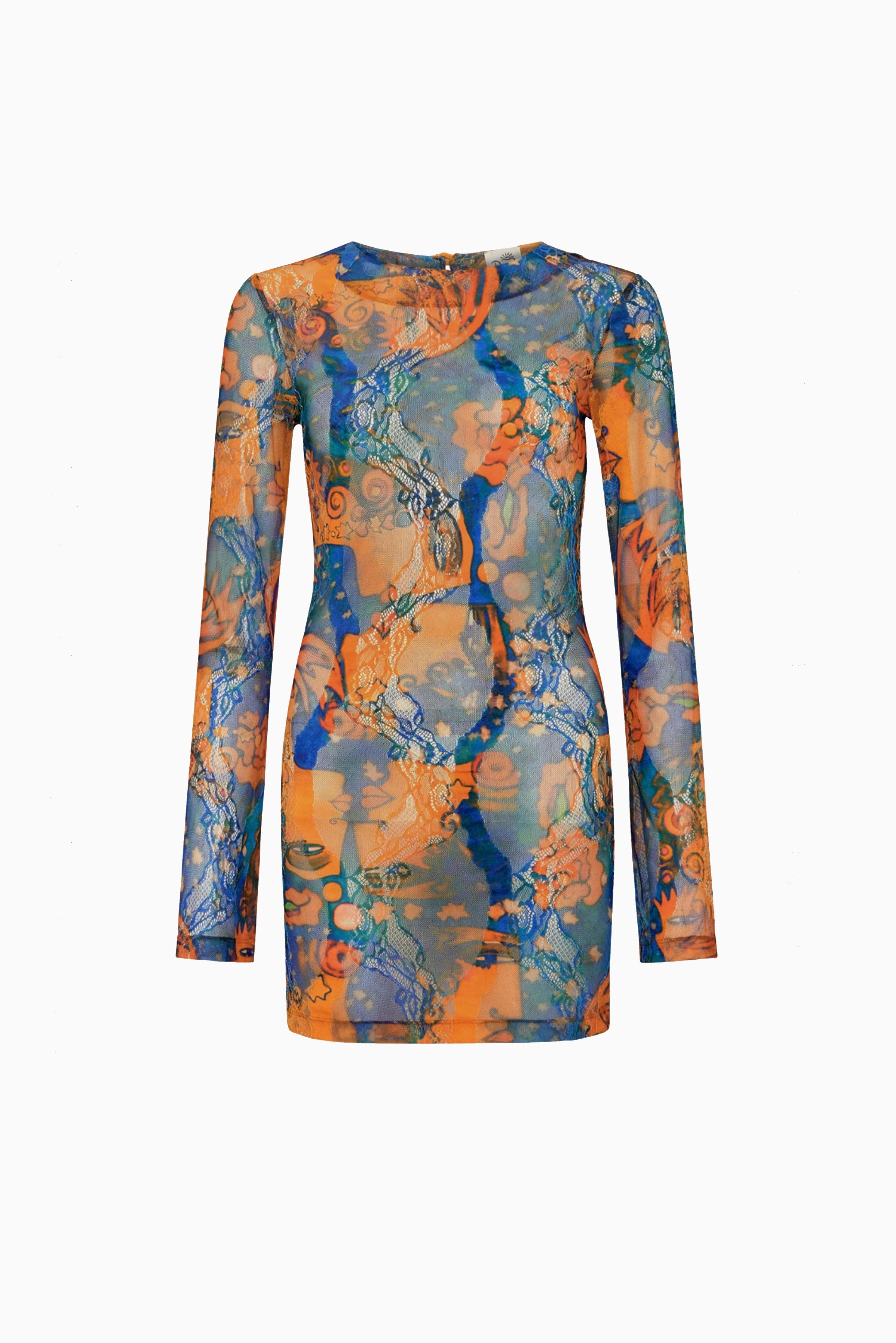 This body-con lace mini dress features our abstract El Beso print, inspired by Lovers Kissing, the iconic painting by Esteban’s father, Colombian artist Valentino Cortazar. Designed with long sleeves, a round neckline, and a keyhole closure at the back, this short, sultry dress is ready to dance with you.