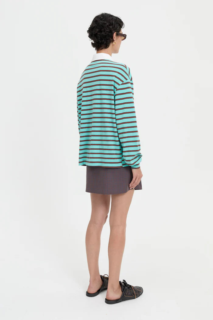 Cut from cotton in a classic blue and brown stripe, it features a contrasting white collar, partial button placket, and ribbed cuffs.Composition: 100% Cotton