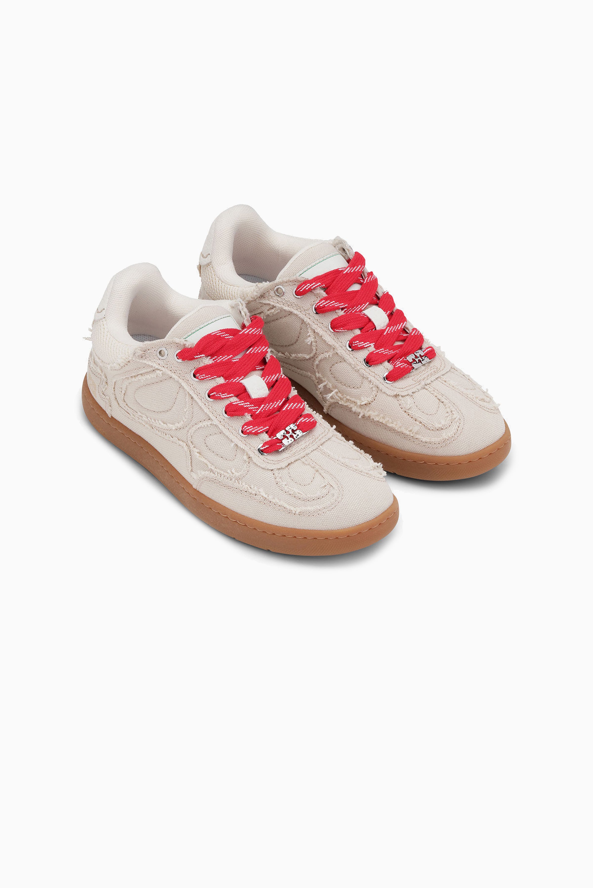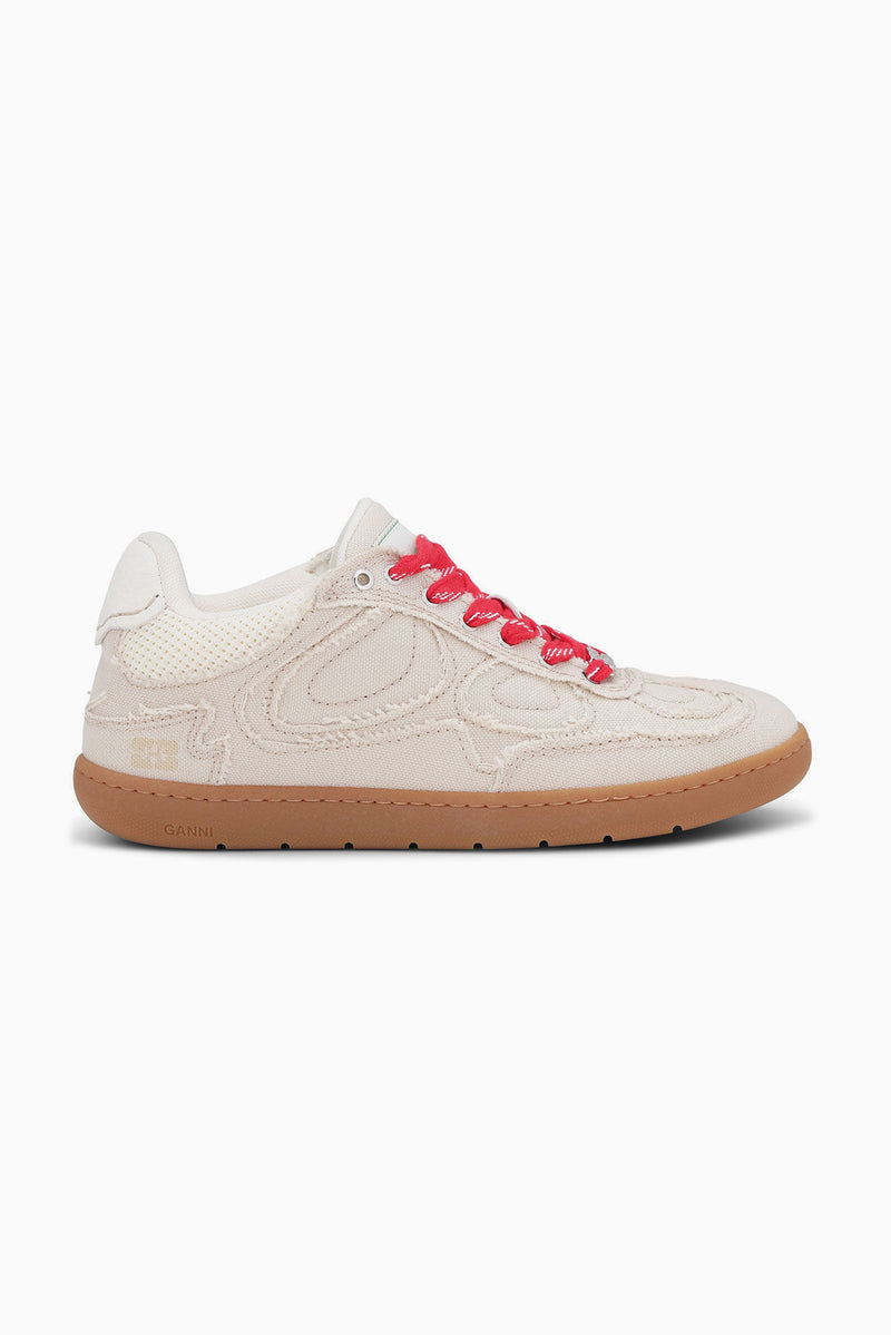 These GANNI sneakers combine sustainable materials like recycled polyester and natural latex with a stylish canvas design featuring raw edges and a hidden wedge. They offer comfort and eco-conscious craftsmanship, with a durable gum sole and breathable mesh collar.